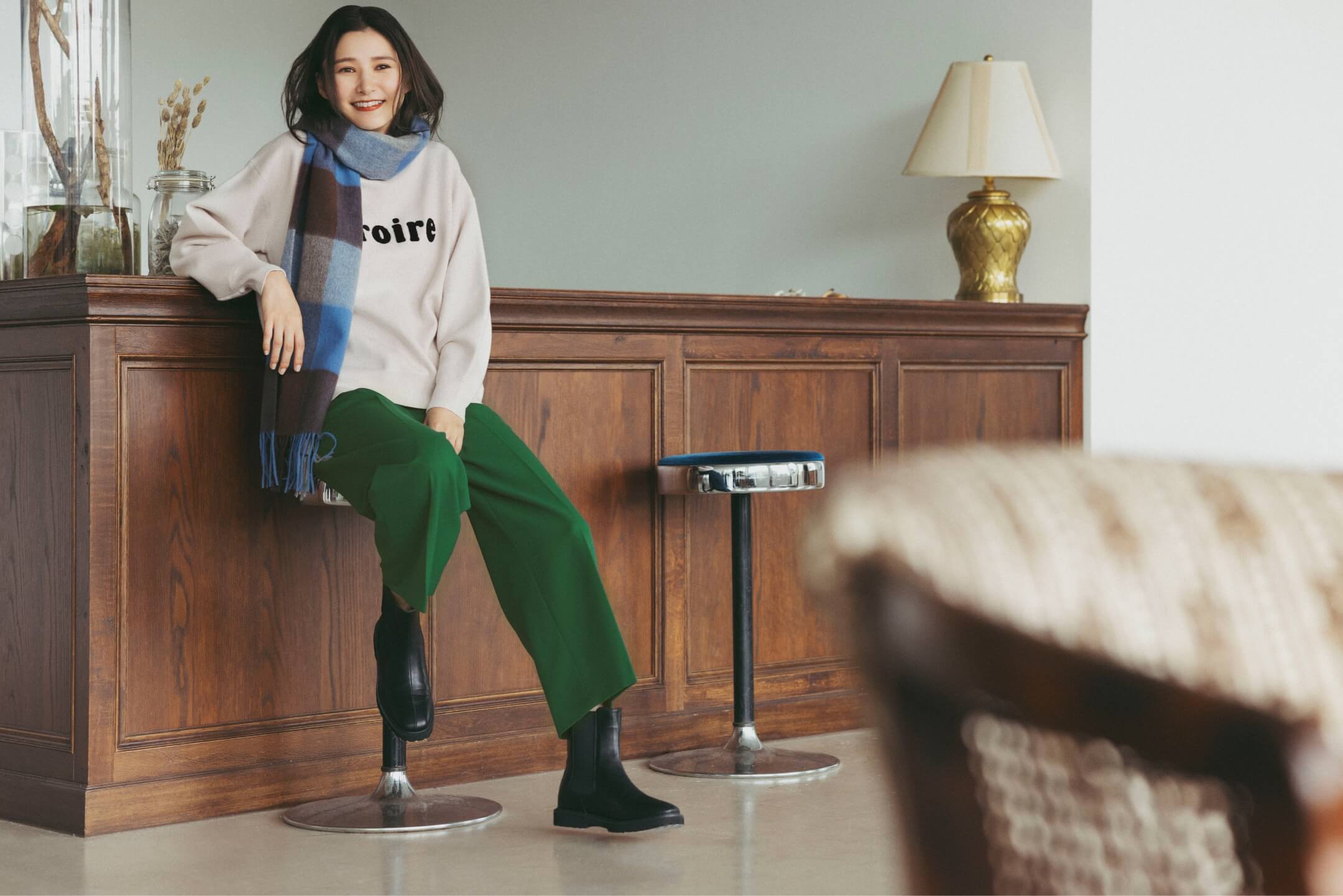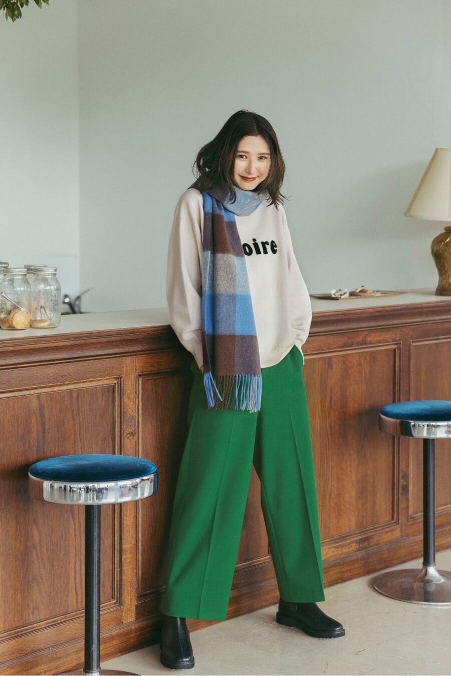 好相性。上半身はチェックストールでアクセント