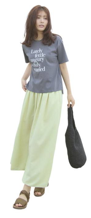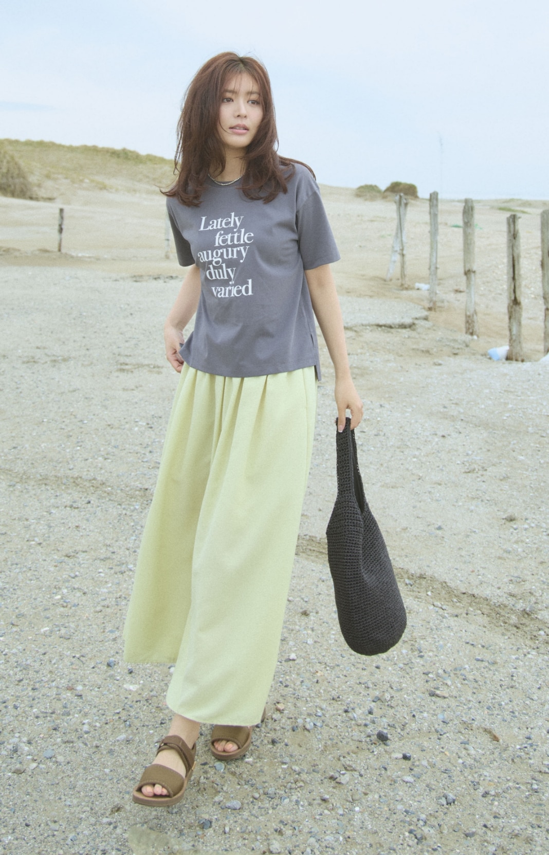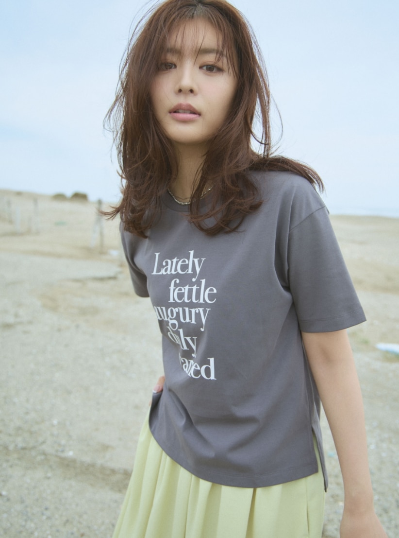 一枚でサマになるロゴTシャツは、ワンツーコーデが多くなる季節の強い味方。前後差のある着丈が、裾をアウトした着こなしのポイントに。落ち着いたチャコールグレーに白のロゴを効かせて、夏色ボトムもシックにまとめて。