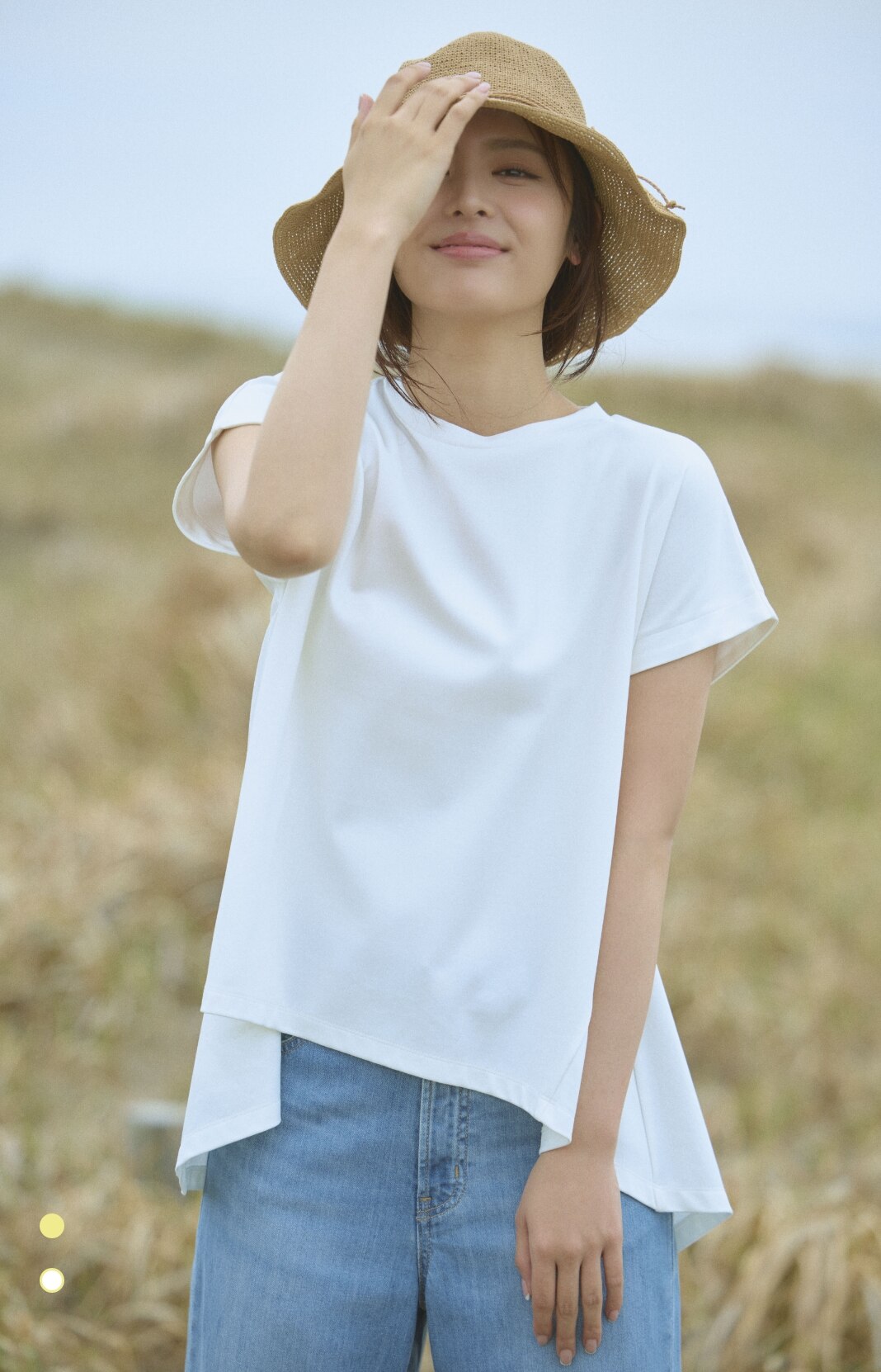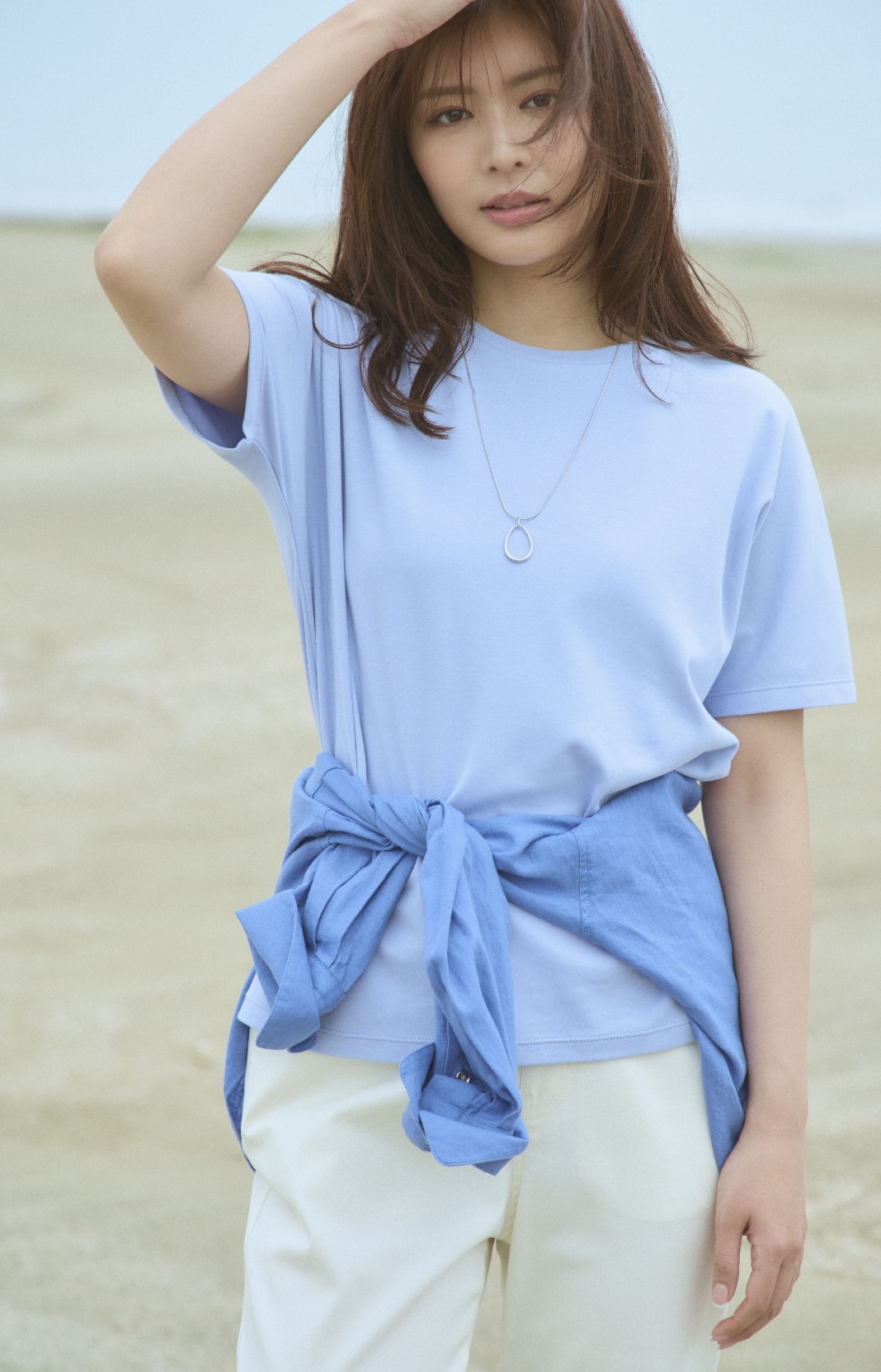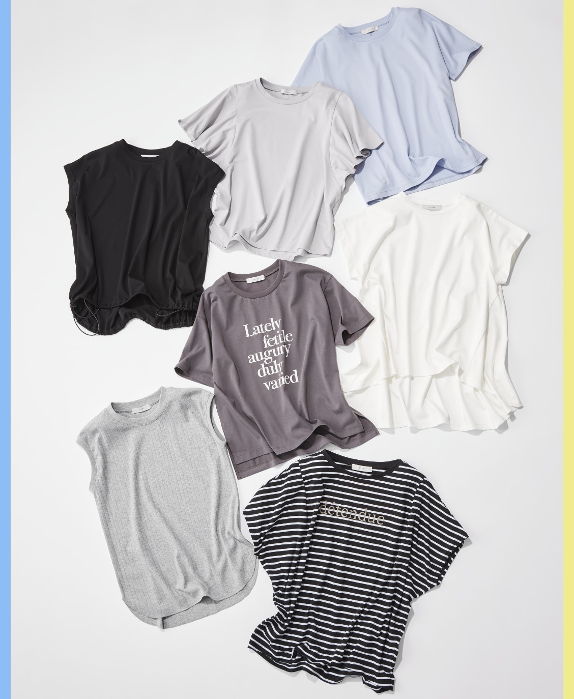 肩にタックをとった立体的なフォルムは、生地が肌にはりつきにくく、風通しよく心地よく着こなせる。定番色から夏カラーまで、ボーダーも含めた多彩なカラバリ展開。買いやすいプライスだから、色違いで集めたくなる!