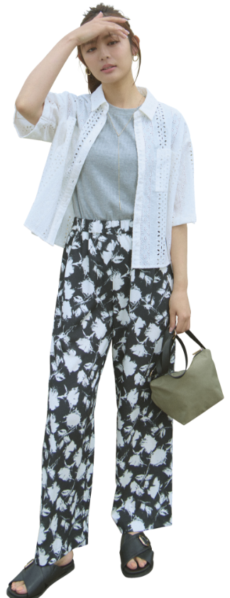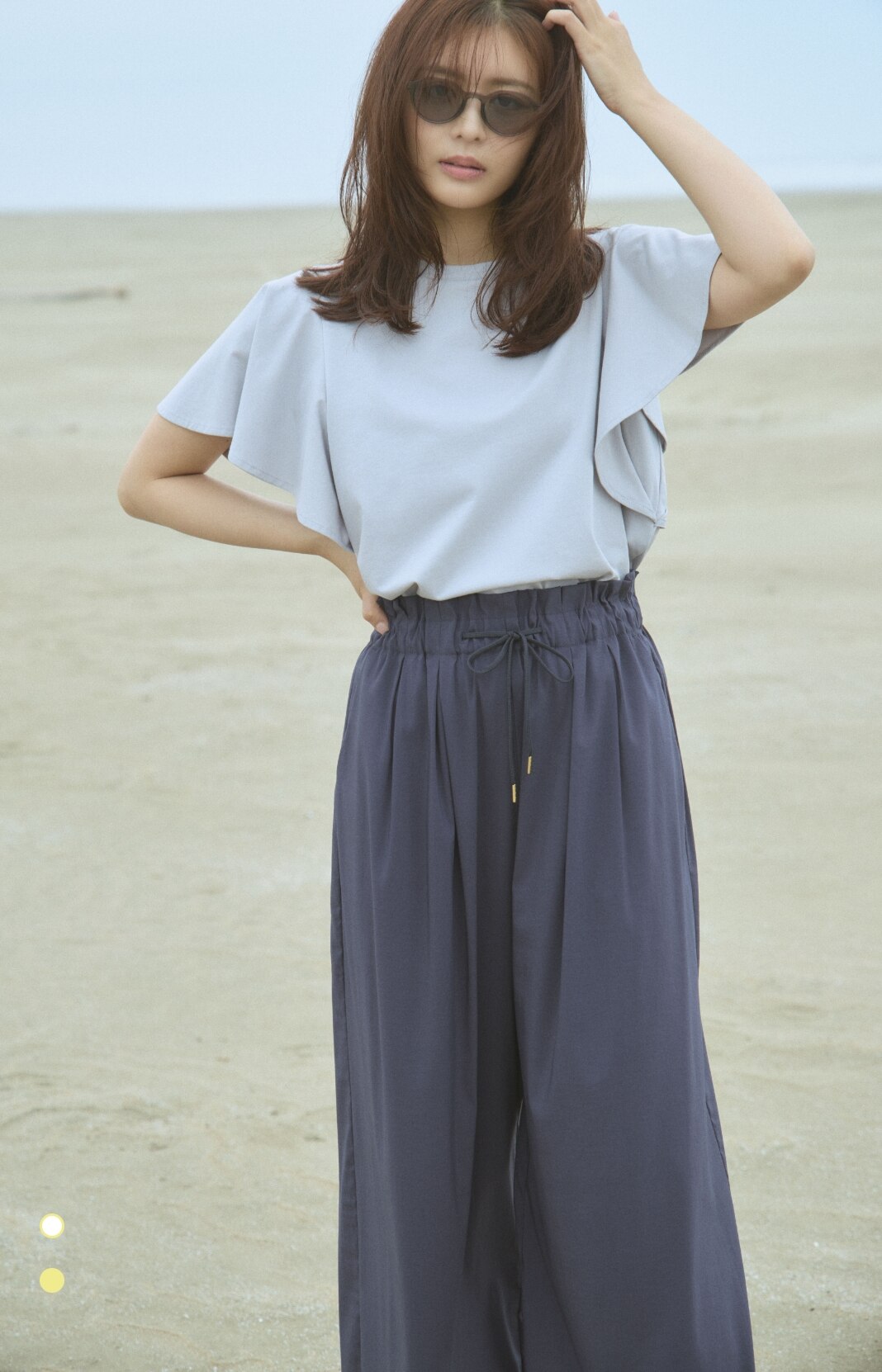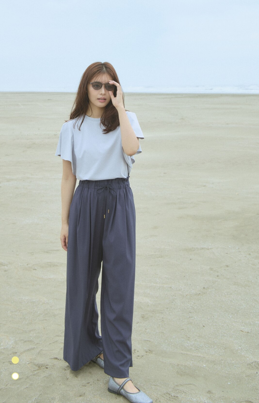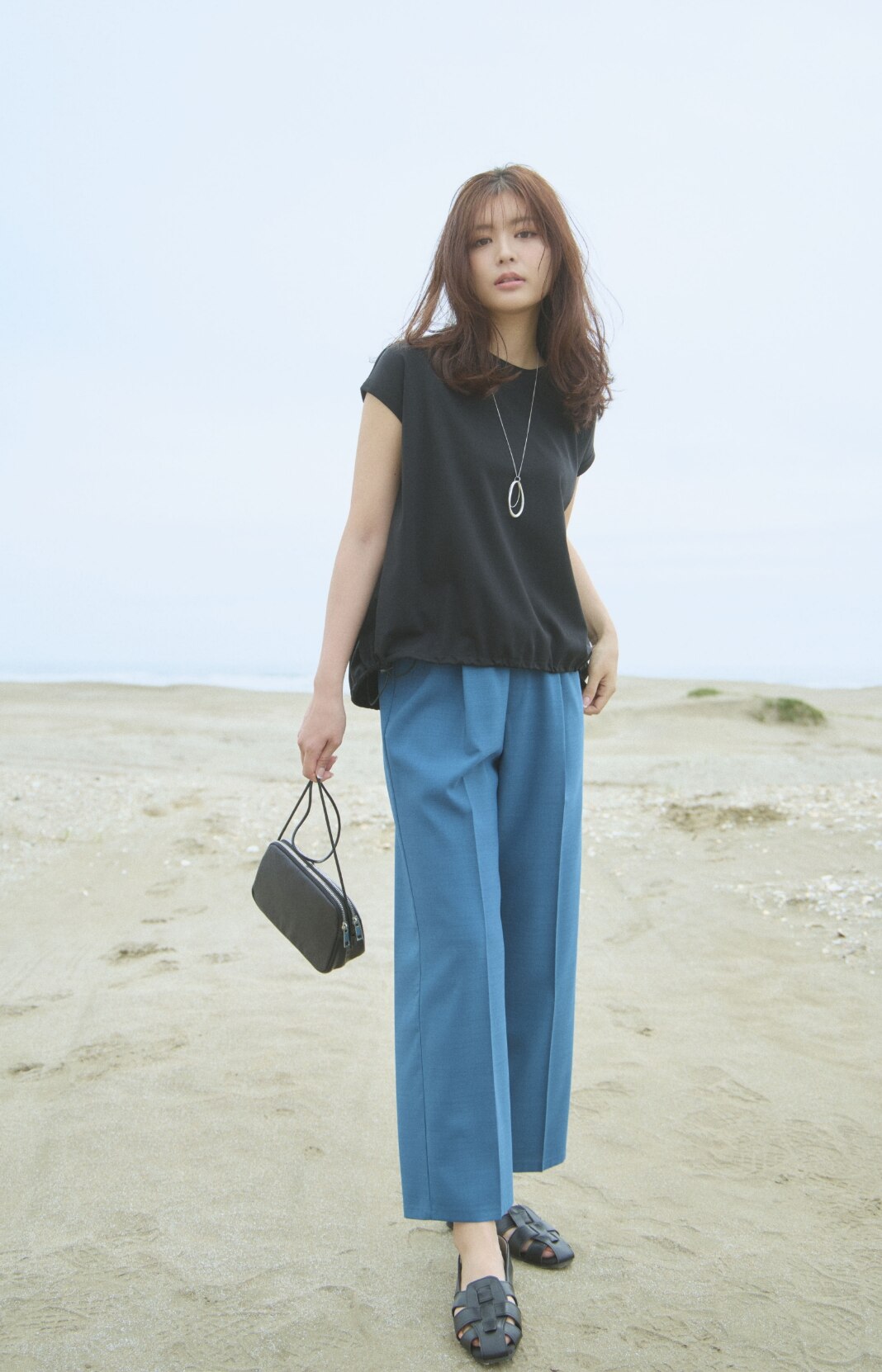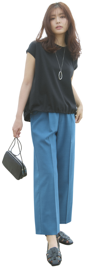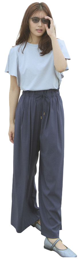 カットソーなのに、ブラウスのように華やかで上品。それは、二の腕をふんわりと覆うフレアスリーブのおかげ。リラクシーなワイドパンツもカジュアルになりすぎず、きれいめに着こなせる。
