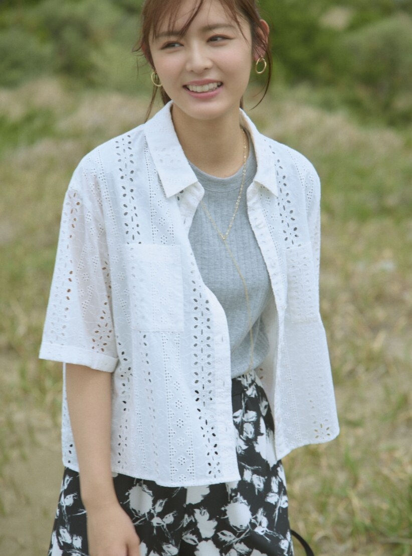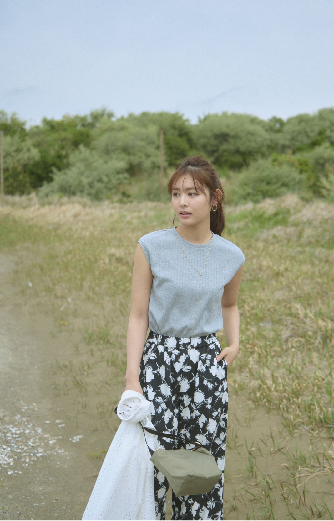 汗ジミ防止加工が施されたドライタッチな生地と肌離れのいい太めのリブで、暑い日もグレートップスを気負いなく。刺繍づかいが印象的な白シャツをさっと羽織って、今年らしい軽快な装いに。