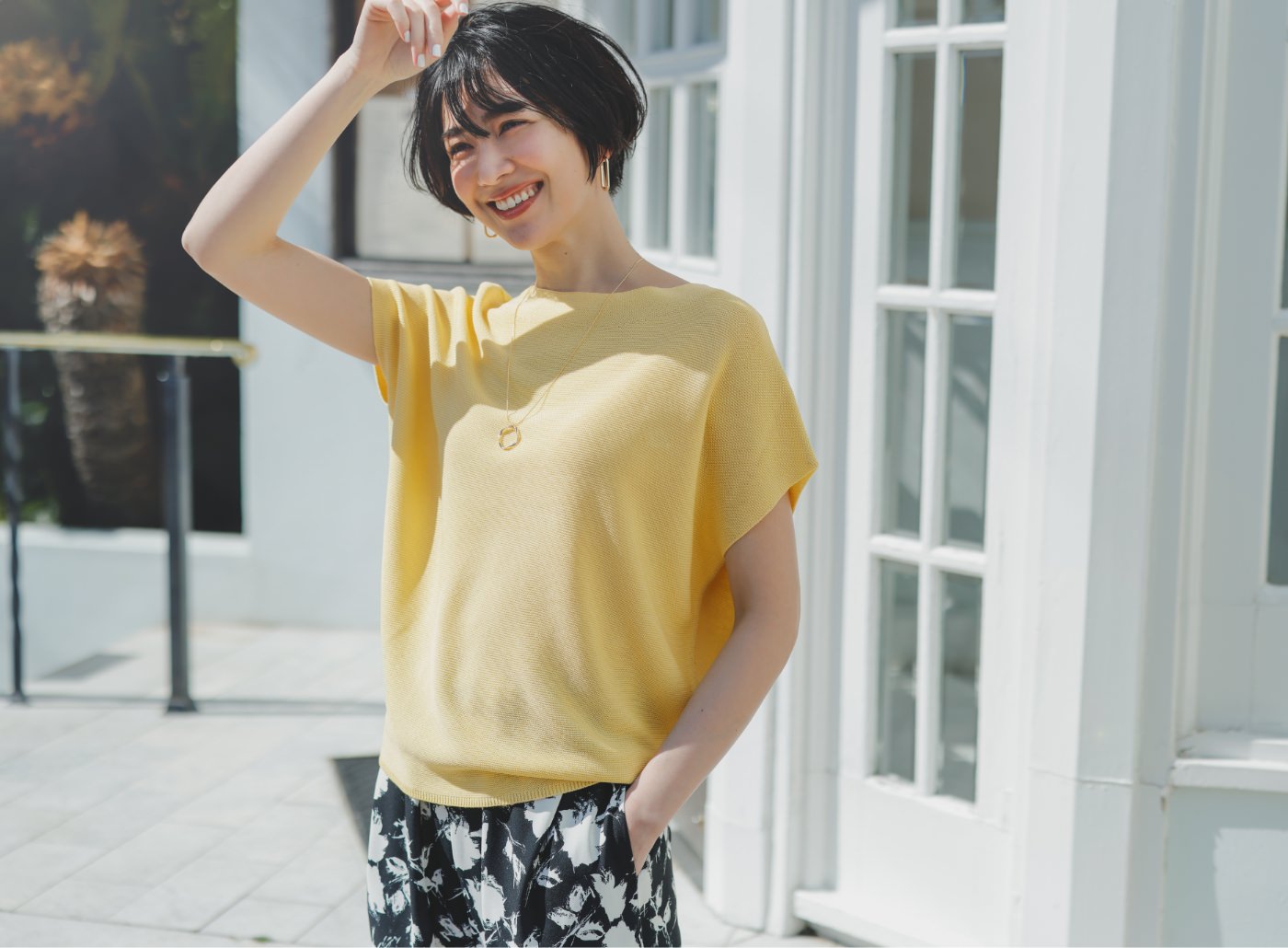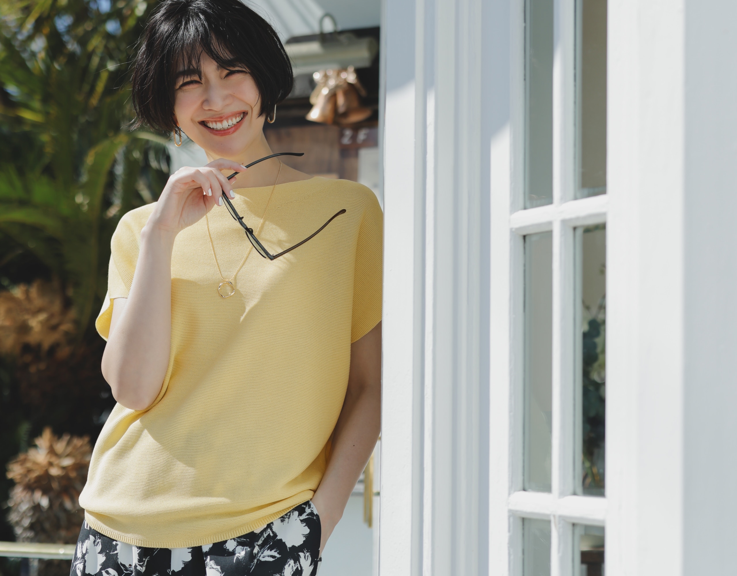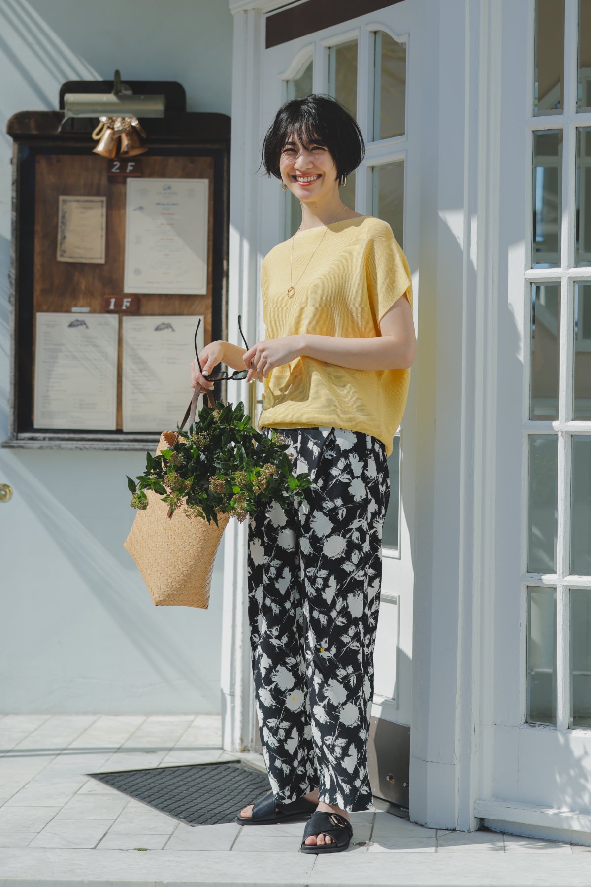 麻のような素材で季節感を演出するニットは、広めの肩巾&オフボディなシルエットで気になる体型を上手に隠す優秀品。トレンドのイエローにプリントパンツを合わせれば、パッと目を引くこなれたデイリーコーデが完成します。