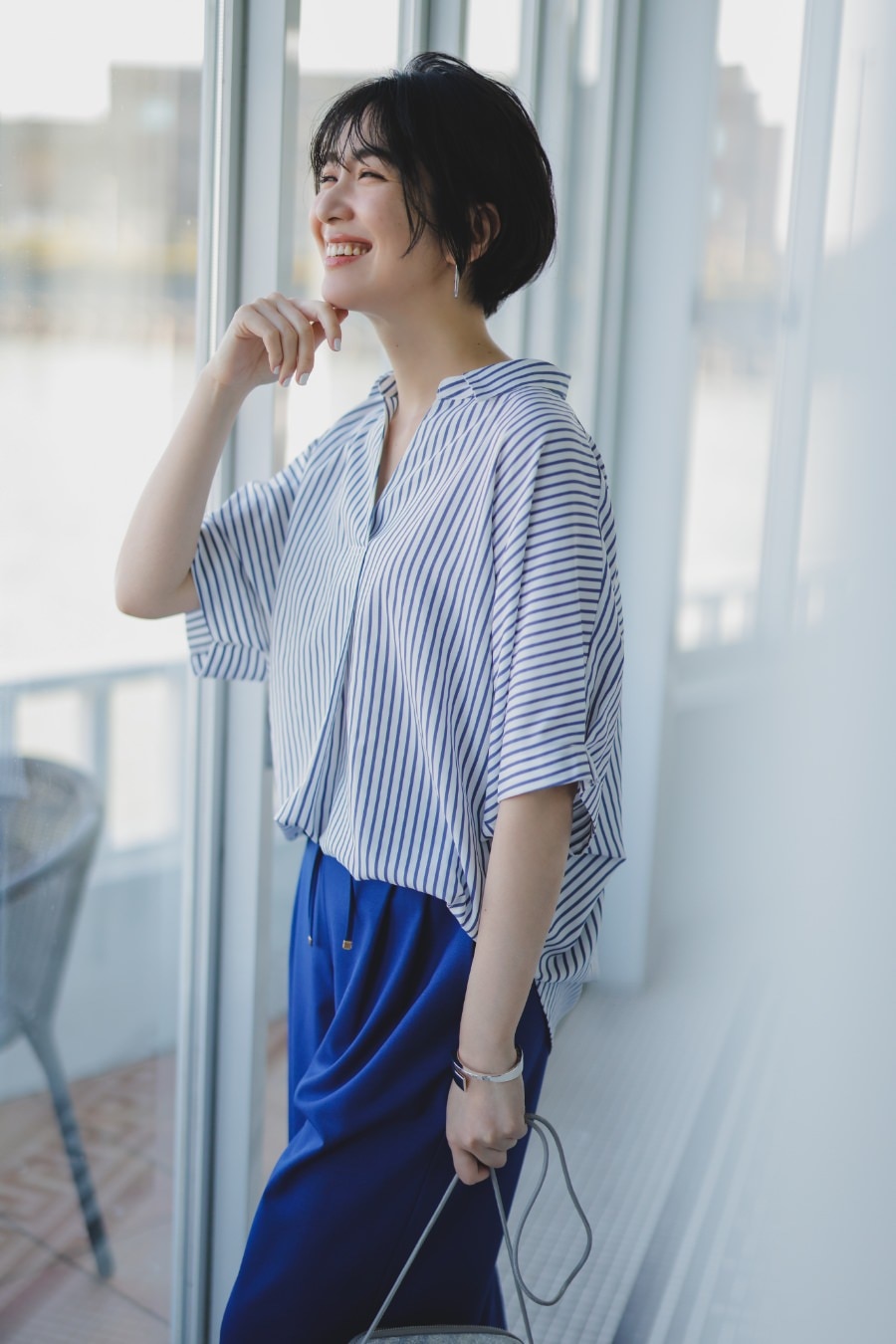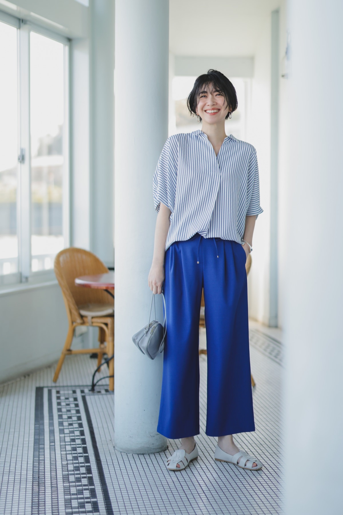袖口のタック、スキッパーデザイン、ラウンドヘムなど、瞬時に今旬が叶うブラウスが主役。自宅の洗濯機で洗ったあとノーアイロンで着用できるのも嬉しい! ボトムは美脚見えするワイドパンツでほどよくラフ仕上げに。