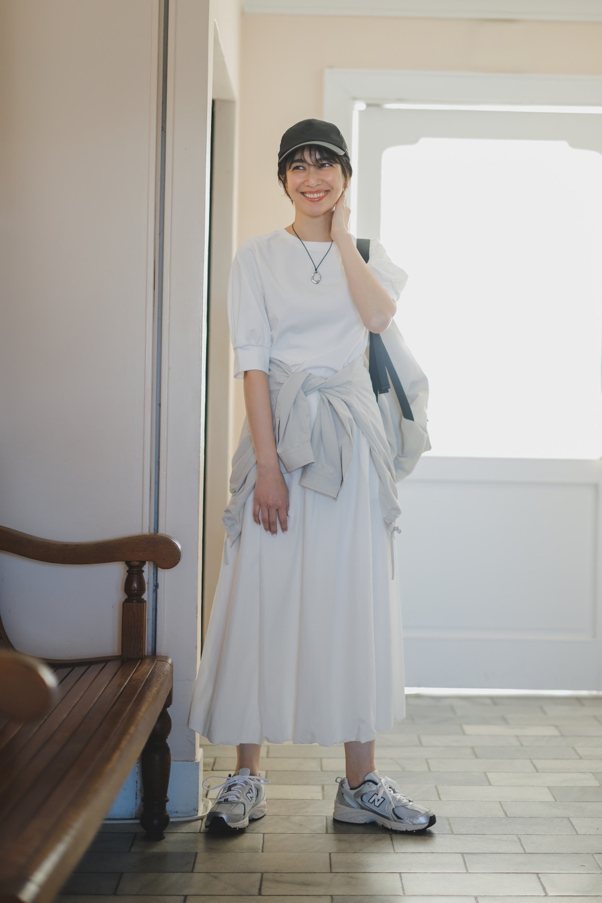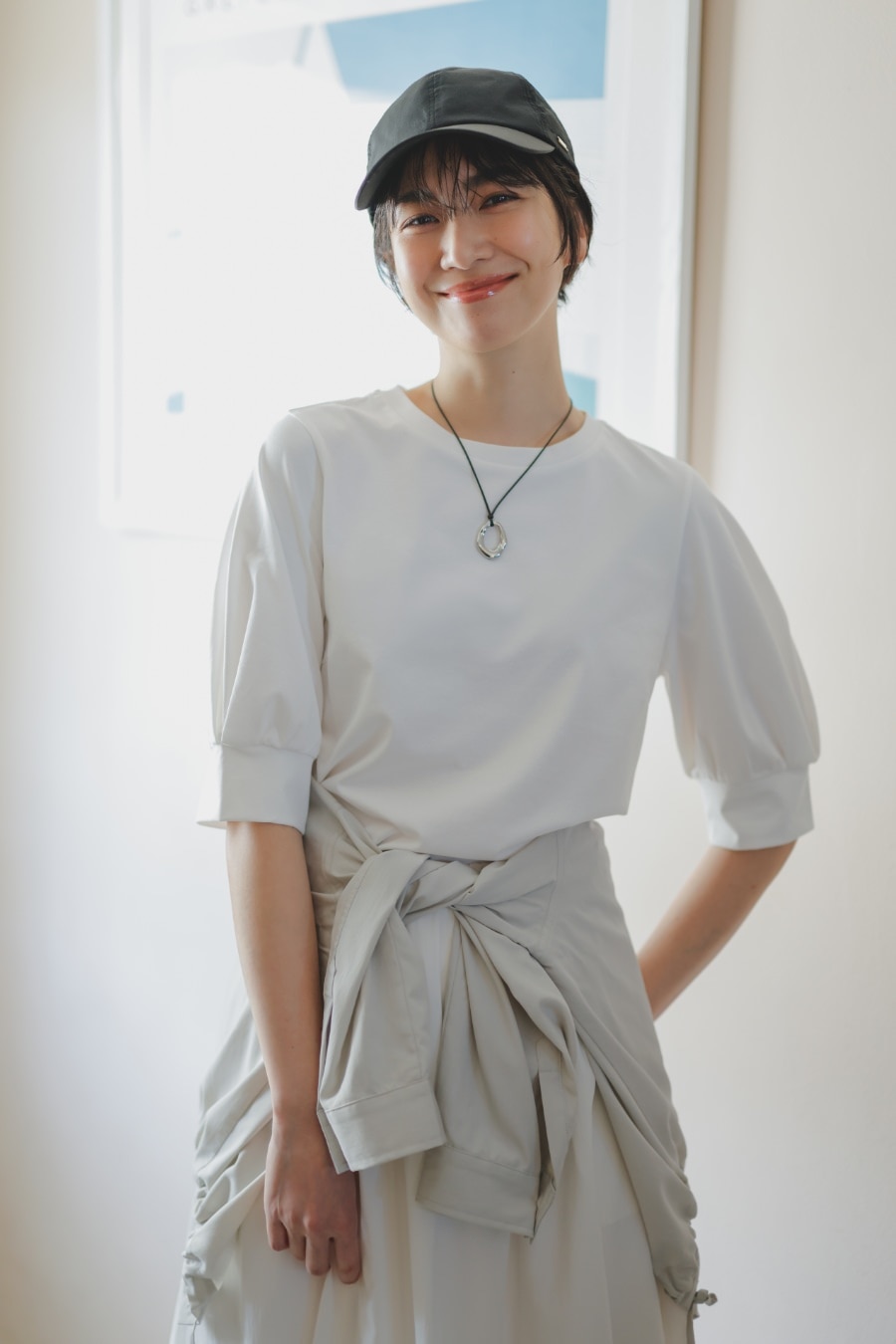 サスティナブル繊維のソロナを使ったトップスは、柔らかな感触、快適なストレッチ性など着心地を大切にした一着。パフスリーブ&コンパクトなサイズ感で印象はフェミニン。バルーンスカート合わせで自分軸のオシャレを楽しんで。