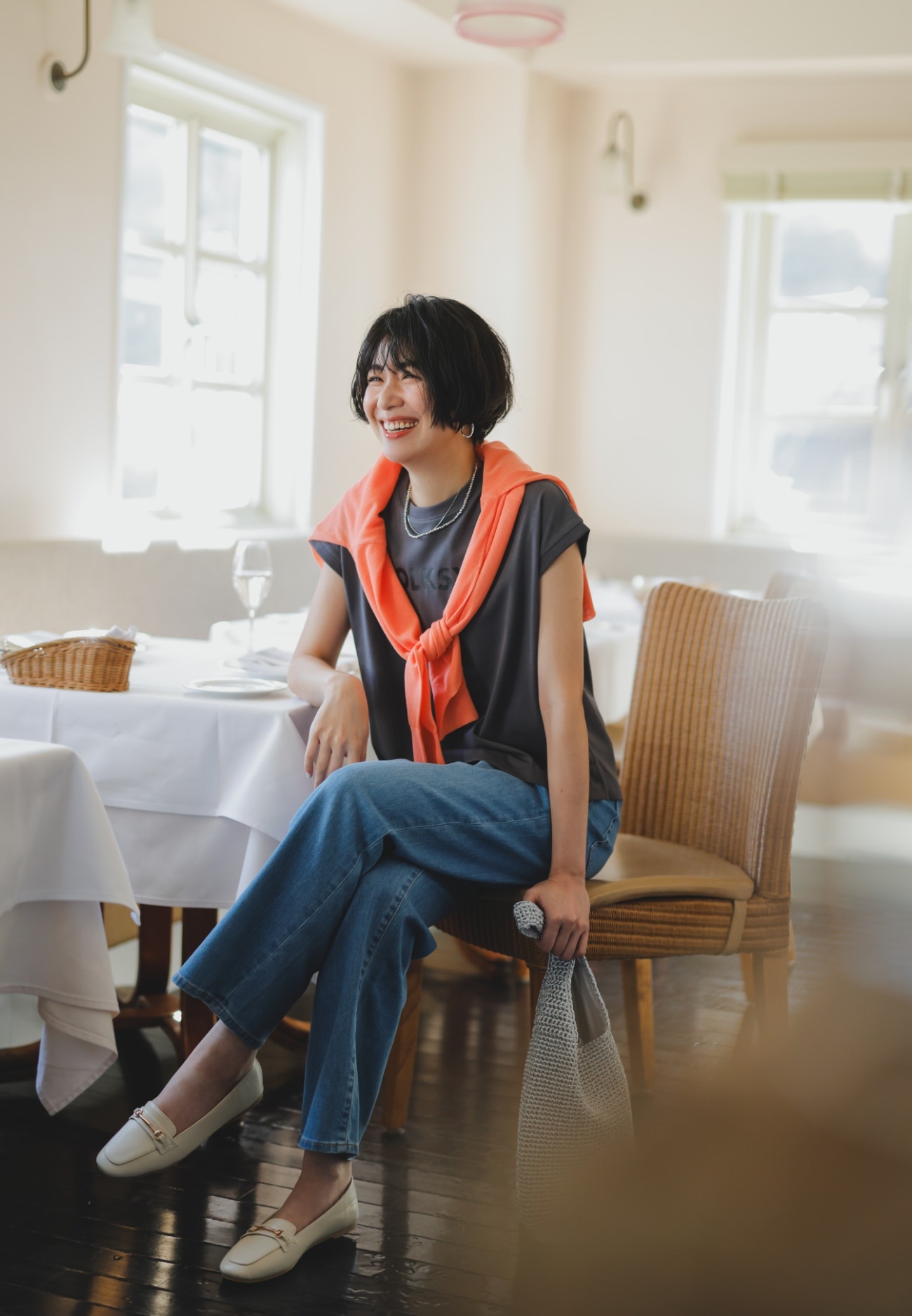 肌側にポリエステルを使用した接触冷感Tシャツ。前後差ヘム&フレンチスリーブでスタイリッシュに着られるのも魅力。胸元には今年らしいグリッターのロゴプリント入り。オレンジのシアーカーデを肩掛けして程よいアクセントに。