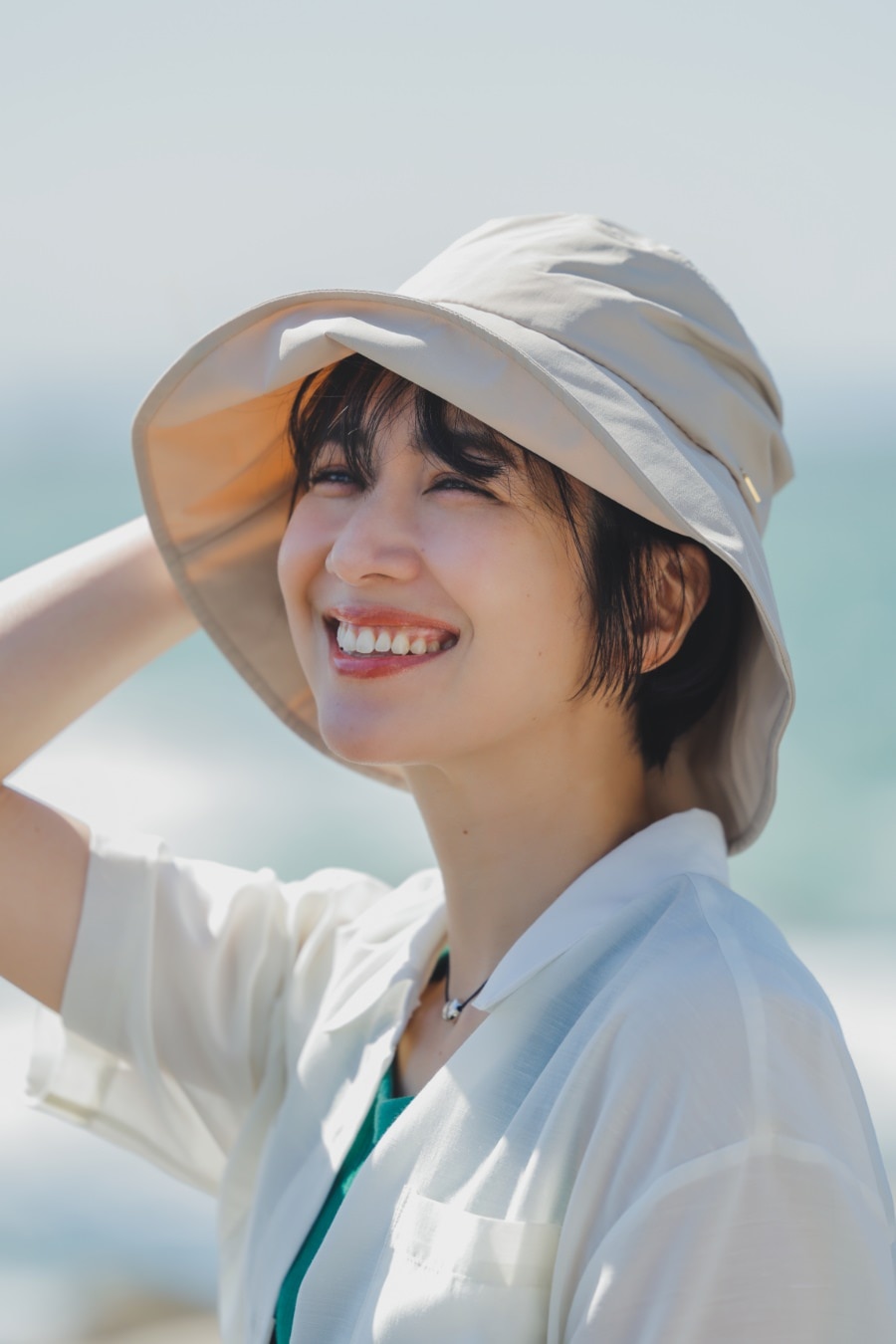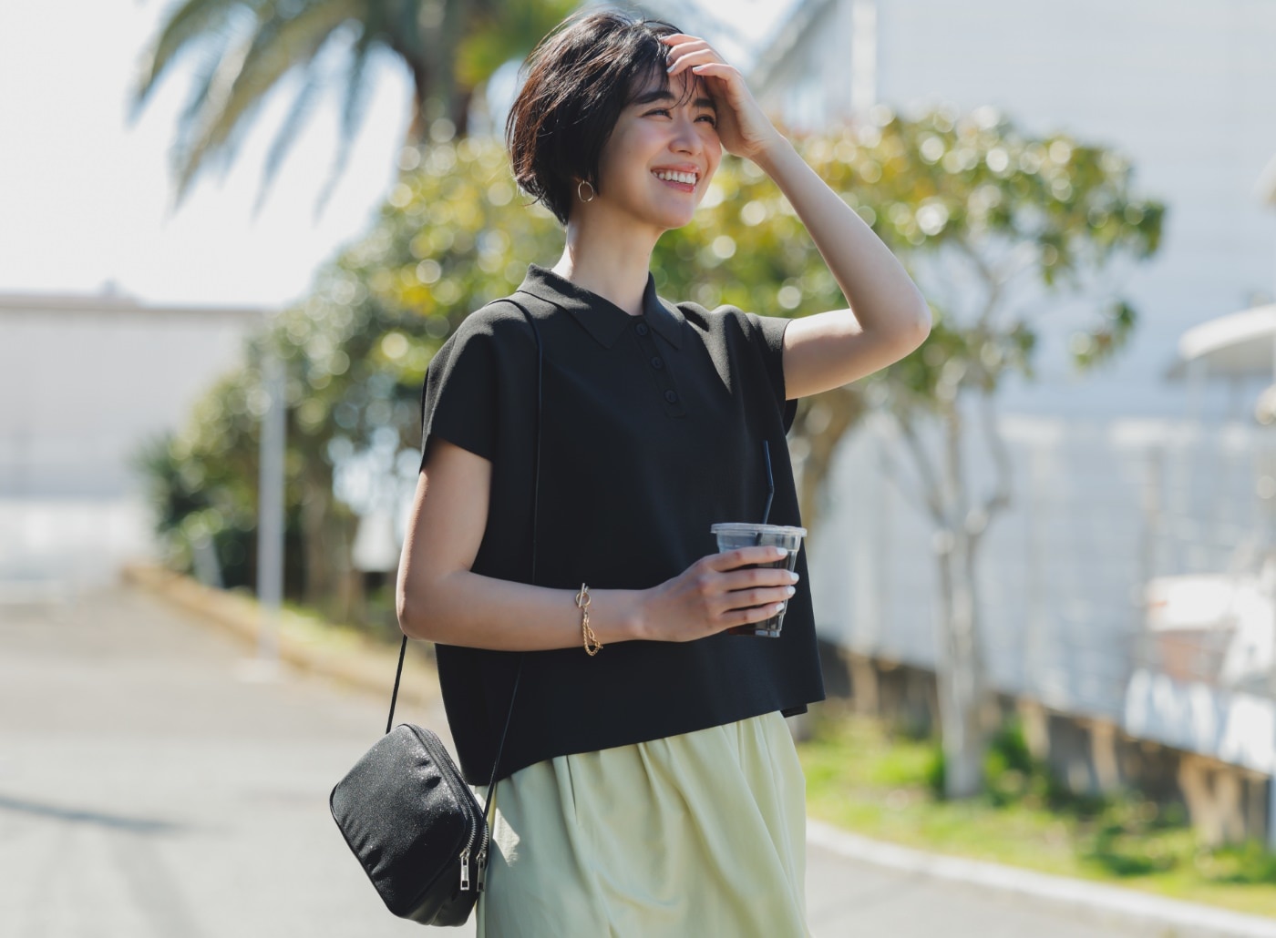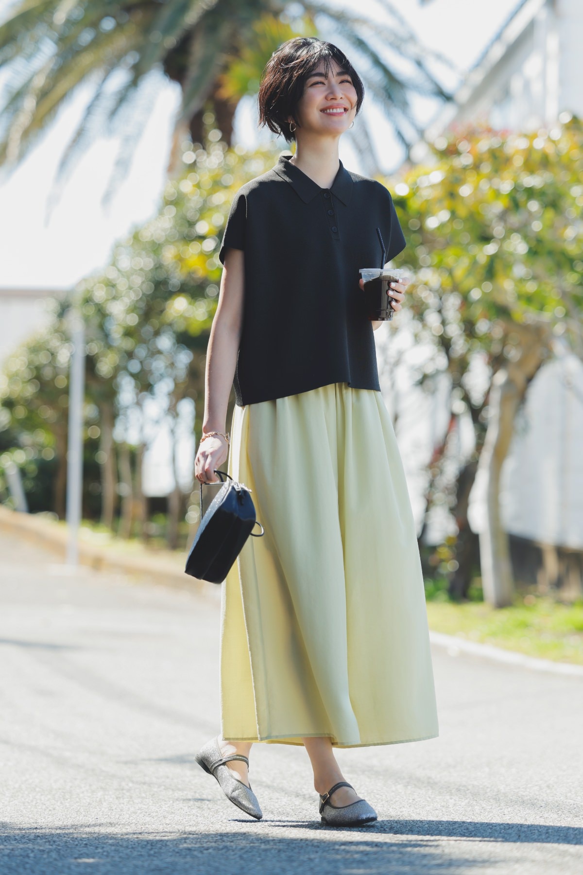 梅雨の時期に活躍する撥水機能付き。ウエストゴムのスカート見えパンツなのでらくちん&足捌きが良く、動けてサマになるのがポイント。短丈のニットポロは黒をセレクトして、お散歩スタイルに都会的なニュアンスを投入。