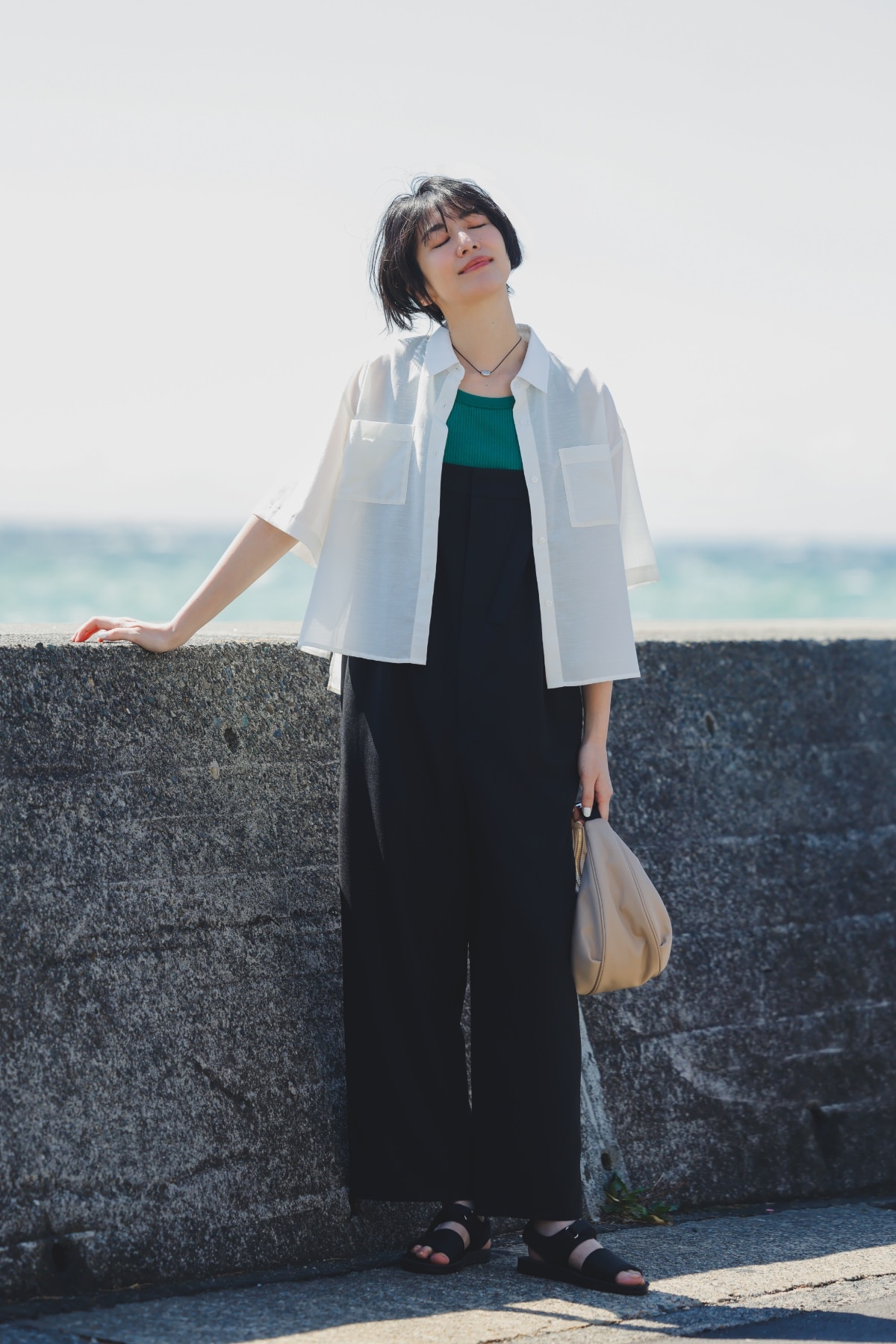 フロントのダブルタックと肩紐を垂らしたデザインが決め手の大人カジュアルなサロペット。汚れてしまっても自宅の洗濯機で洗えるのでイージーケアでOK! オフ白のシアーな麻調シャツを羽織って、爽やかにアップデートを。