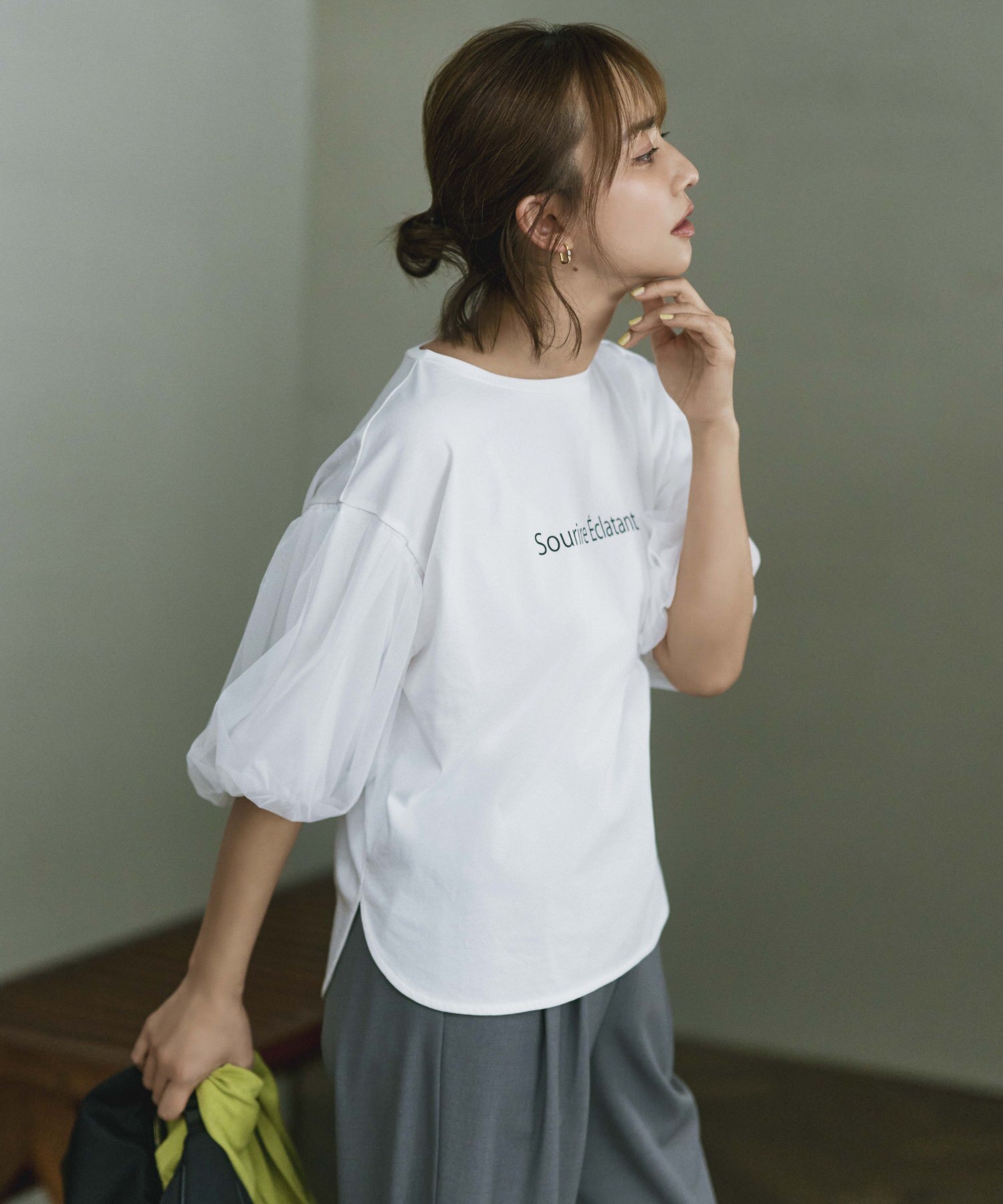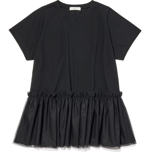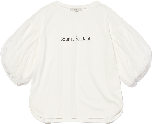 たっぷりとチュールを使ったフェミニンなボリューム袖×ワンポイントロゴのカジュアル感がグッドバランス。裾部分は丸みのあるラウンドカットと、OUTしても着やすいデザイン性が嬉しい。