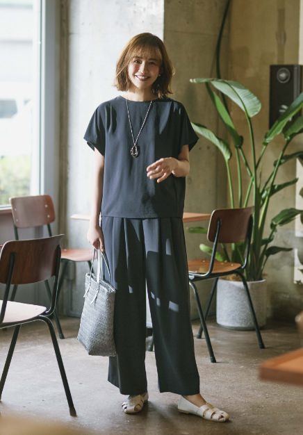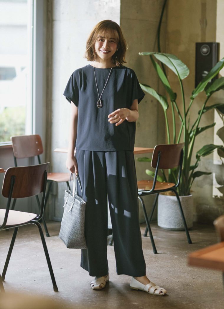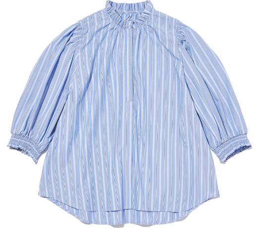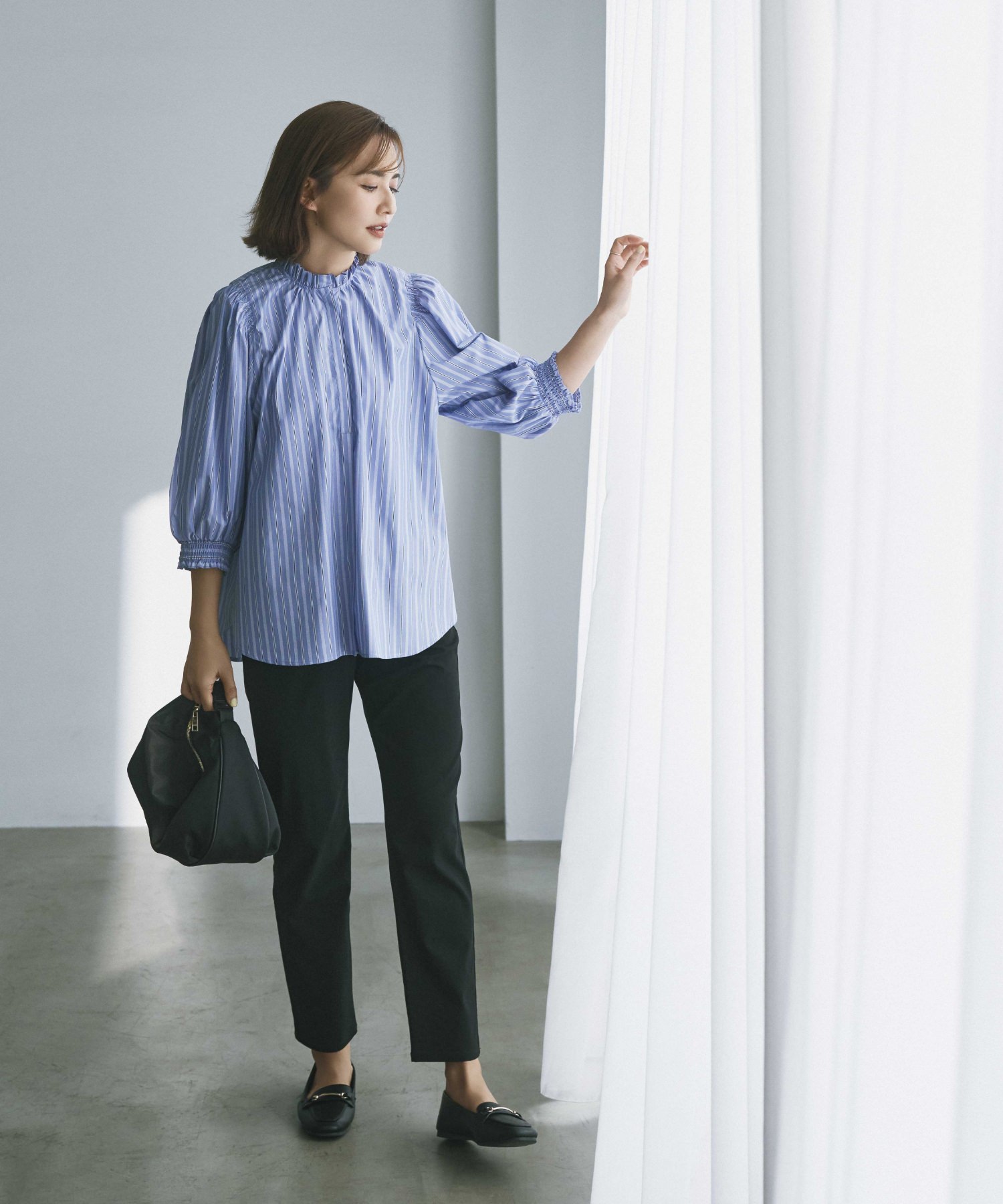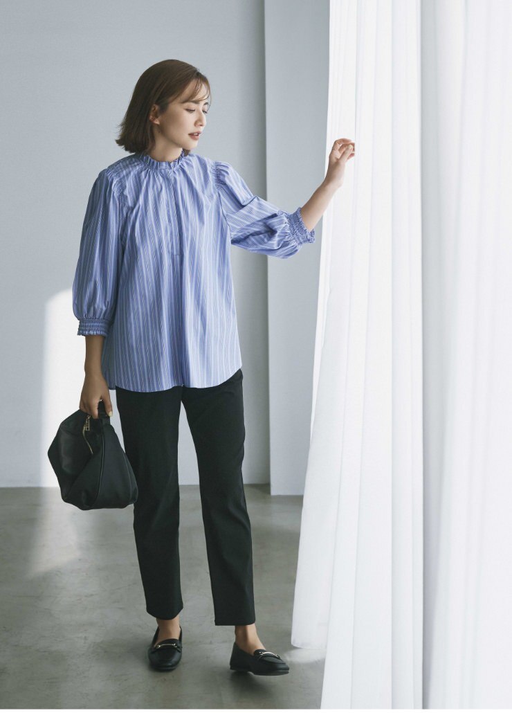 袖と首まわりがシャーリングされたフェミニンなディテール×凛としたストライプ柄が好バランス。手持ちの黒パン合わせのワンツーコーデもここまでクリーンな印象に。