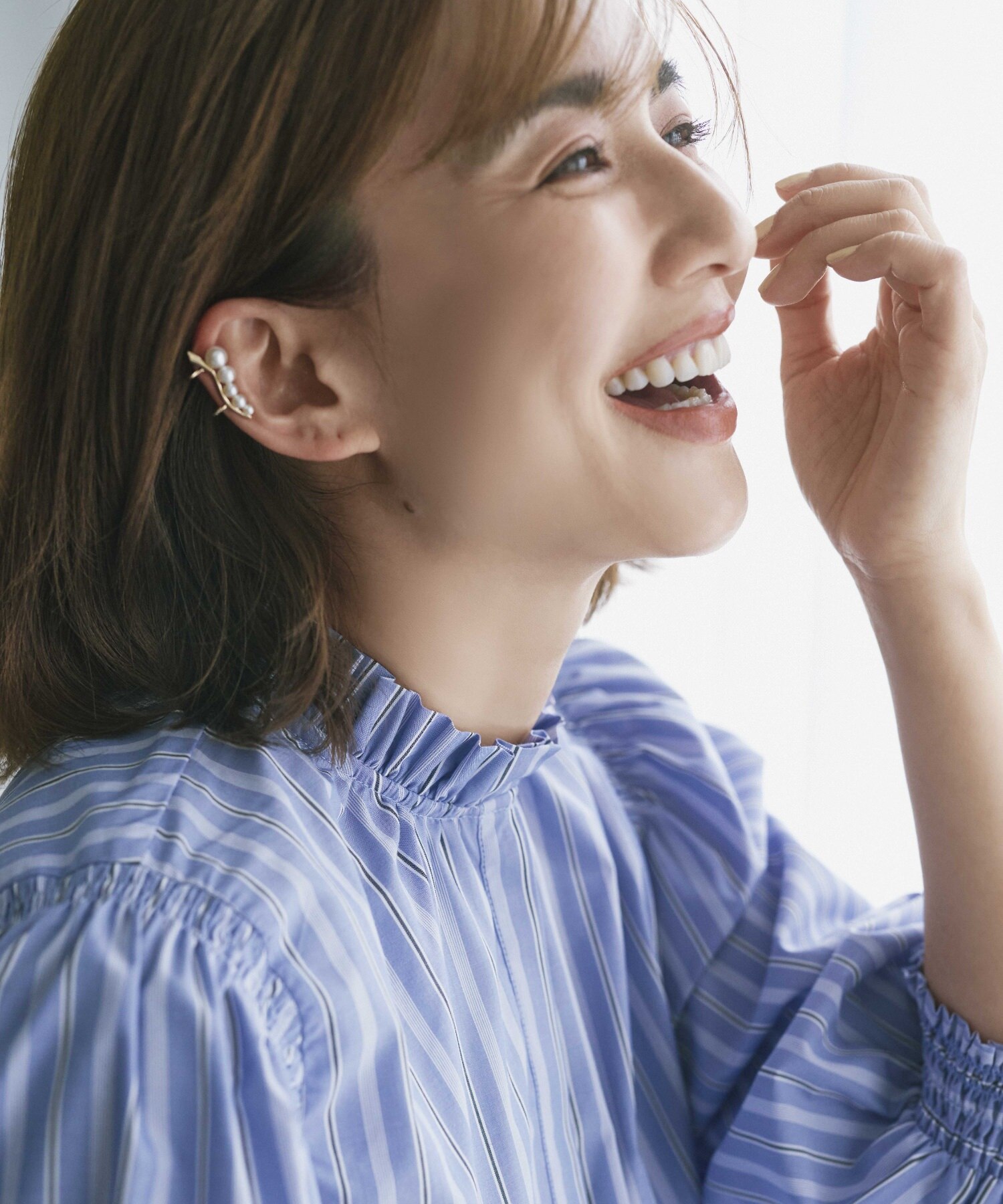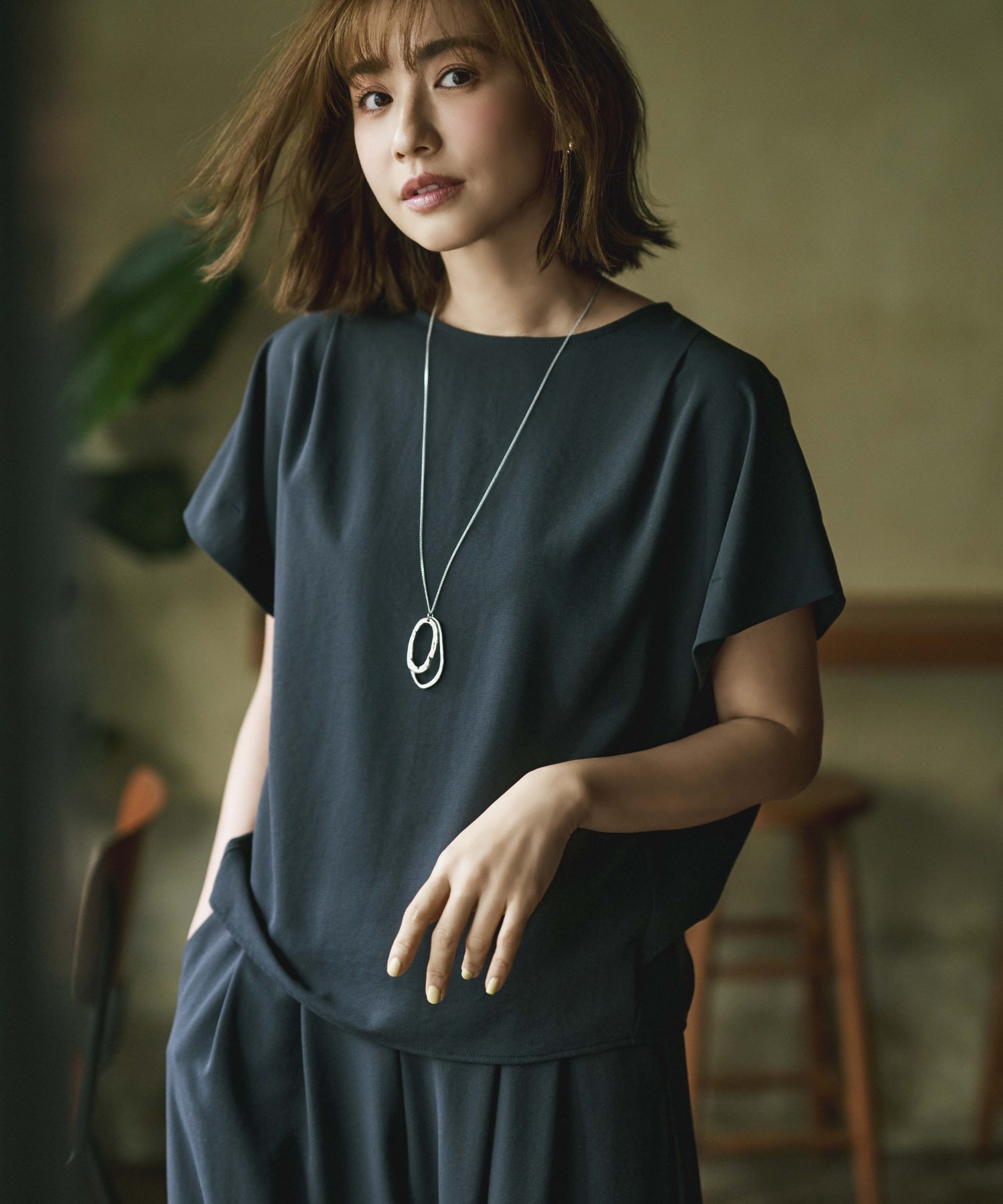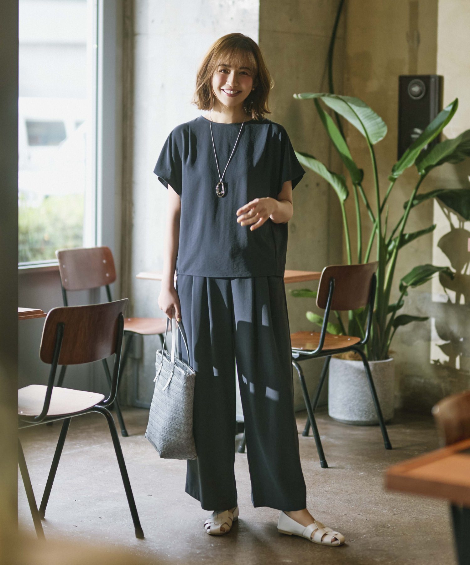 袖と首まわりがシャーリングされたフェミニンなディテール×凛としたストライプ柄が好バランス。手持ちの黒パン合わせのワンツーコーデもここまでクリーンな印象に。