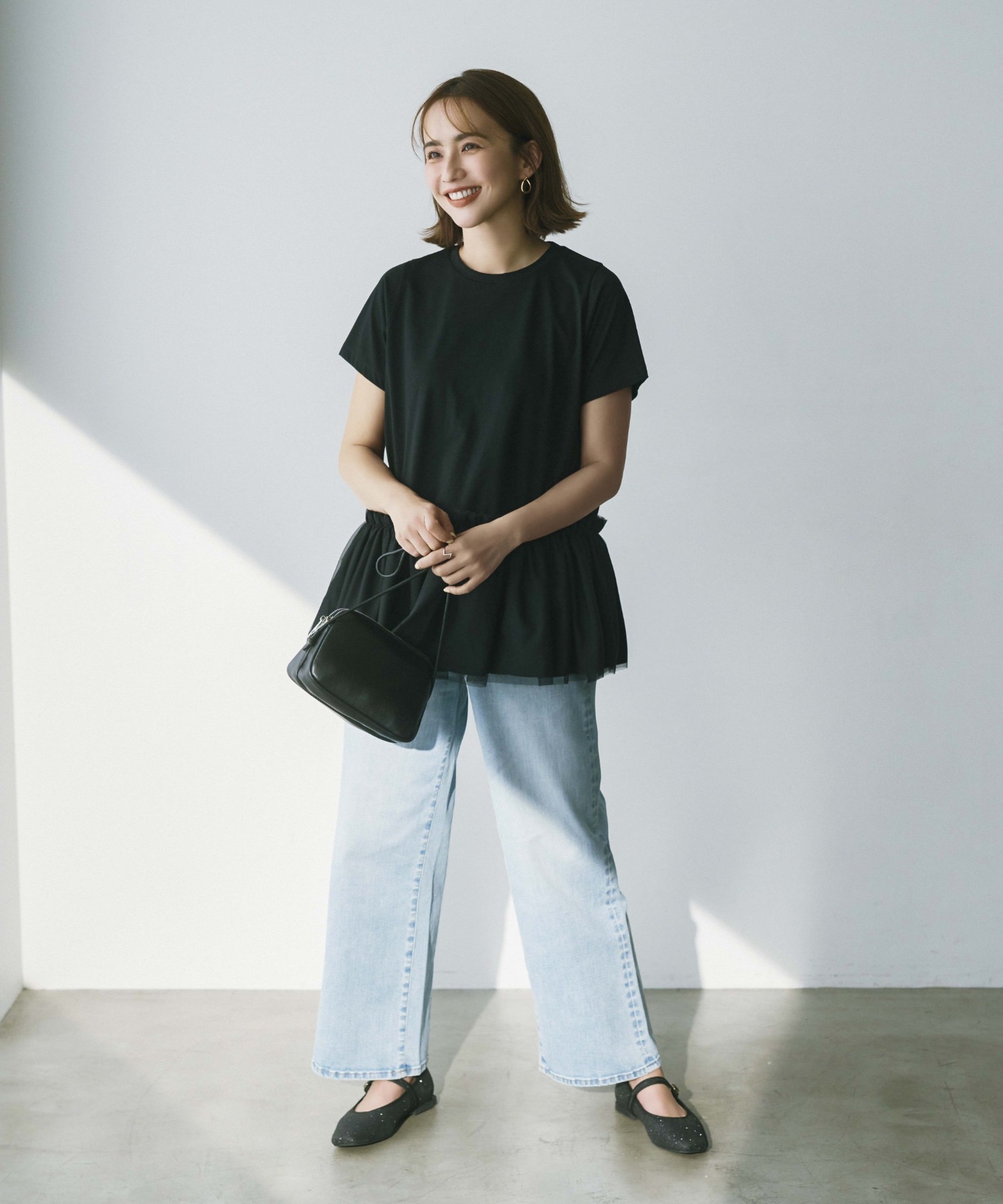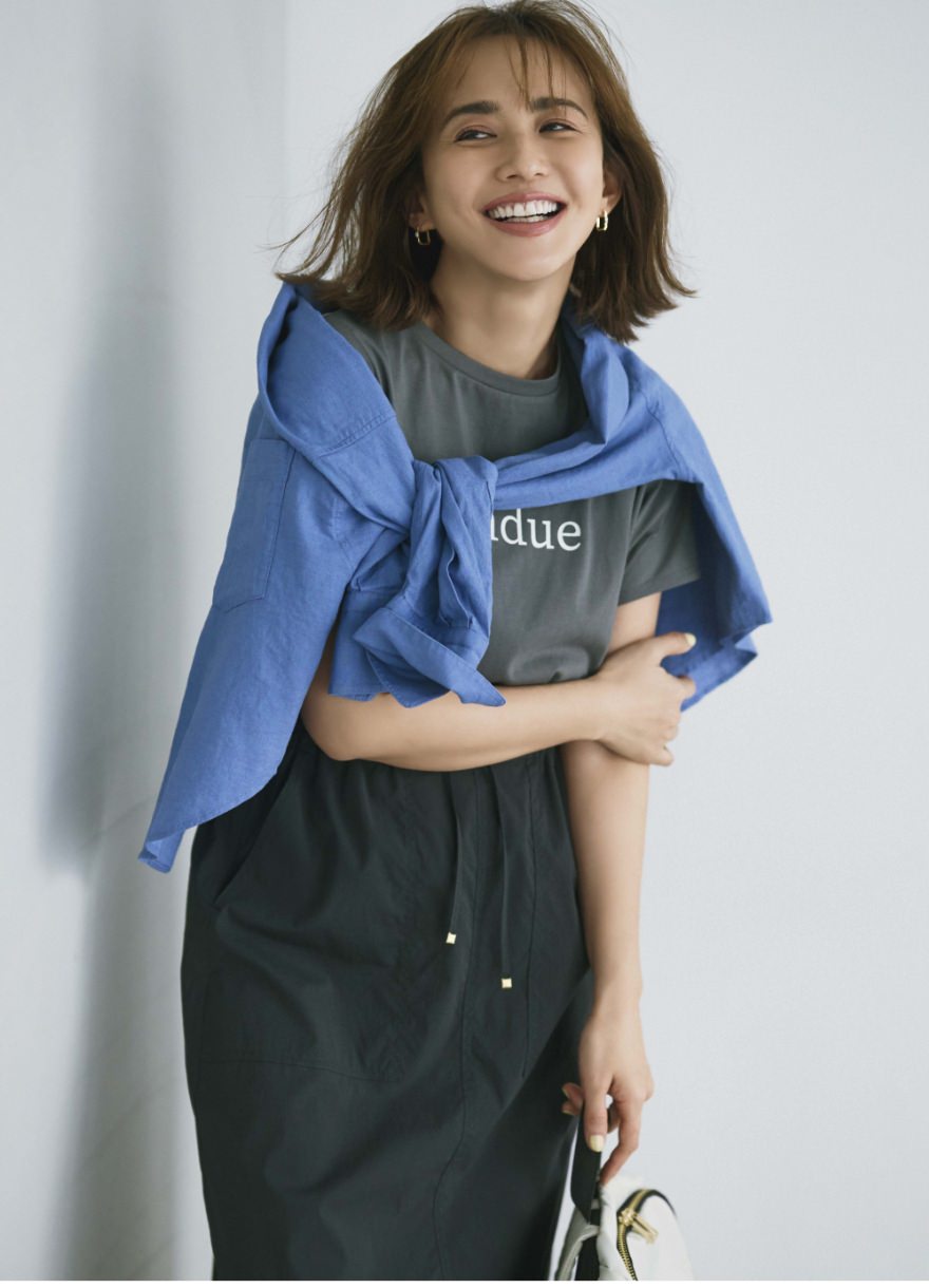 気になる腰まわりをカバーしつつ好感度の叶うデザインプルオーバー。チュール部分はコンサバ感を払拭するようあえて切りっぱなしの仕様に。きちんと感のあるPTAやカジュアル行事などシーンを問わず大活躍しそう!