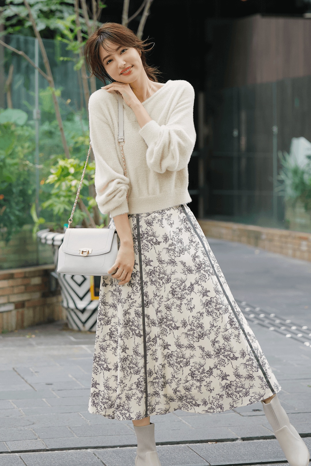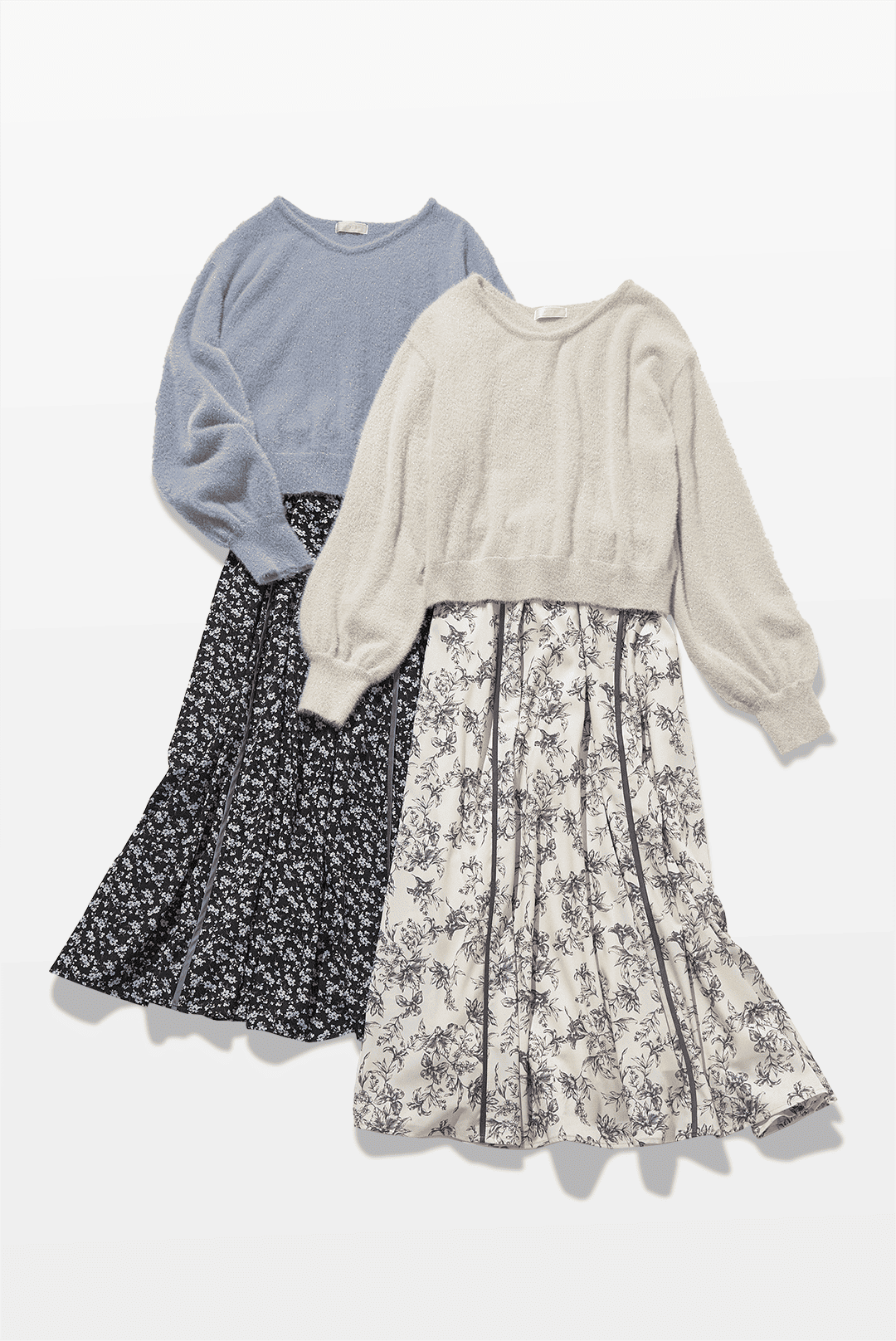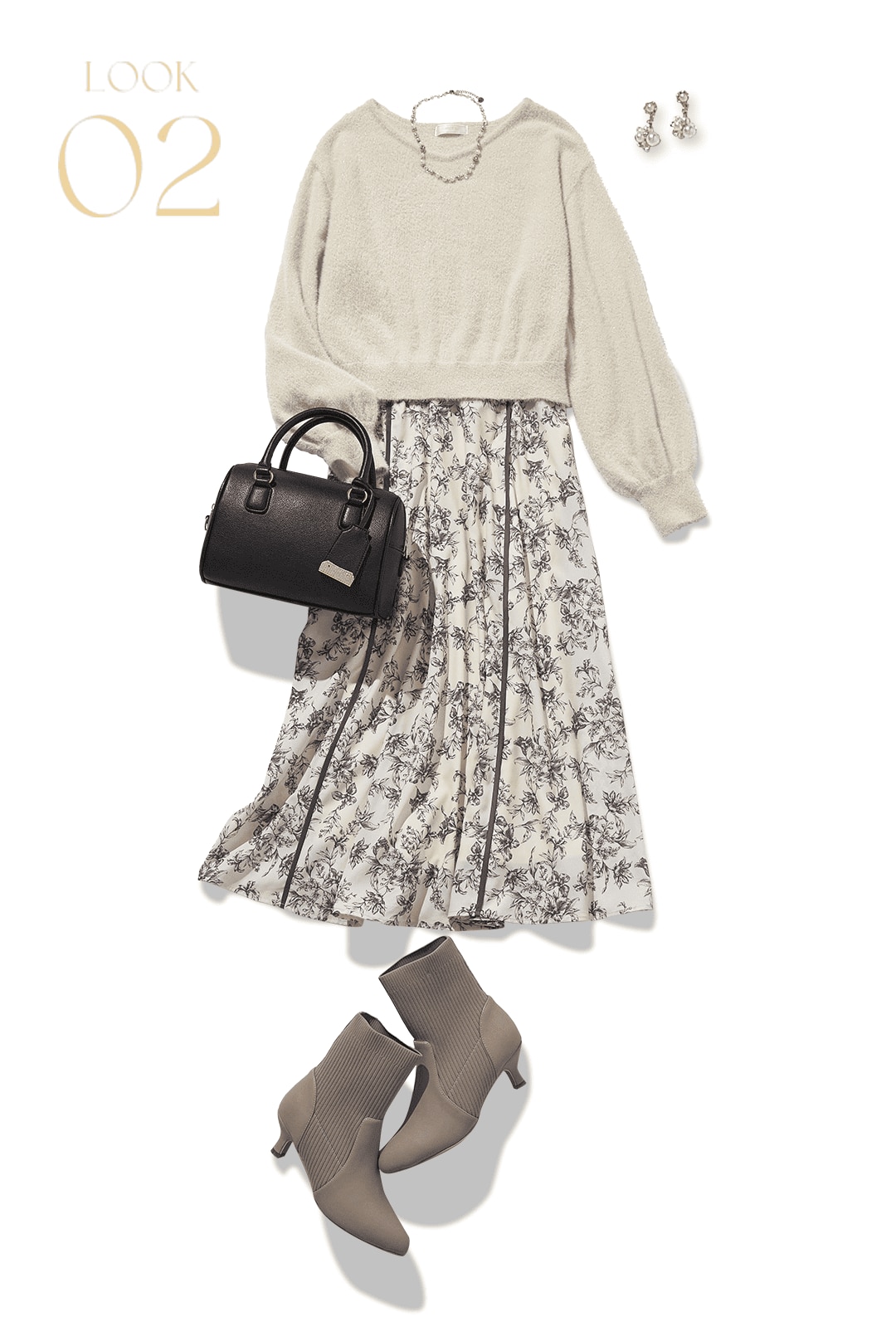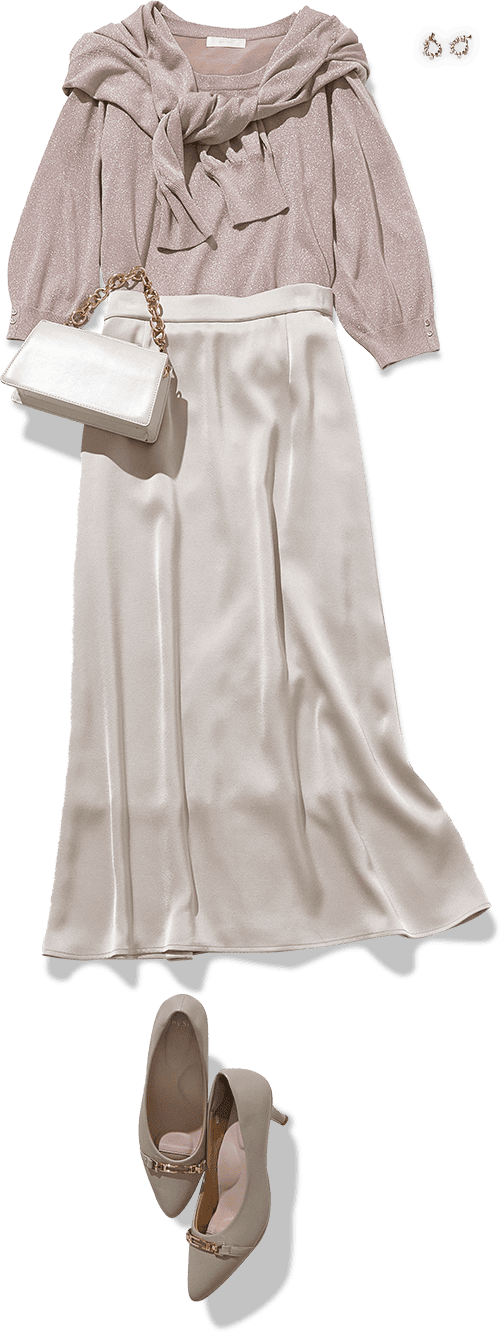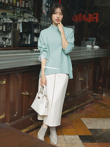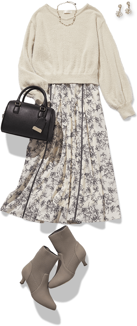 安らぎを感じさせる大人の甘さがすてきなスタイリング。可憐なのにほっこりしすぎないのもポイントが高いです。モヘアなどのふわふわとしたニットはつい触れてみたくなるアイテム。スカートの揺れる質感も好まれる要素です。