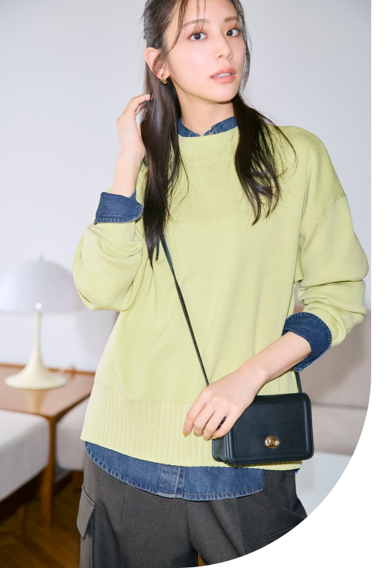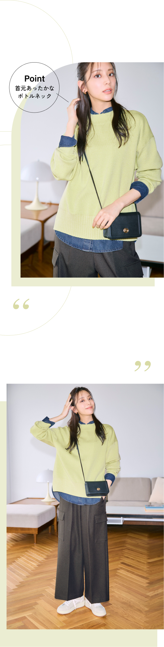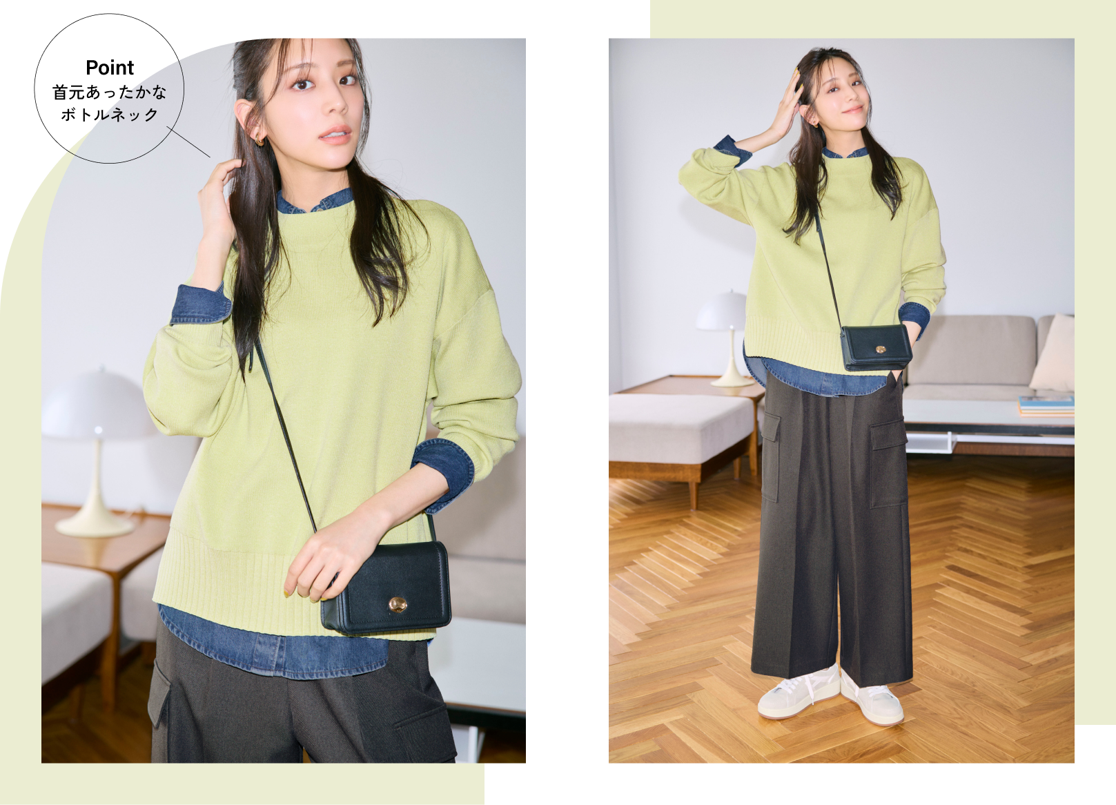 洒脱なライムニットからデニムシャツをチラリと見せて抜けよく。きれいめカーゴパンツで都会派スポーティにまとめると小粋なOFFスタイルに。