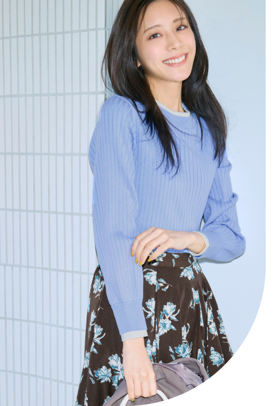 ライトブルーで繋いだニット&花柄スカートで作る、