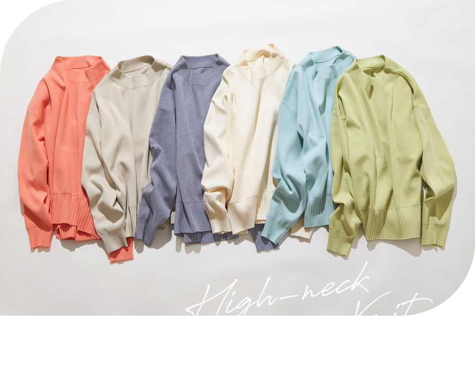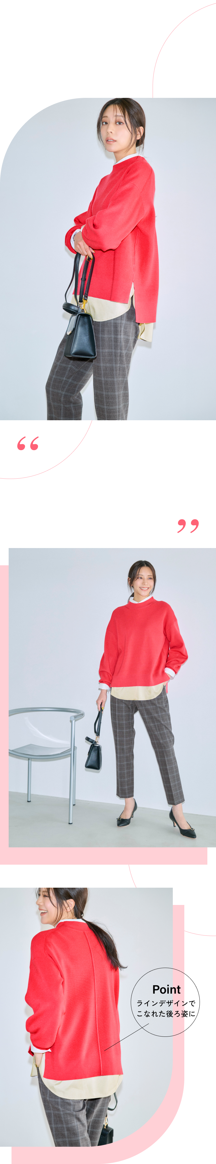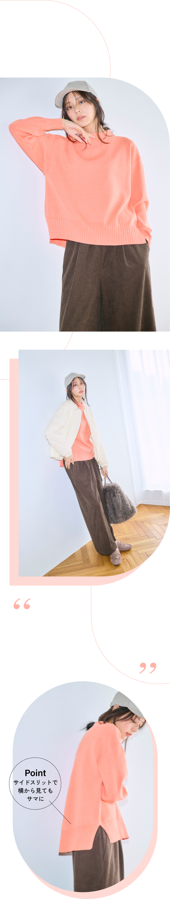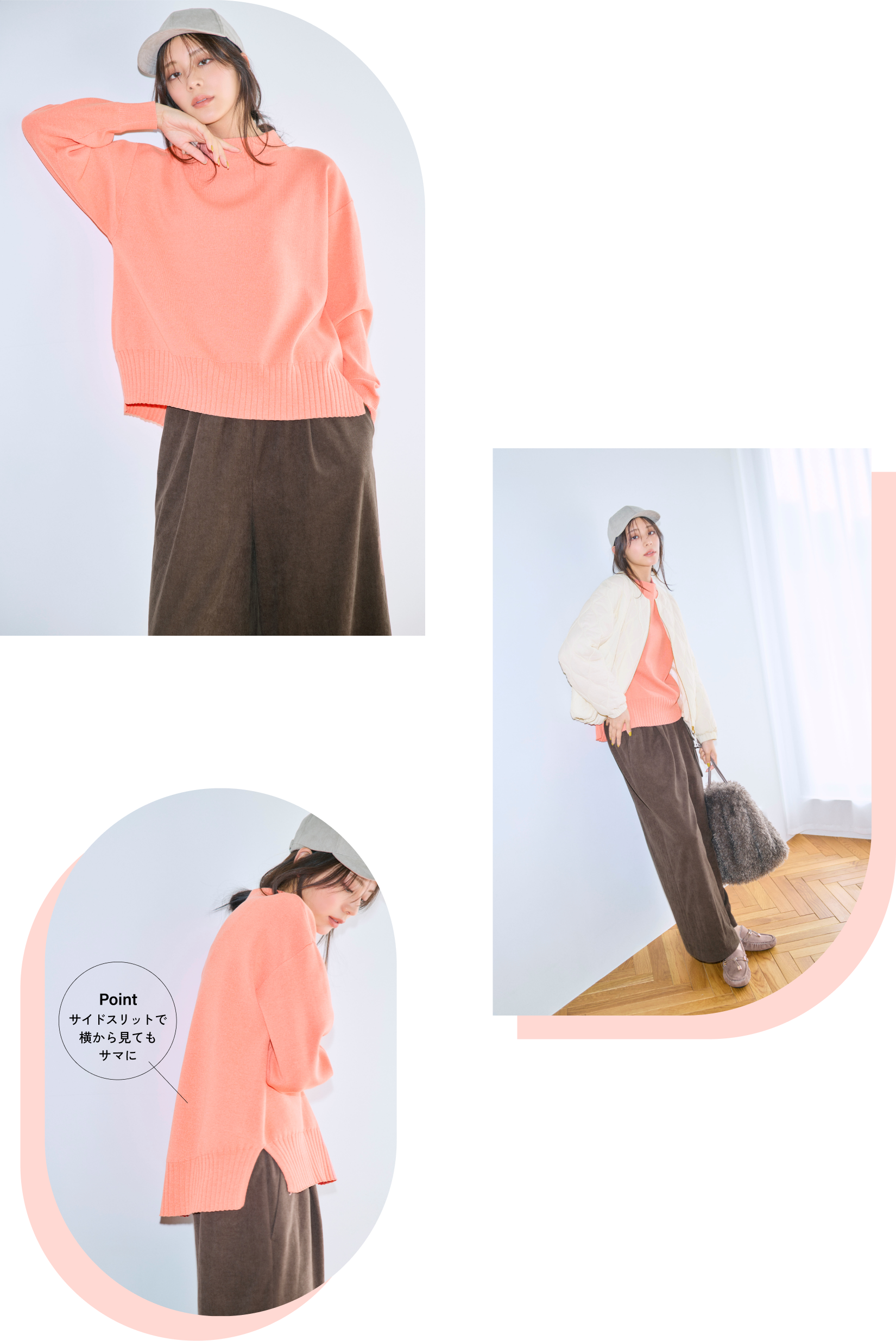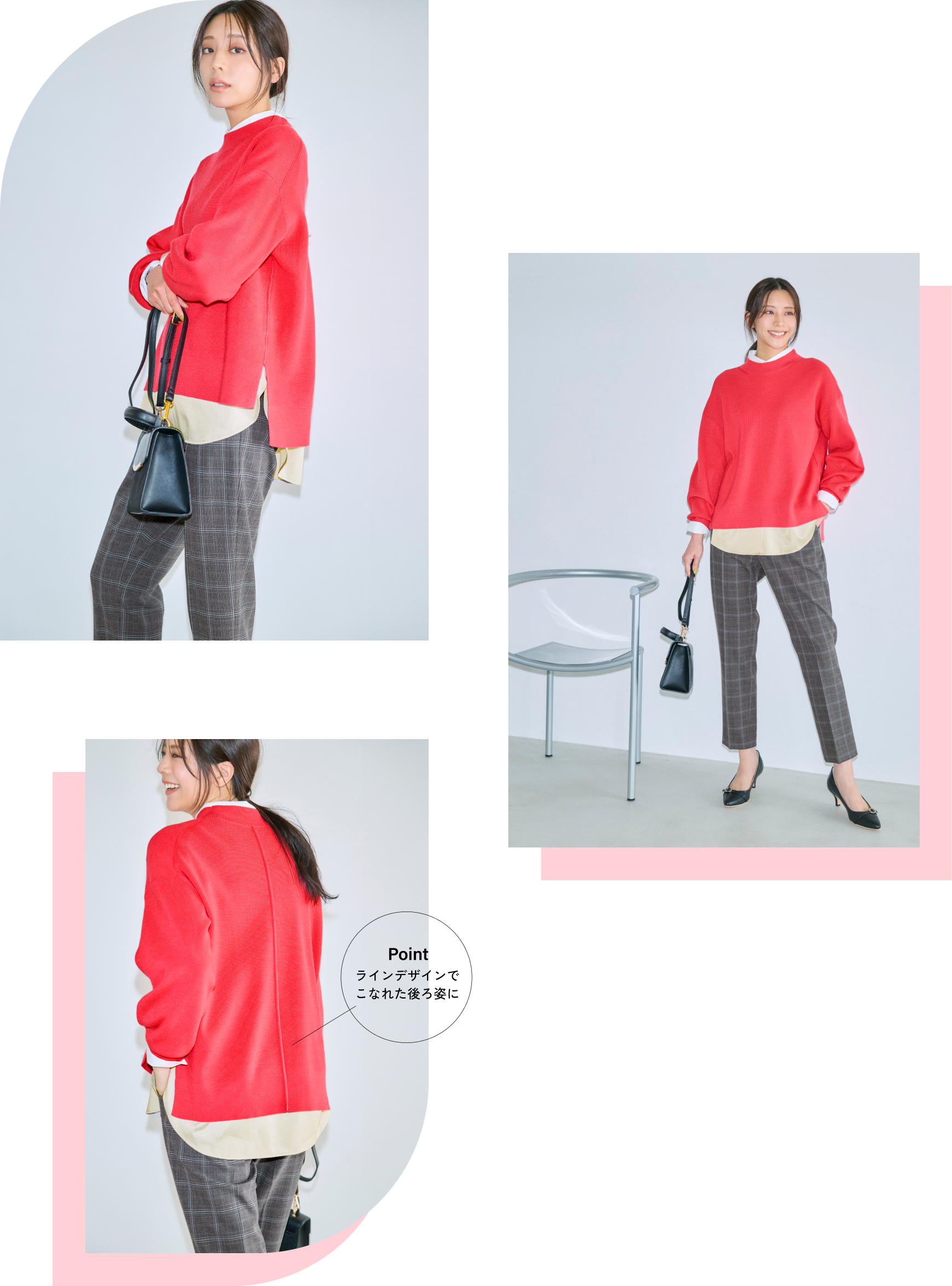 パッと目を引くコーラルピンクは、着るだけでHAPPYになれそうな鮮やかトーンが魅力的。お仕事シーンならシャツを仕込んできちんと顔に。