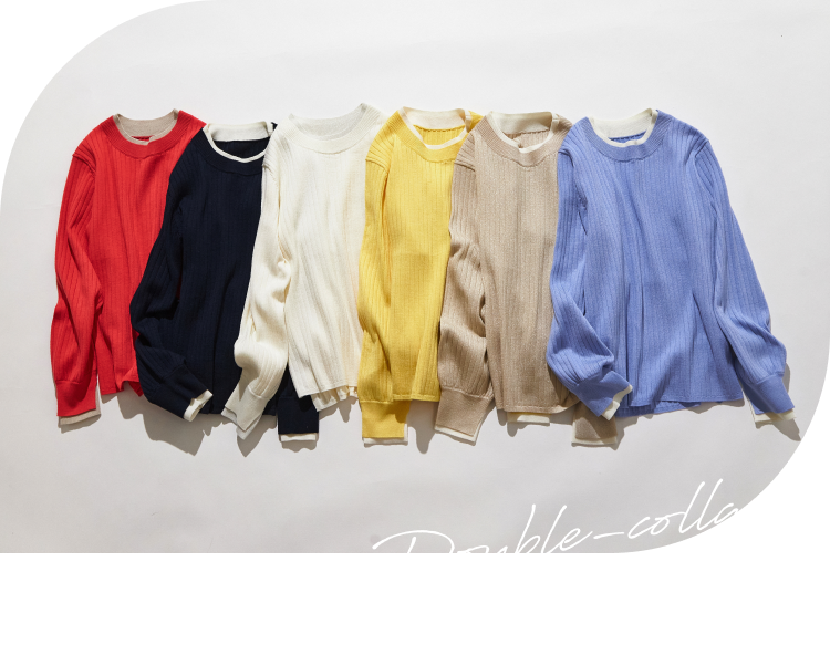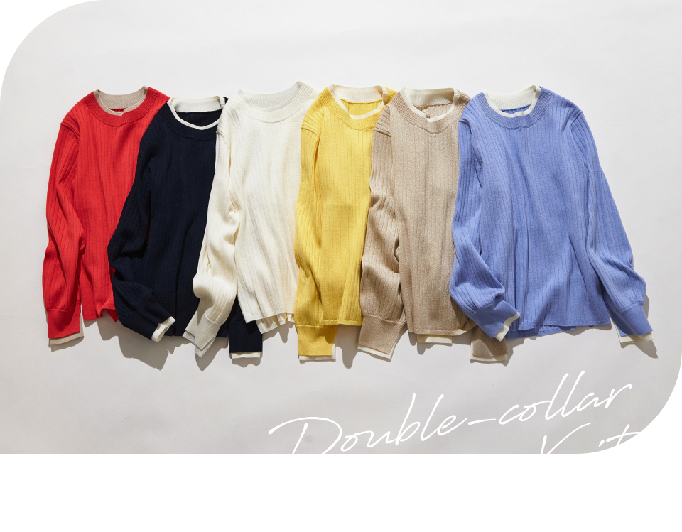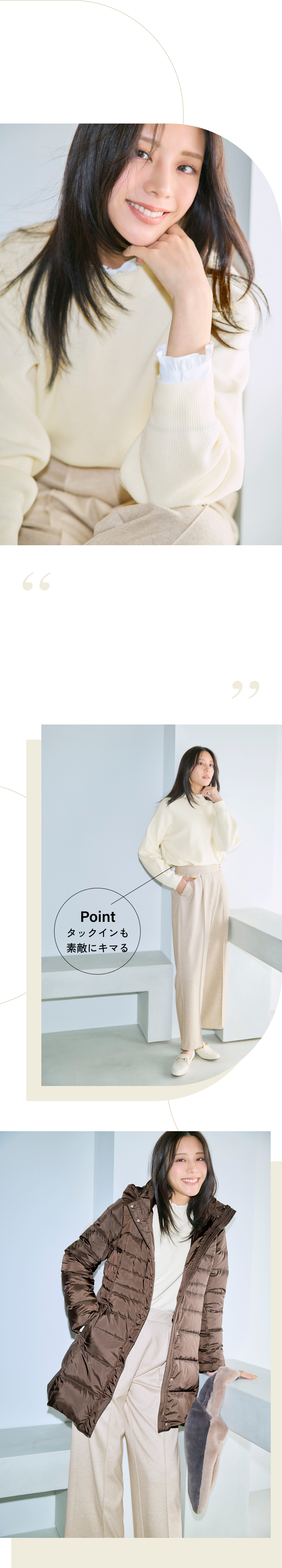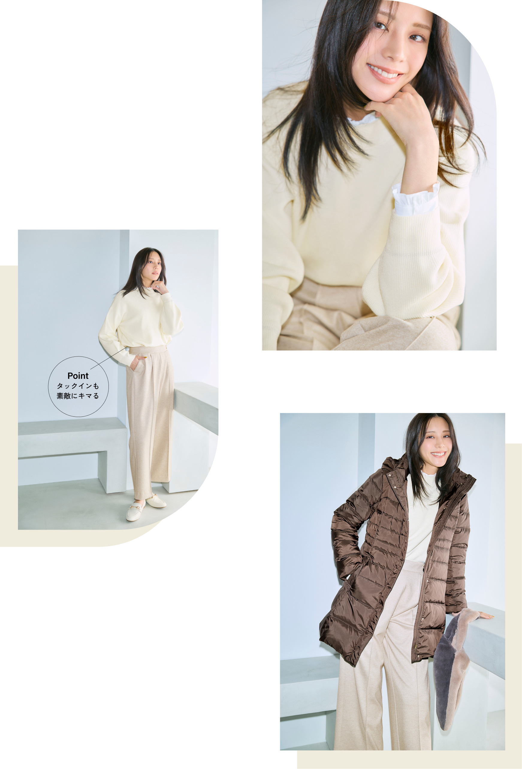 ニュアンスのあるオフホワイトニットで優しく。フリルカラーの甘シャツとのレイヤードなら、グッとフェミニンに、上品ムードが加速する♡