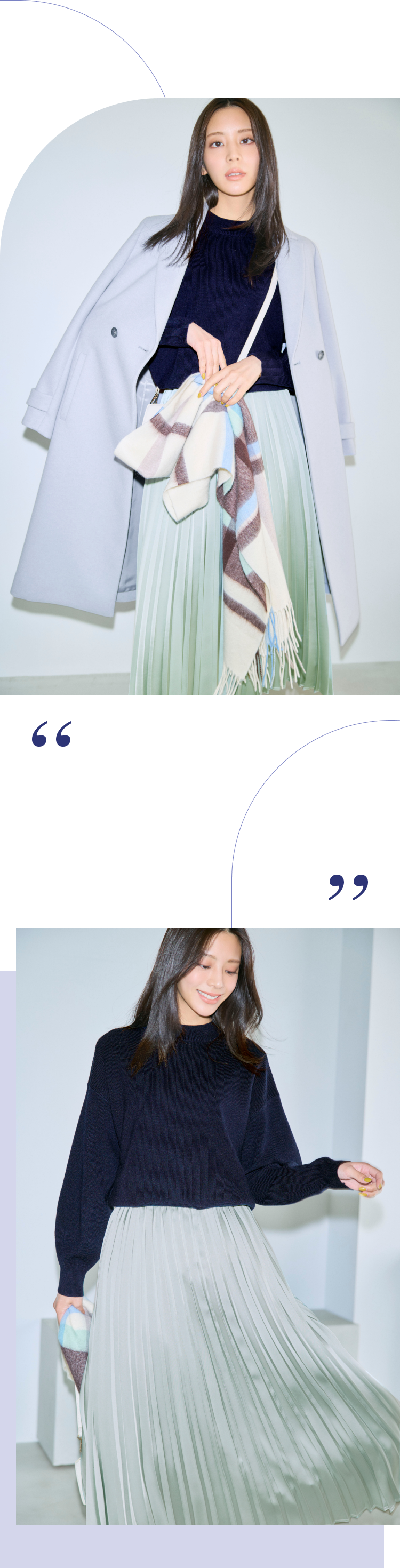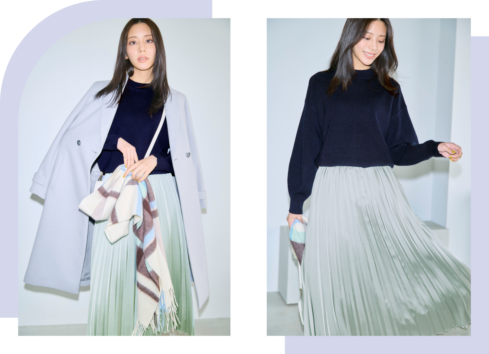 知的なネイビーはきれいめコーデにぴったり。光沢のあるプリーツスカートなど存在感のあるボトムも品よく受け止め、洗練された印象へ。