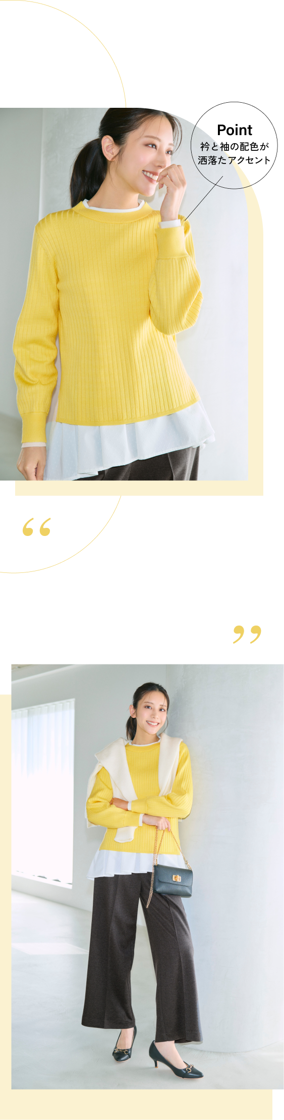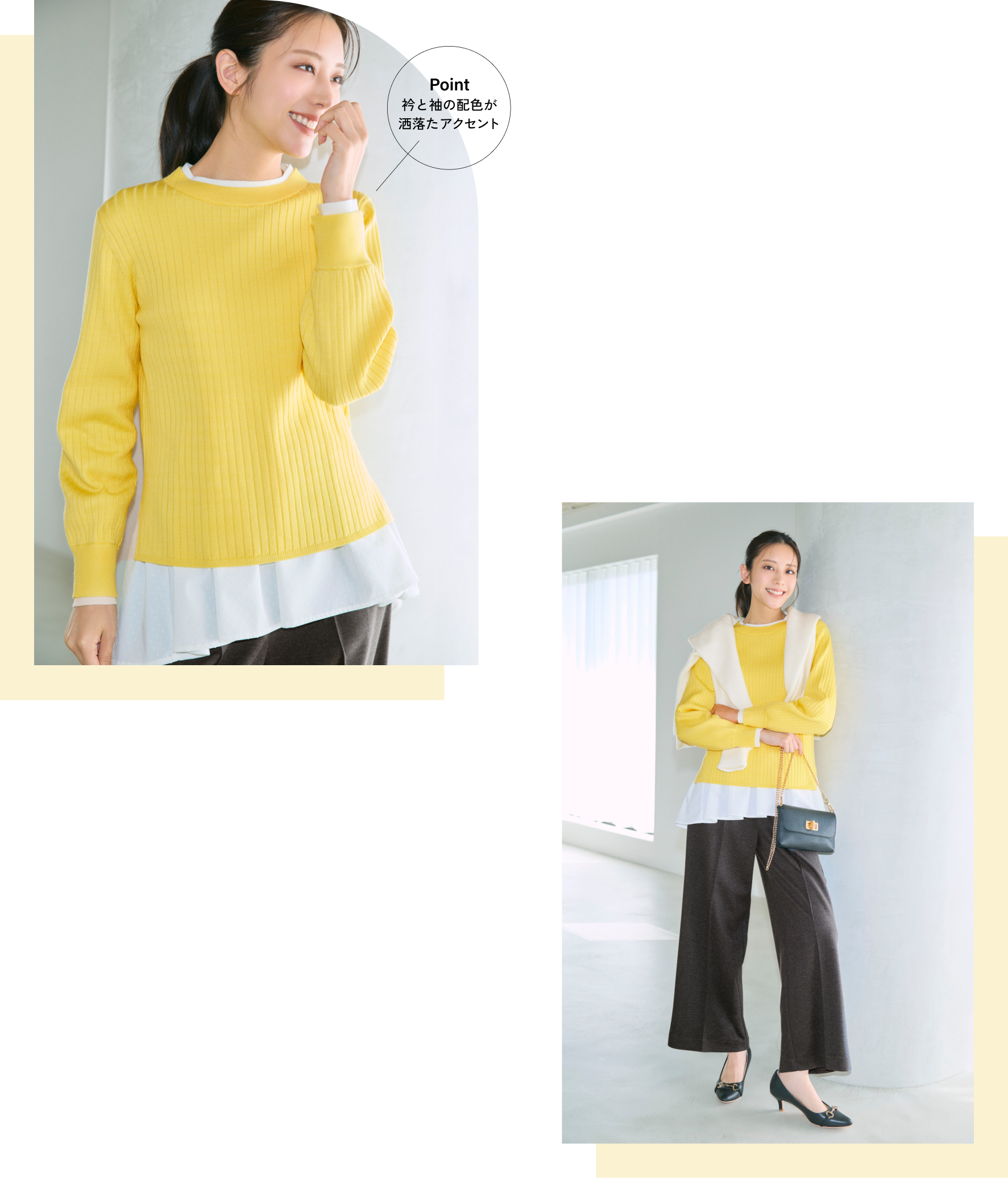 キャッチーなライトイエローニットに、ペプラムトップスをINしてトレンドライクに。裾にスリットが入っているから、重ね着も決まりやすい!