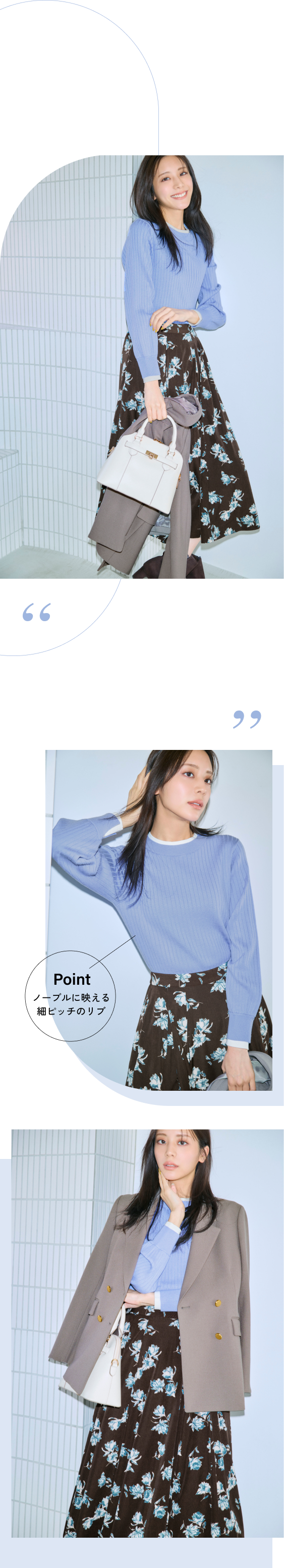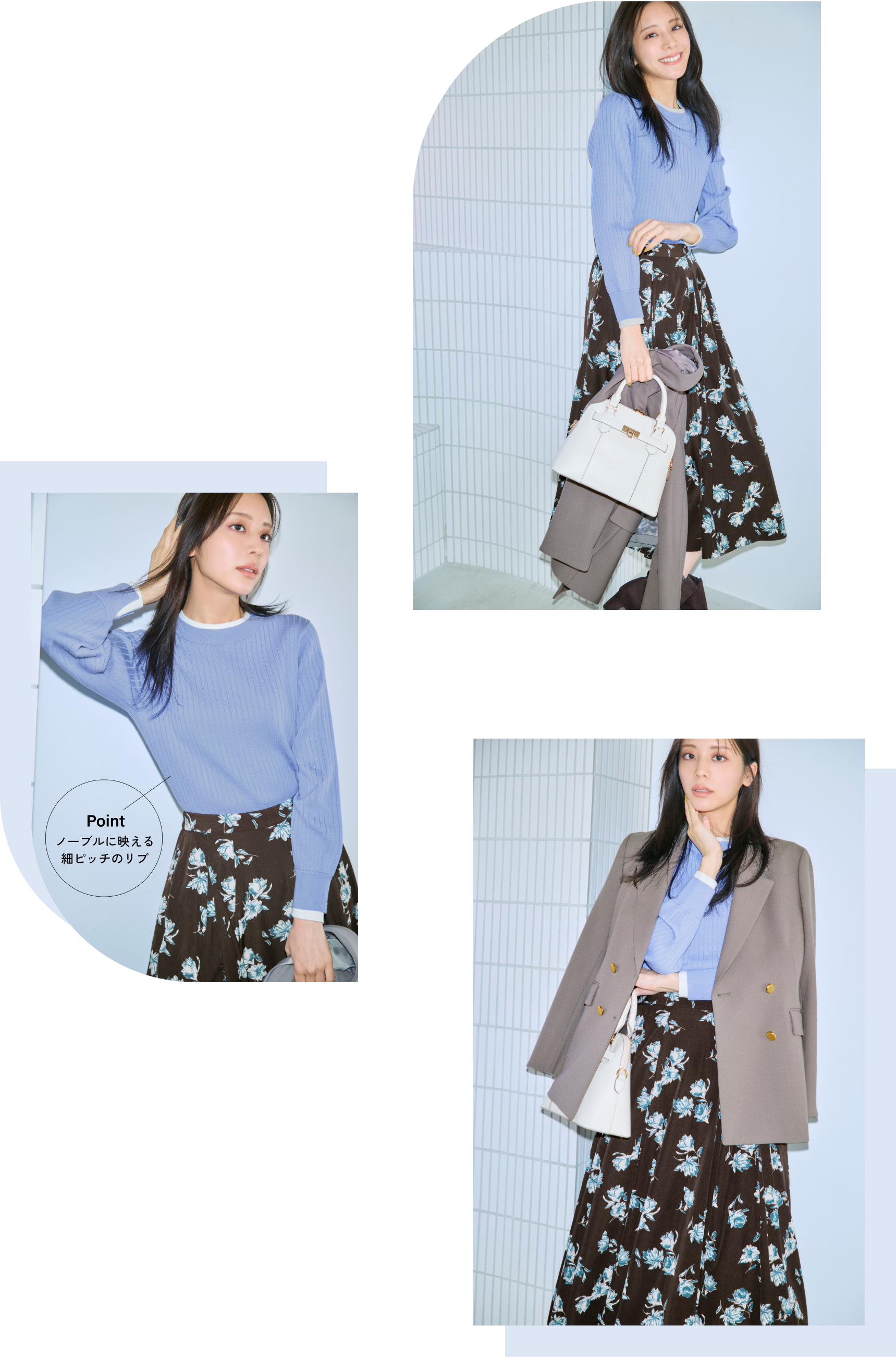 ライトブルーで繋いだニット&花柄スカートで作る、爽やかフェミニンコーデ。 白の配色ラインがクリーンさもプラス。×ジャケットで通勤仕様に。