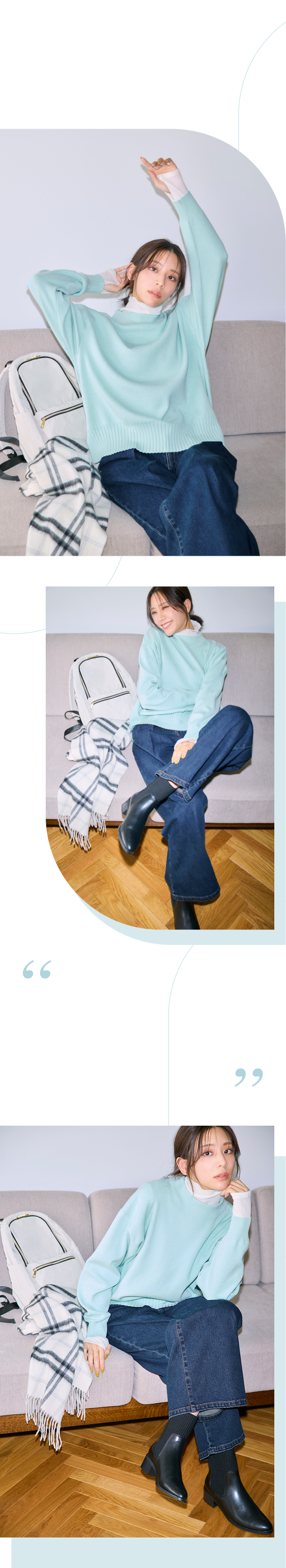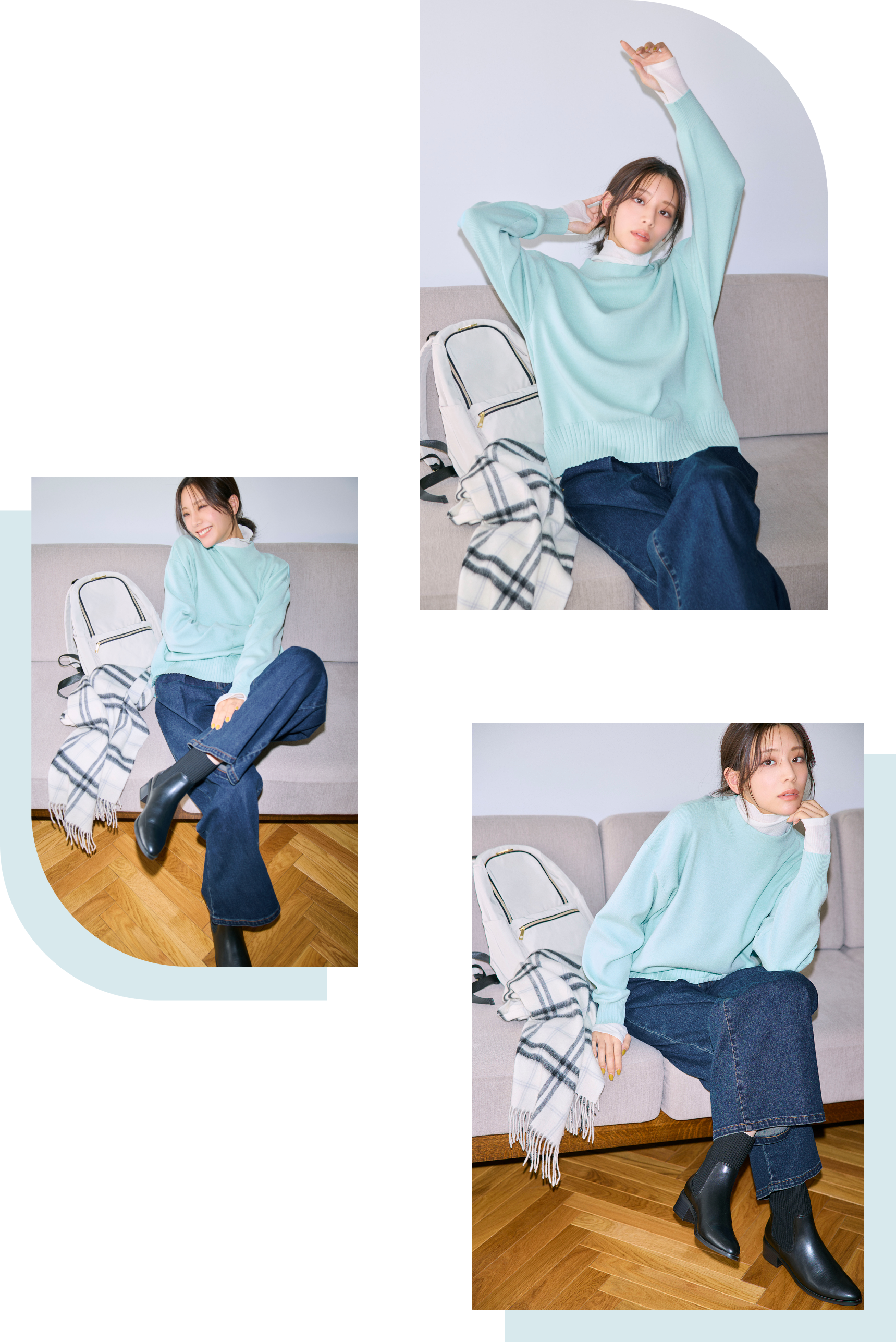 重くなりがちな冬コーデを軽快に仕上げるスカイブルー。シアートップスをレイヤードすることでリズムが生まれて、さらにコーデの完成度がUP。