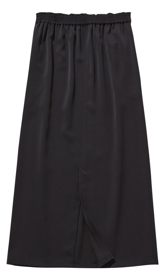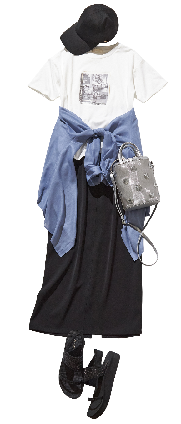 体型を拾いにくい程よく地厚な素材感と、穿いていて楽ちんなウエストゴムが魅力のタイトスカート。フォトTとキャップでつくる休日コーデに女らしさをもたらして。