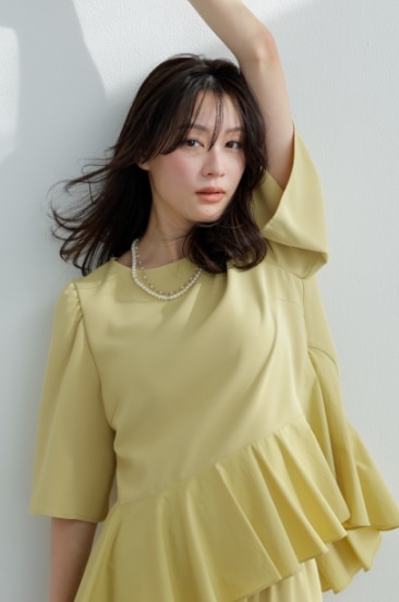 立体的な甘めブラウスで、カジュアルなデニムスタイルを大人かわいく。夏らしさ満点な色&デザインながら、紫外線は99%カット!その機能性の高さも頼りになる。