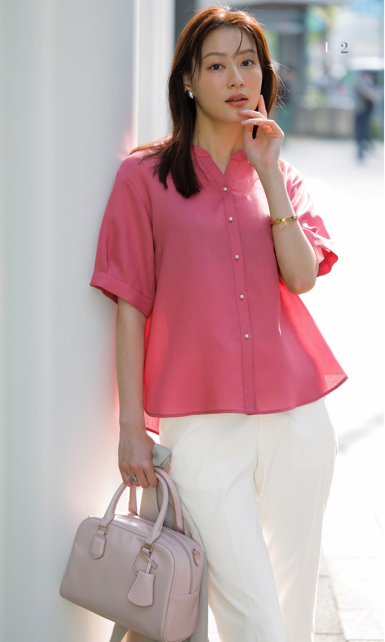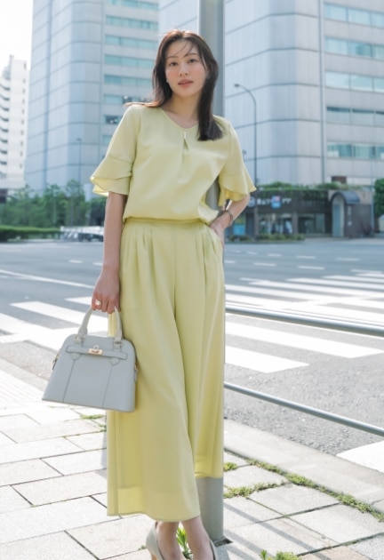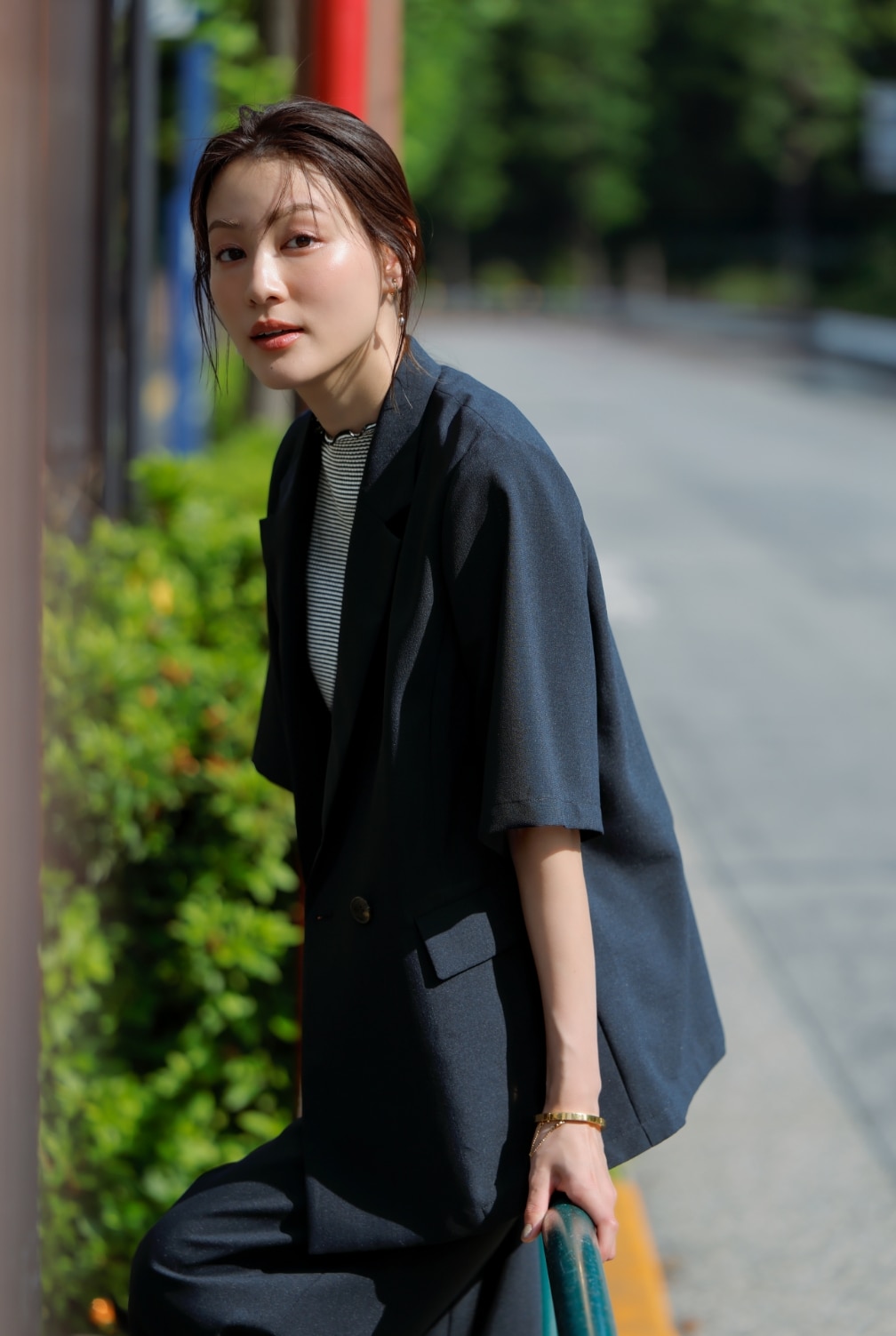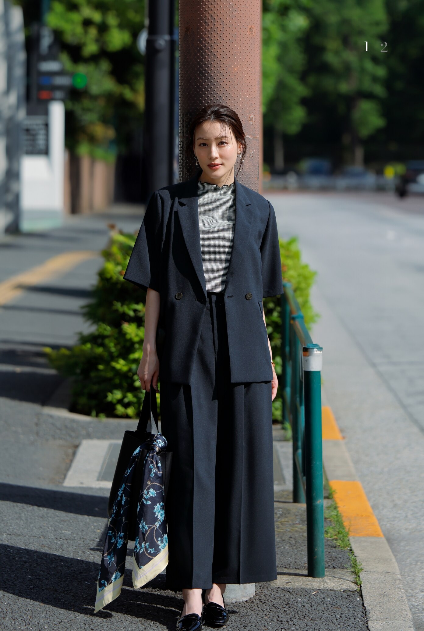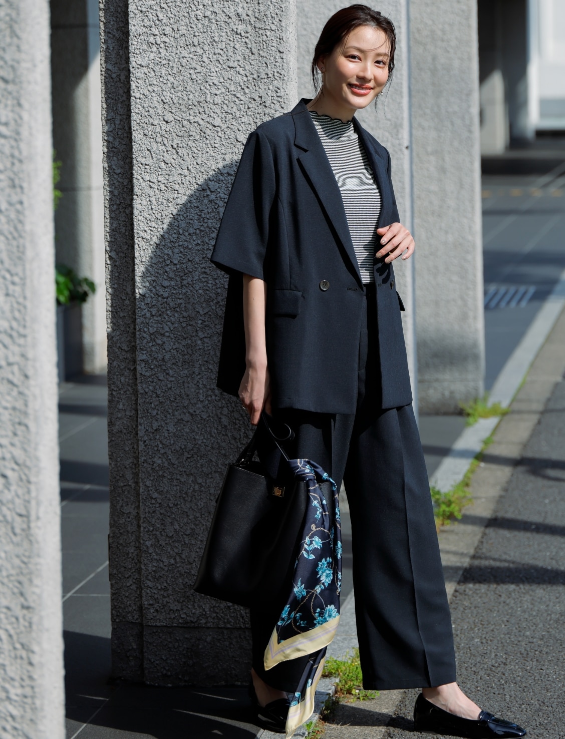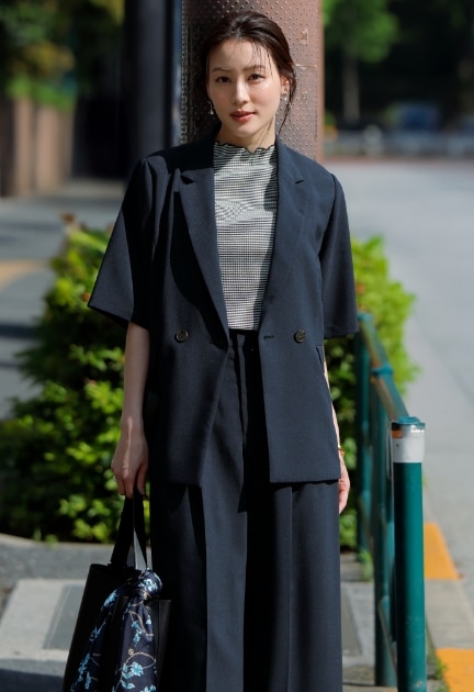 ボクシーなシルエットの半袖ジャケットとツータックのワイドパンツなら、きちんと感のあるスーチングスタイルも堅苦しすぎず、心地よい着こなしに。インナーにはキシリトール加工を施したトップスを選んでより涼しく。