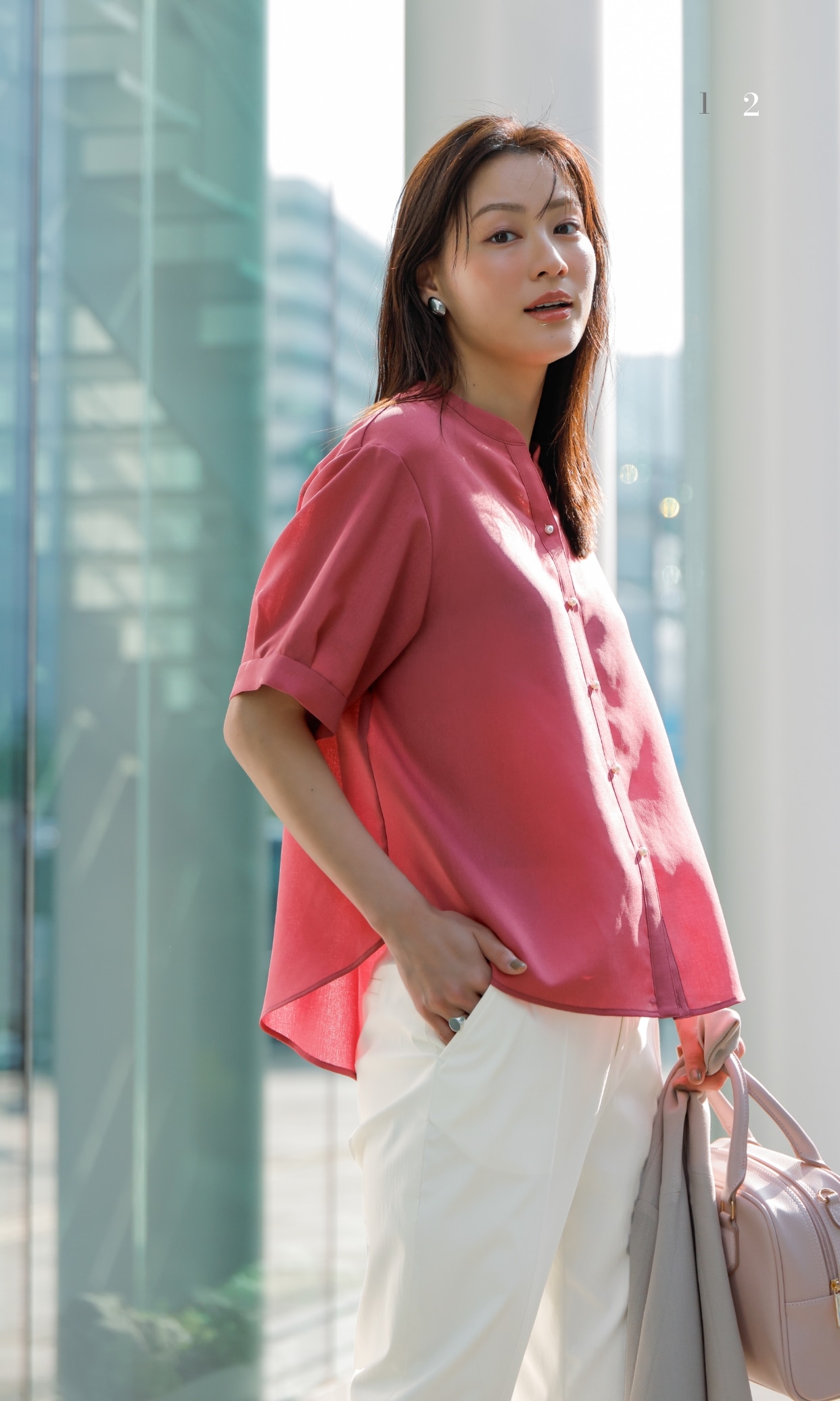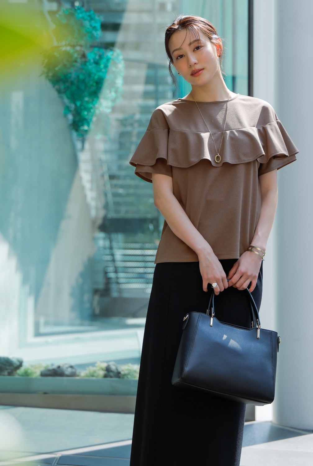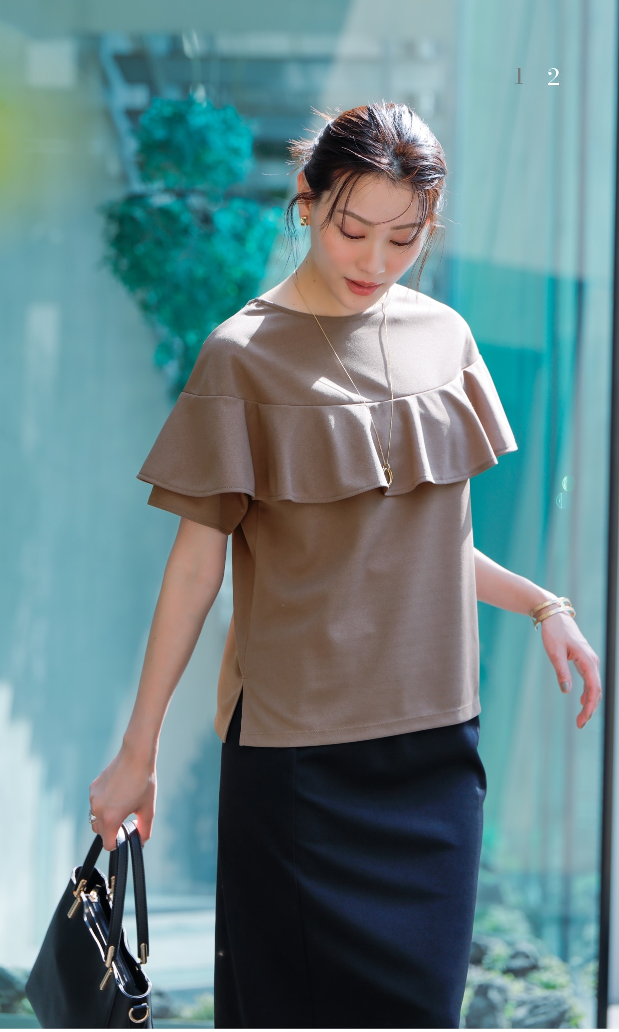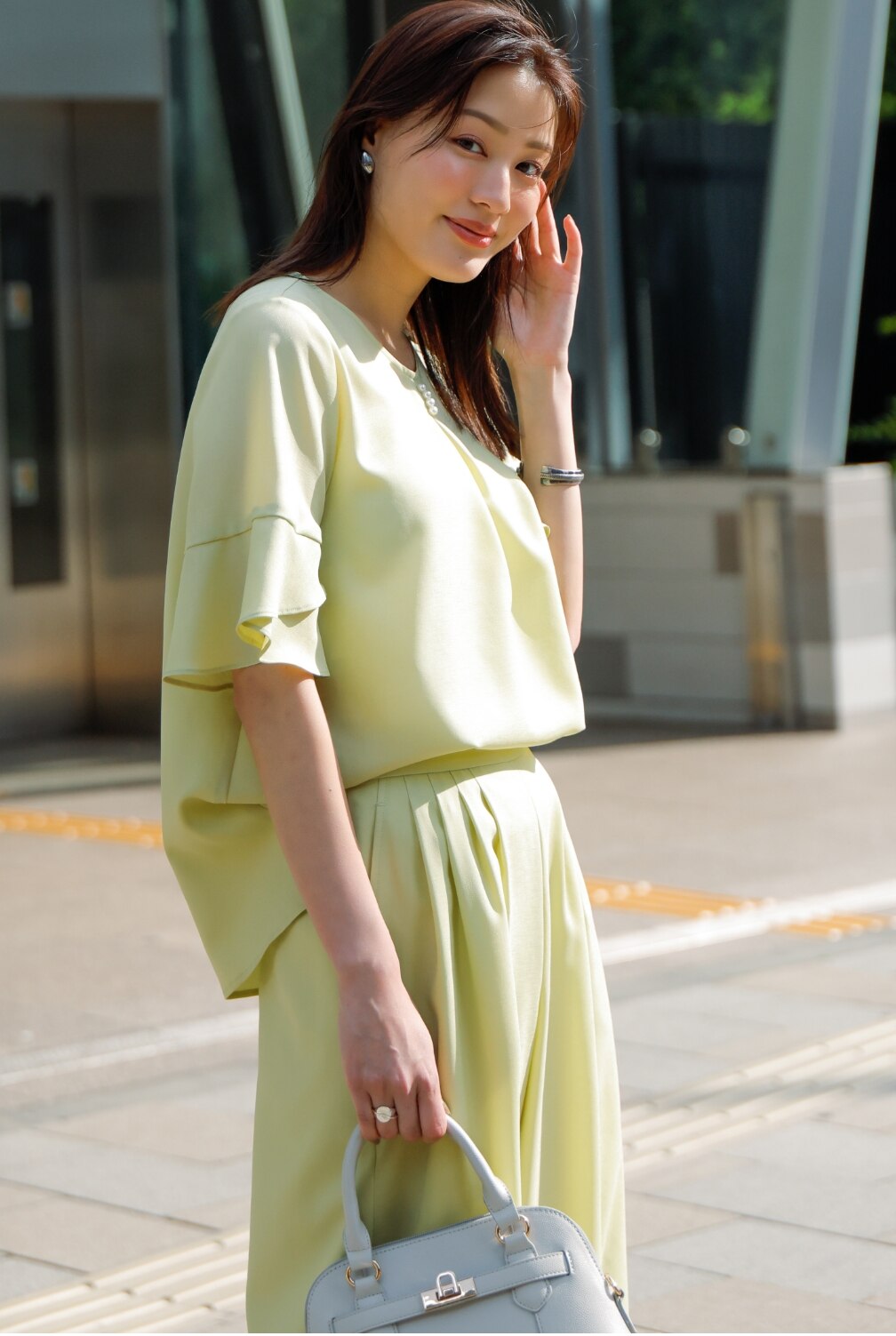 ボクシーなシルエットの半袖ジャケットとツータックのワイドパンツなら、きちんと感のあるスーチングスタイルも堅苦しすぎず、心地よい着こなしに。インナーにはキシリトール加工を施したトップスを選んでより涼しく。