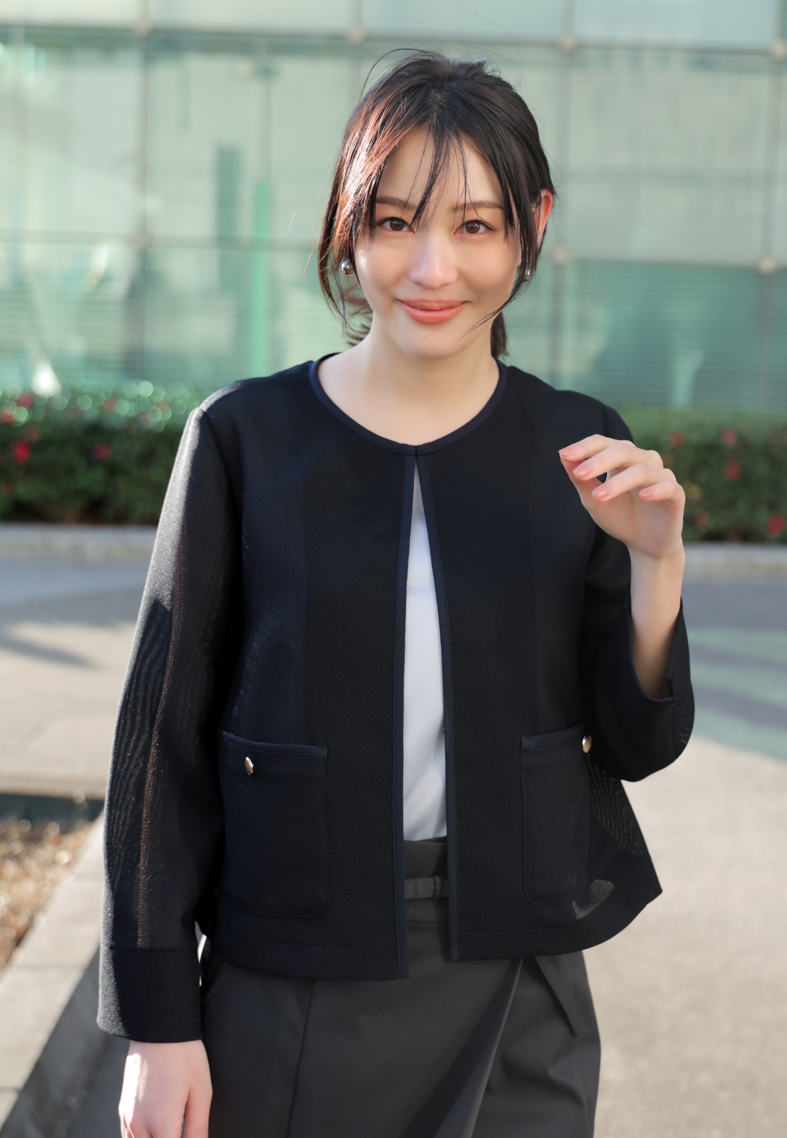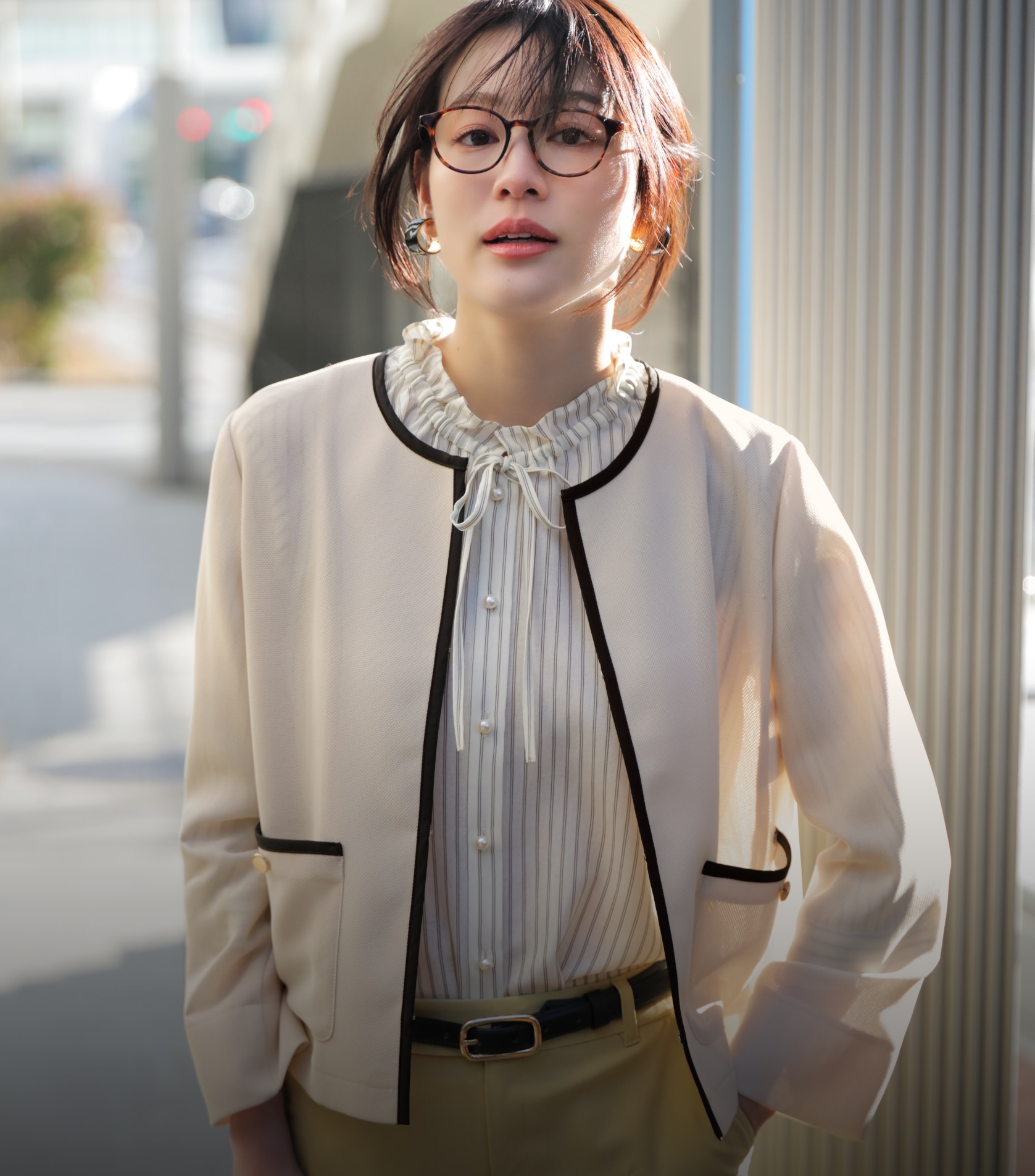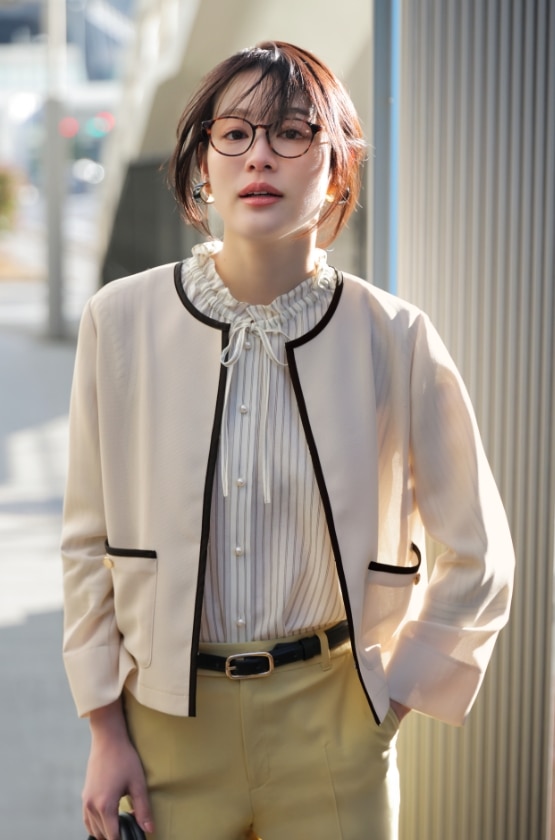 性を添えるノーカラージャケット。いつもの通