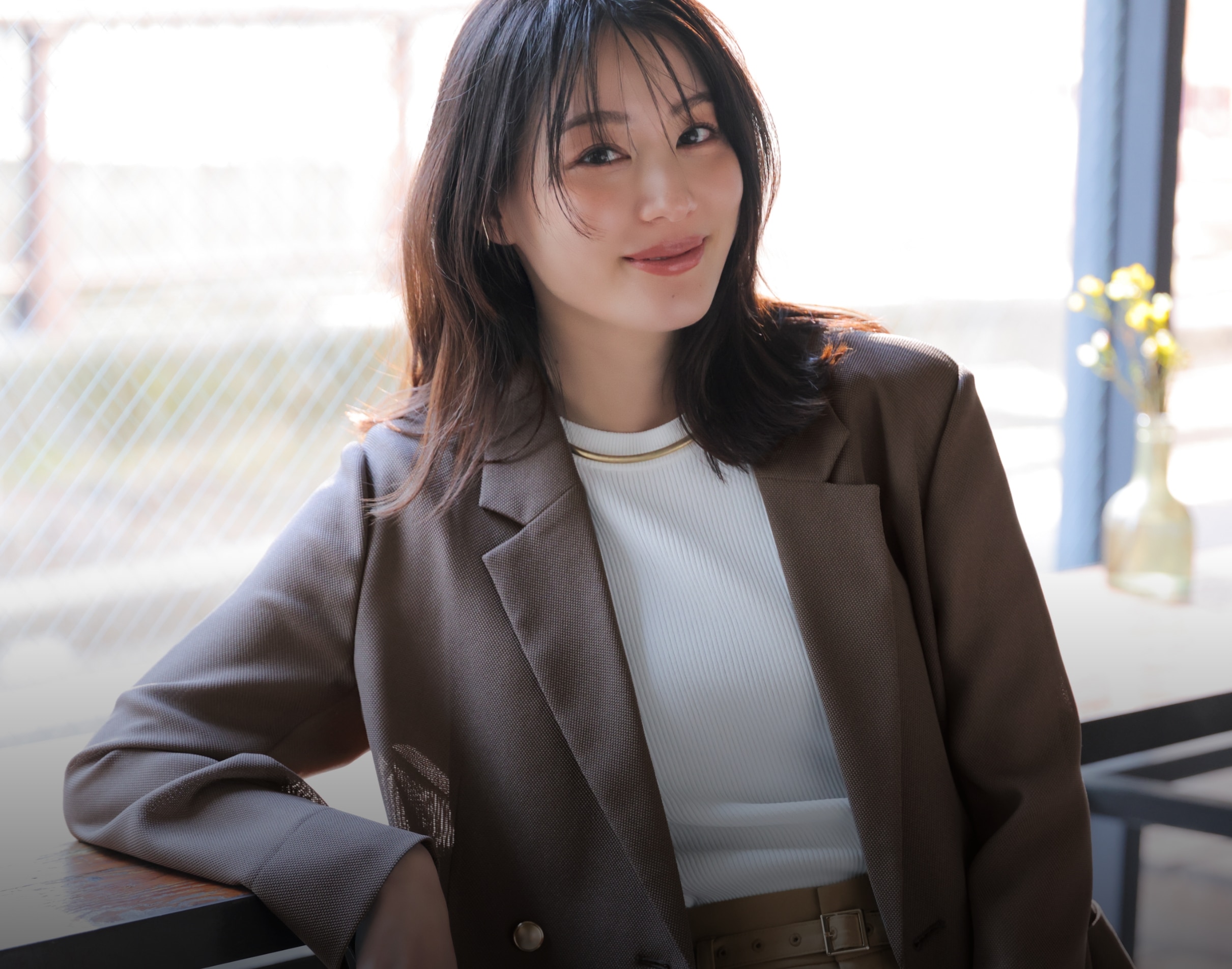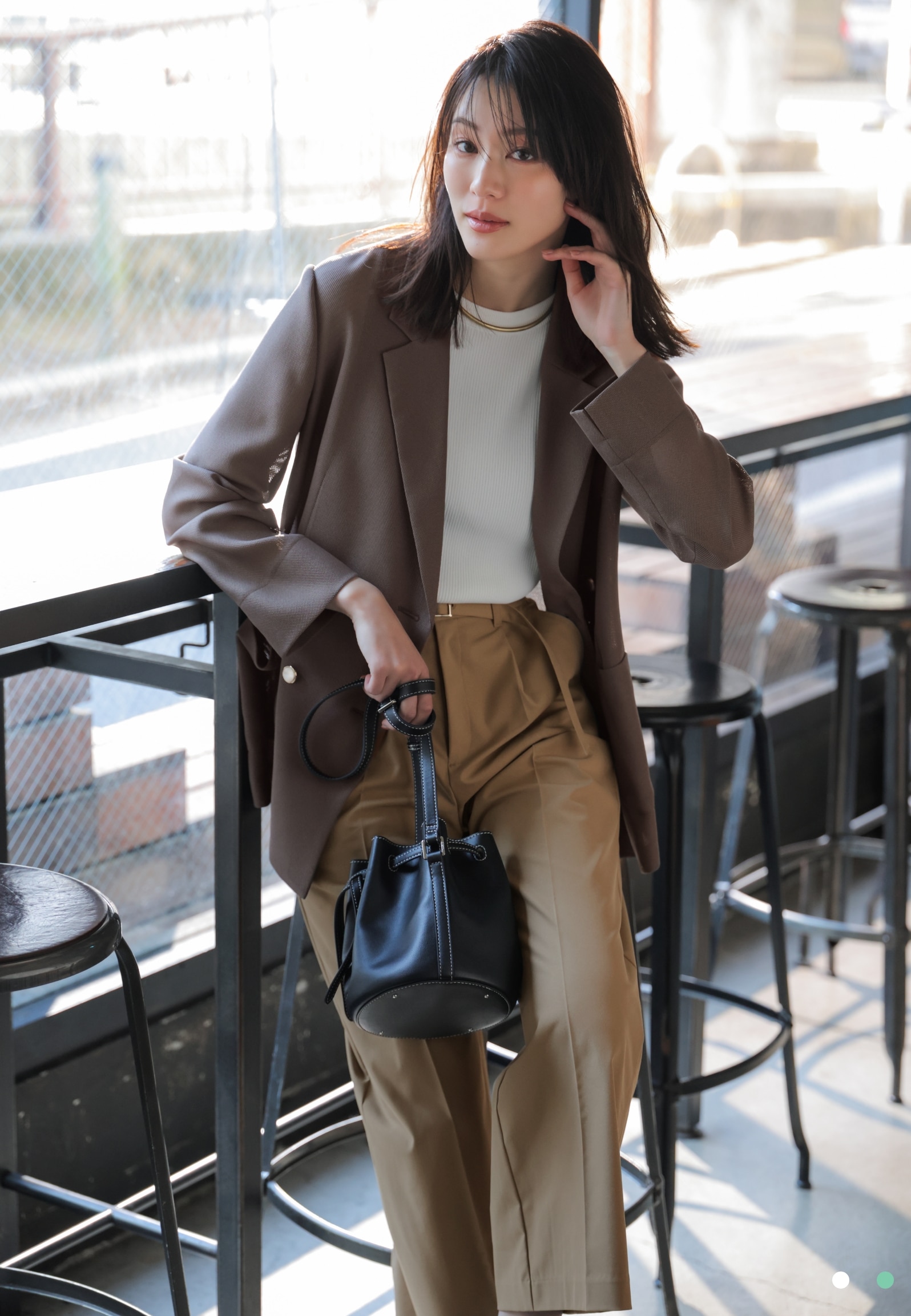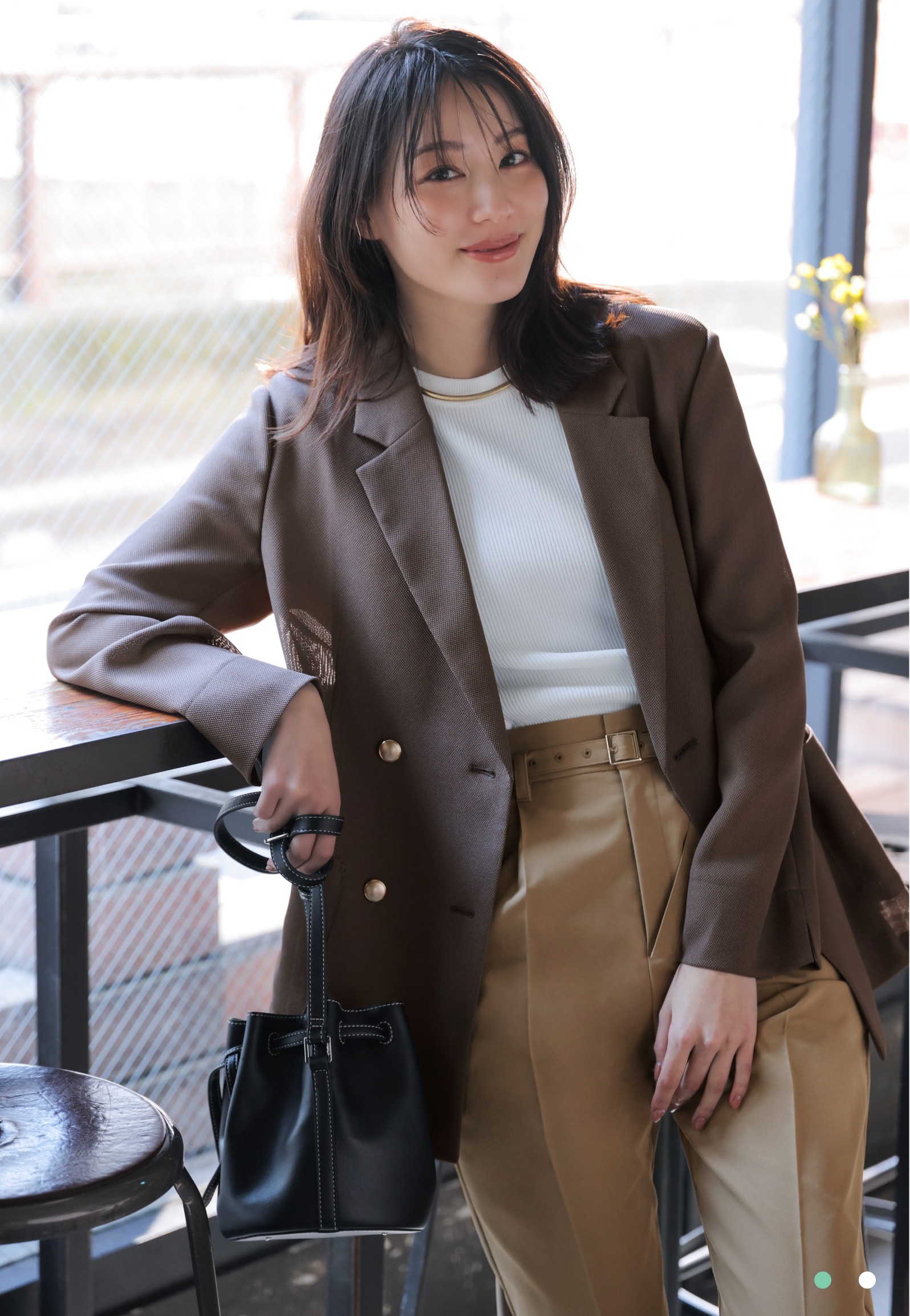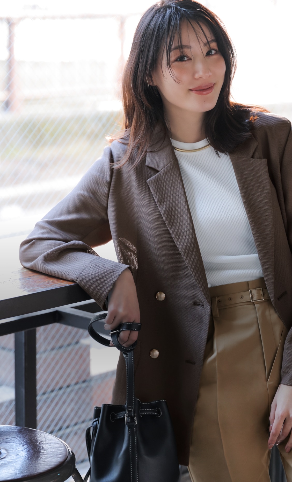 こくのあるモカグレーのダブルブレストジャケットに、チノ風のワイドパンツでマニッシュな洒落感をプラス。ジャケットの柔らかな色味と透け感に白のクルーニットとの相乗効果で、爽やかな抜けをつくって清涼感ある通勤スタイルが完成。