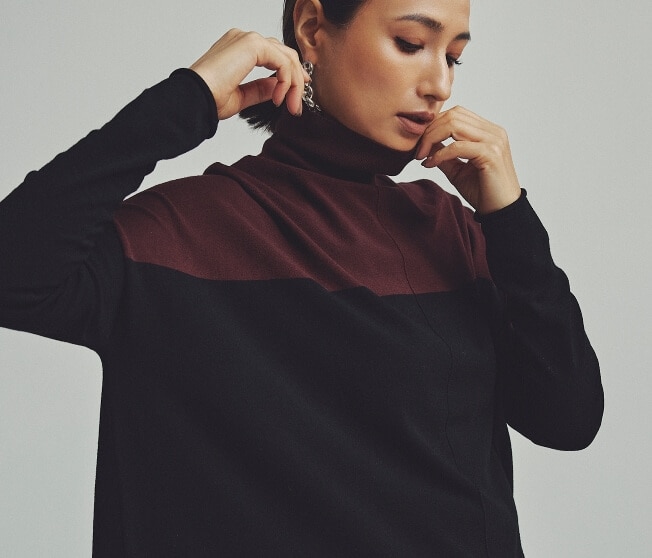 シックなカラーを大胆にブロッキングしたハイネックプルオーバー。カシミヤを贅沢にブレンド。オーセンティックな柄でありながら、モードで洗練された印象に。