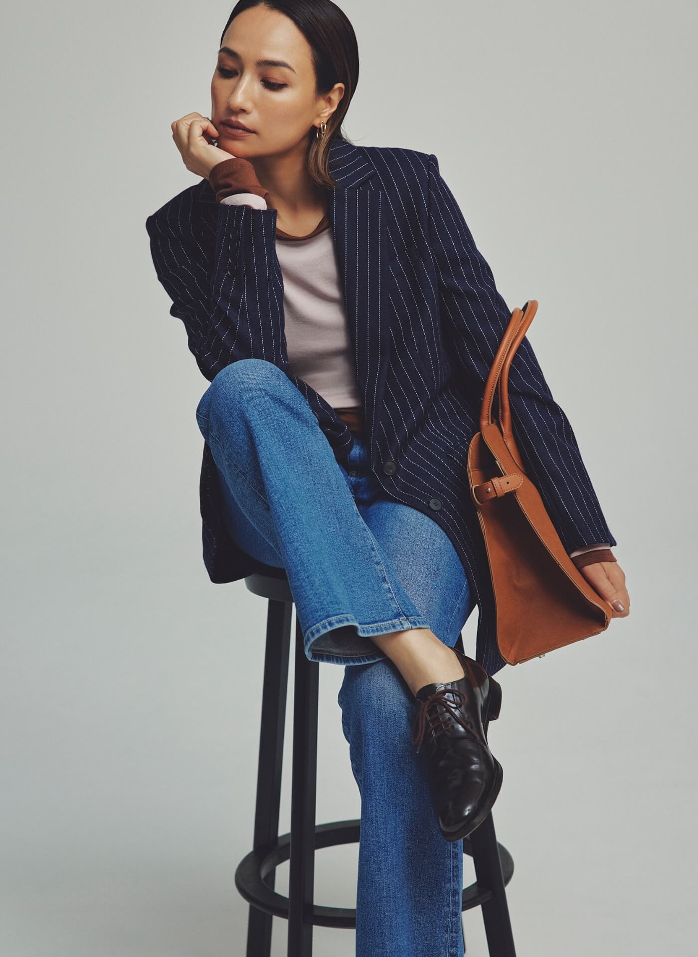 取り入れやすいアイテム。袖から覗くピンクカットソーとフレアデニムでカジュアルモダンに着地。