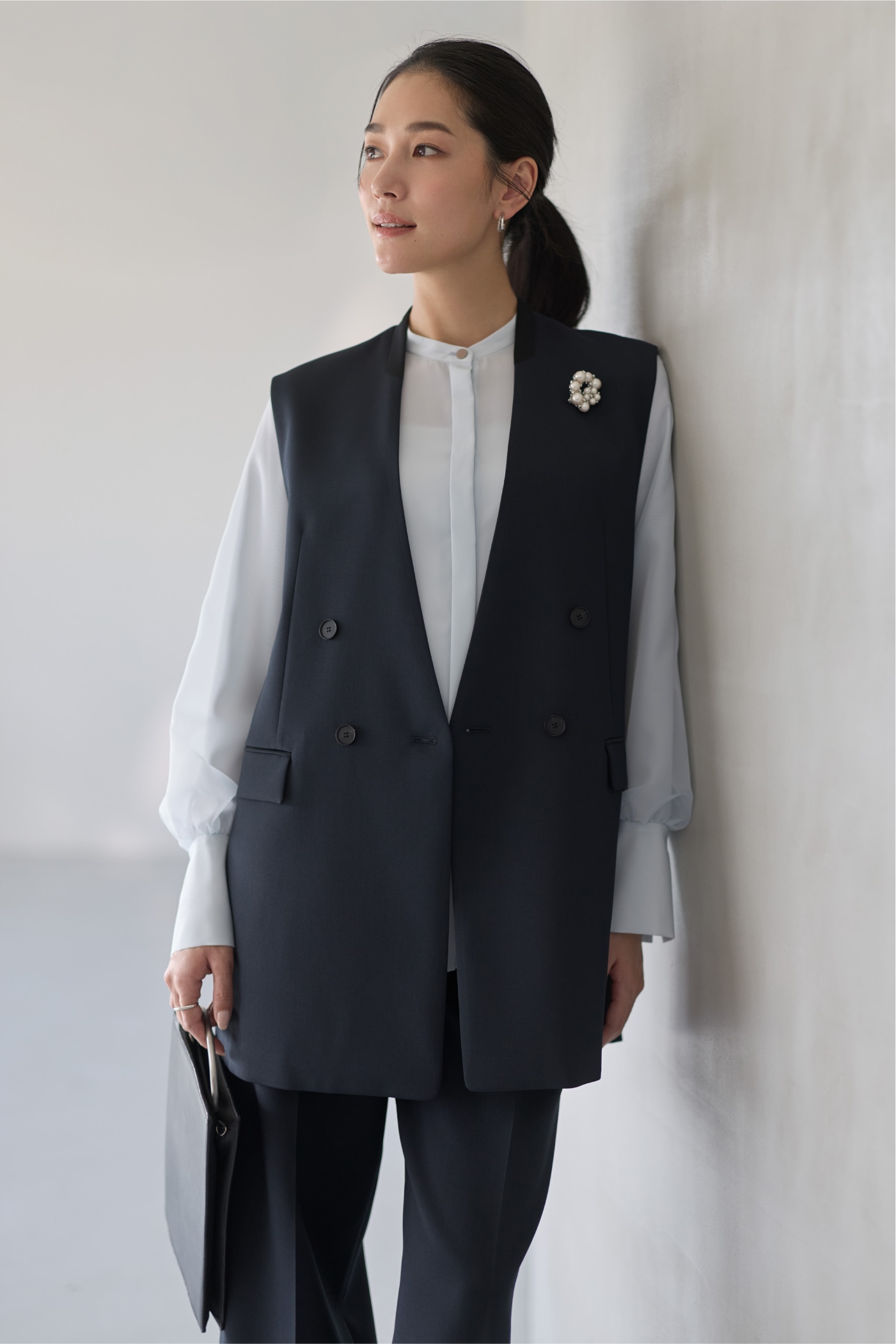 袖のシアーレイヤードがほんのり女性らしさを演出するブラウスに、デイリーにも使えるジレを合わせて、旬なセットアップスタイルに。華奢なブローチで特別感をプラス。