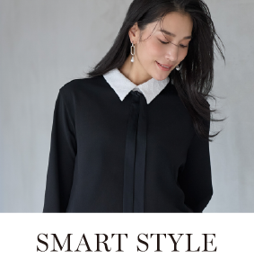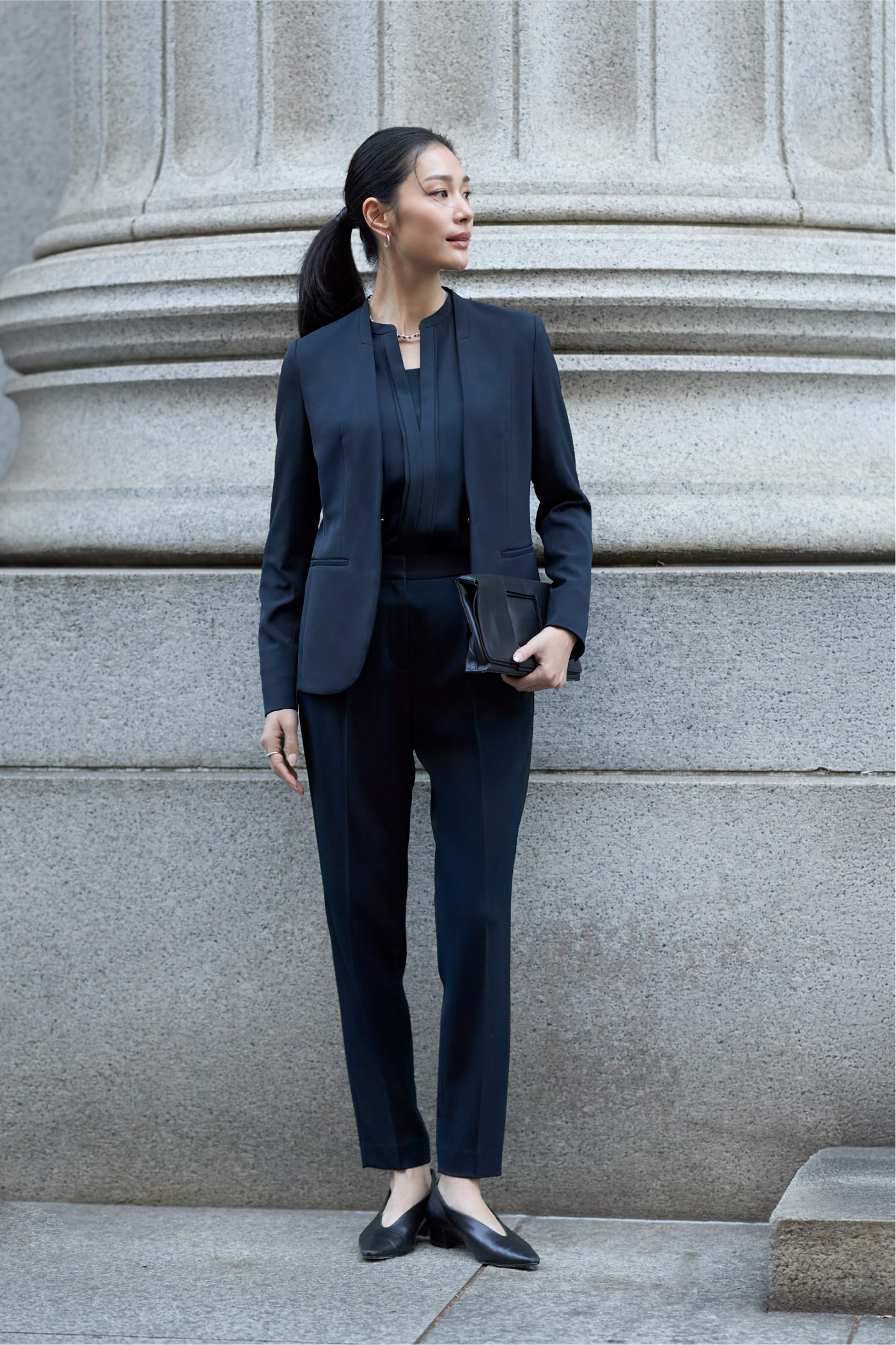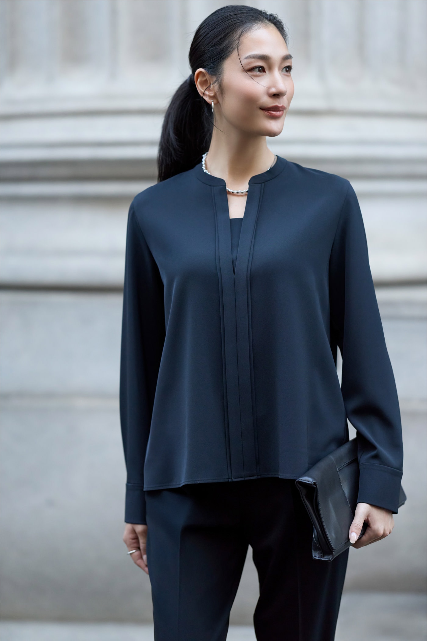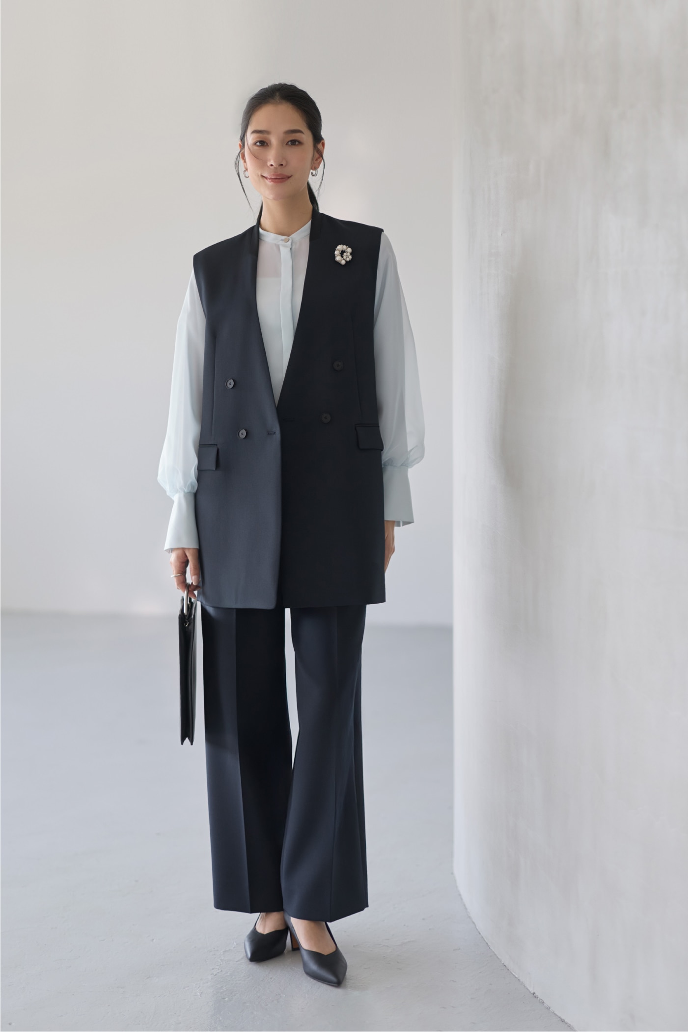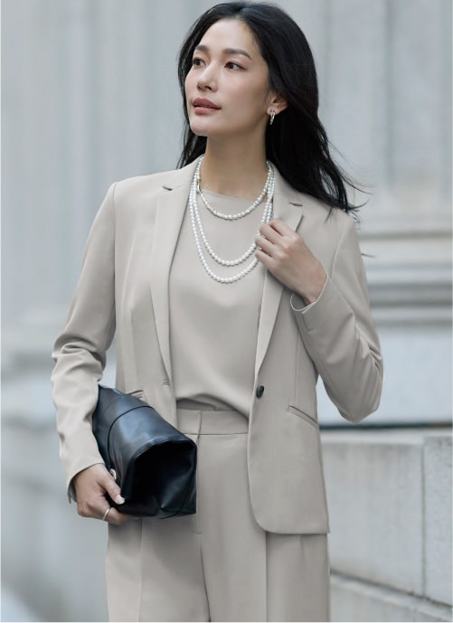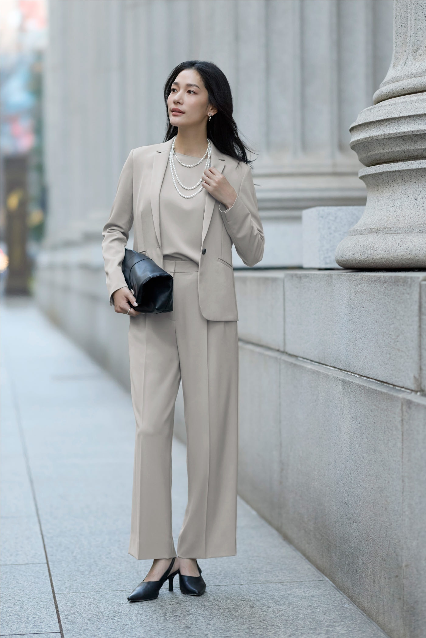 定番セットアップは知的な印象のキーネックブラウスをセレクト。ハレの日などのフォーマルスタイルにはもちろん、ジャケットを脱いでもサマになり、普段の通勤にも幅広いシーンで活躍。