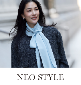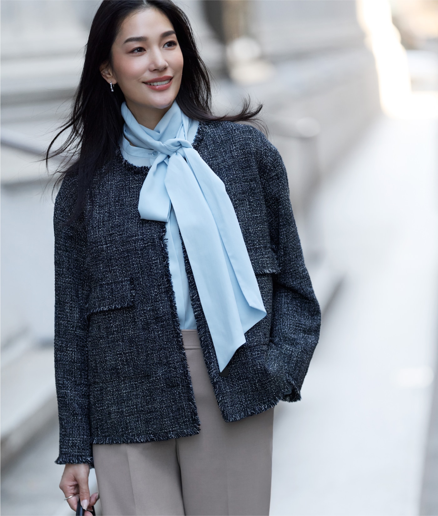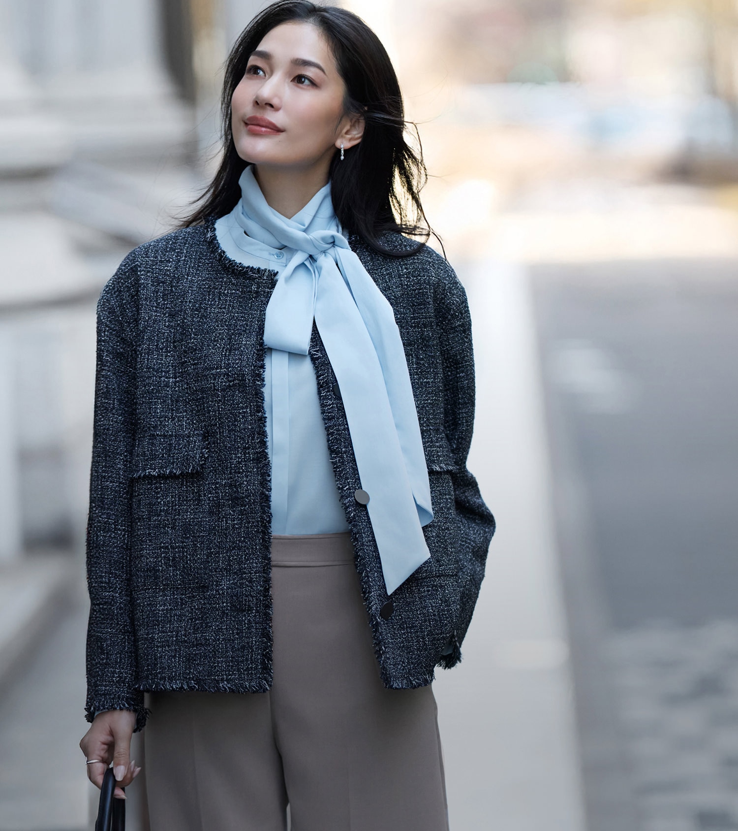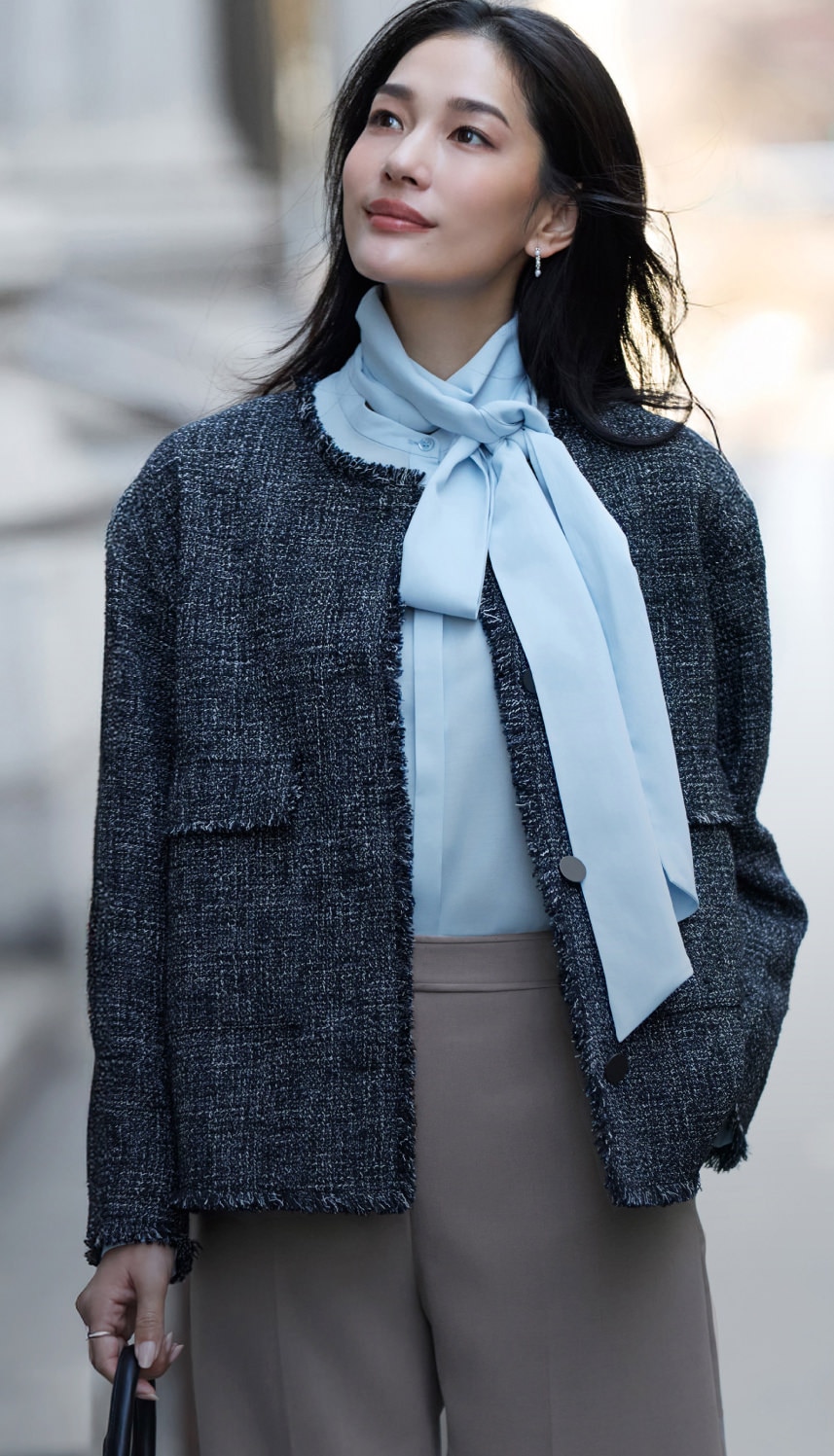王道ツイードジャケットの華やぎスタイルは、相性の良いボウタイブラウスにサックスブルーを選ぶだけで今年らしくアップデート。スタイリング次第でオンオフ幅広く着回して。
