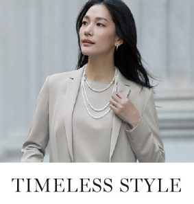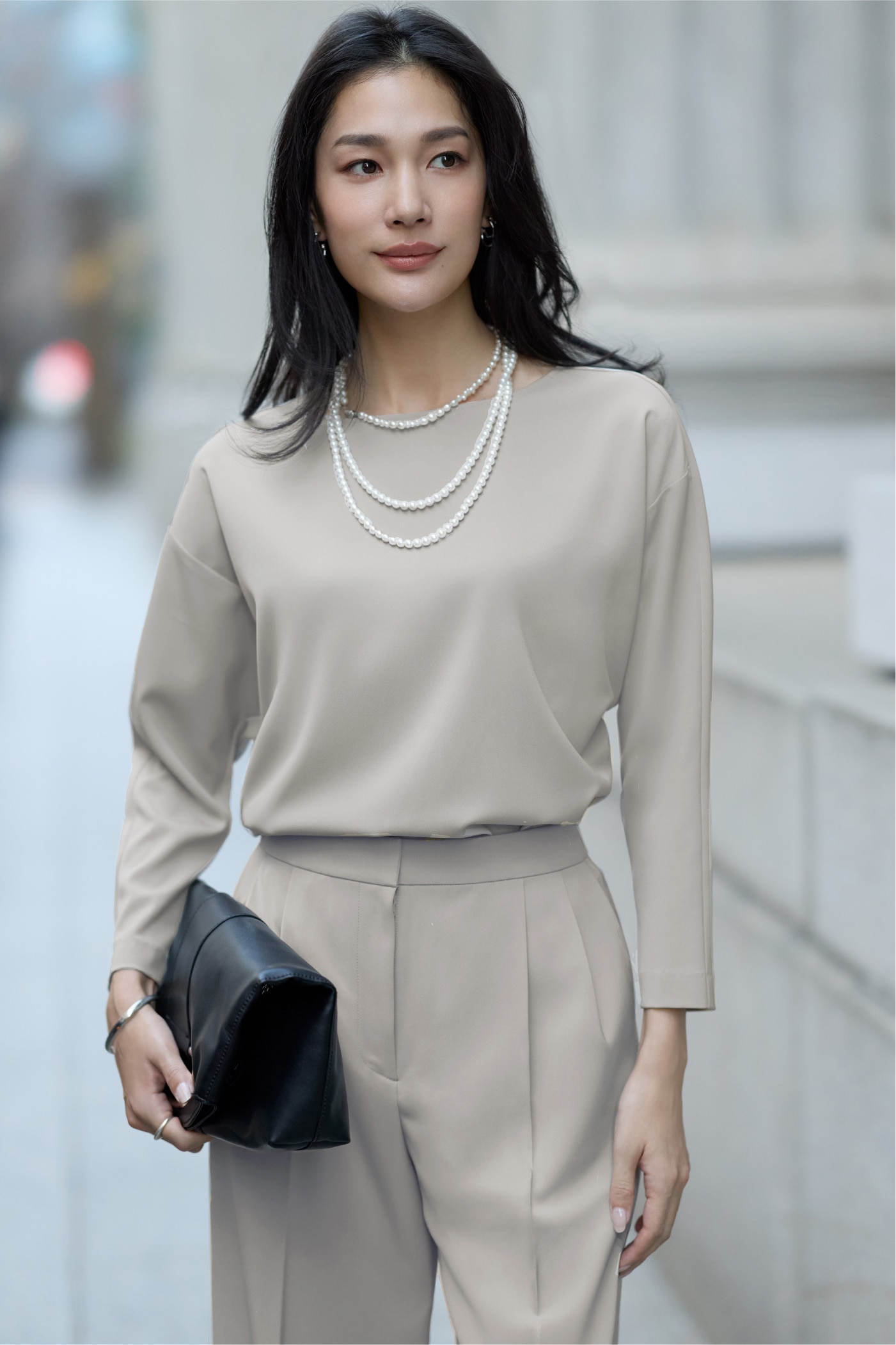 セレモニーにも人気のトープカラーのセットアップは、大胆にパールを重ねてもシックな大人の華やかさを演出。合わせたボートネックブラウスは、きちんと感がありながらも、気軽に着こなせる1枚。