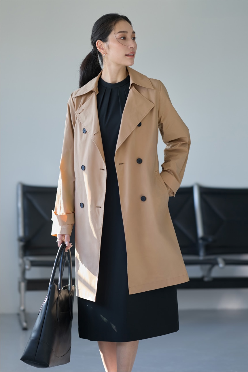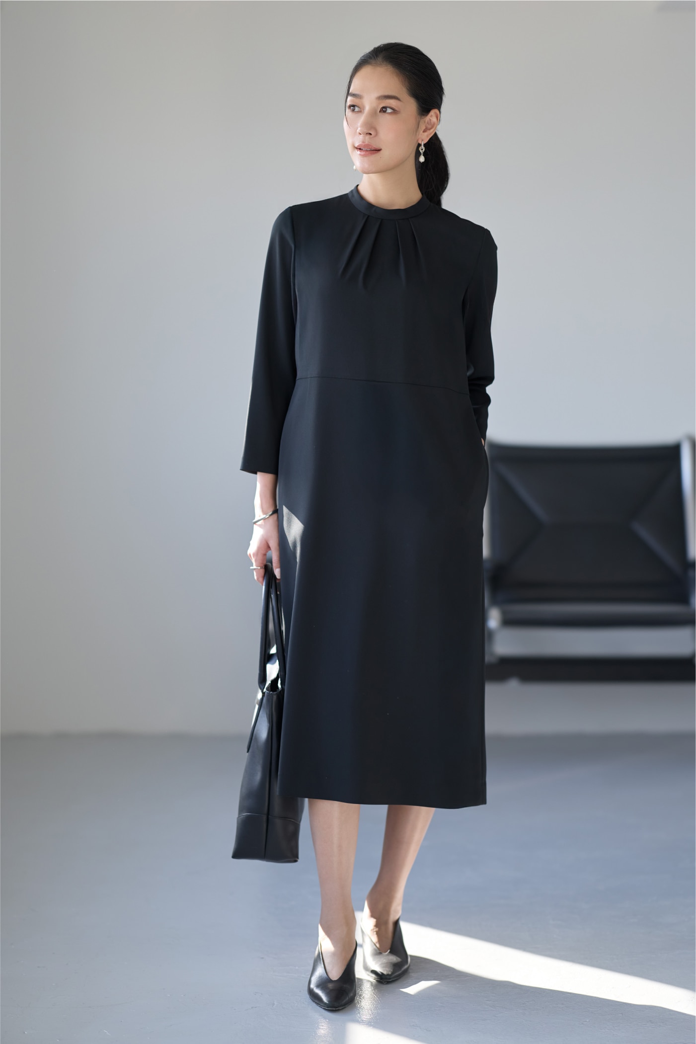 襟元のタックやウエストの切り替えデザインで、立体的な美シルエットが叶うワンピースは、ノージャケットでも、アウターを着ても好印象に決まる。ストレスフリーでシワにもなりにくく、シーズンレス・シーンレスに活躍。