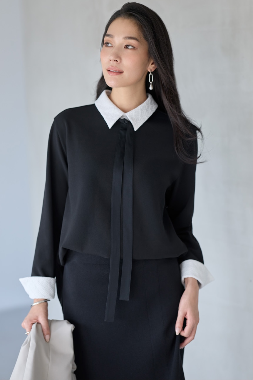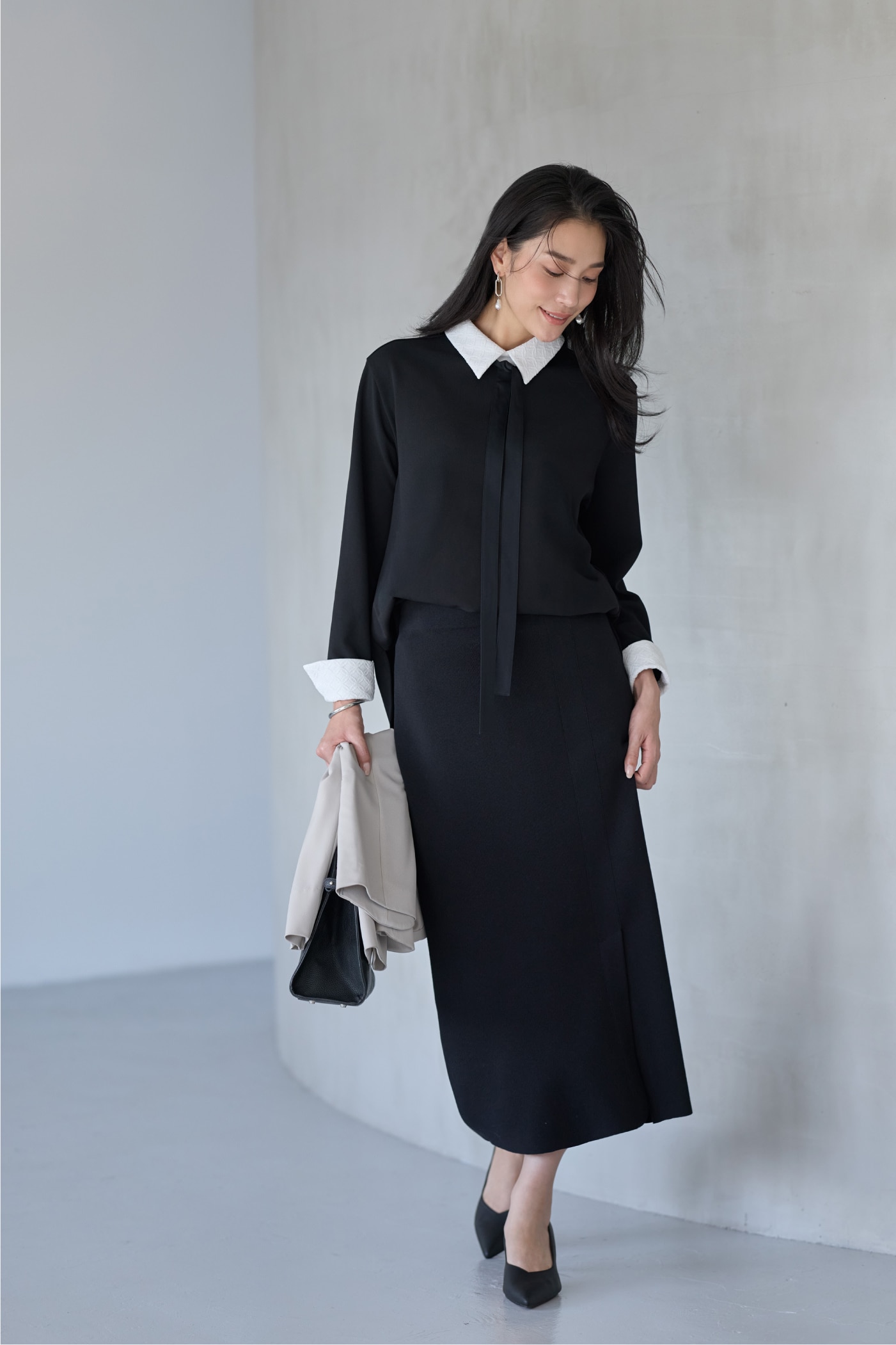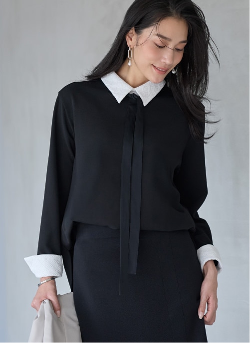 襟や袖裏の配色レースと揺れるサテン調のボウタイが、着るだけで華やかさを演出。きちんと見えながらもイージーな着心地のニットスカートを合わせて、程よく緊張感のあるシーンにも自由な着こなしを。