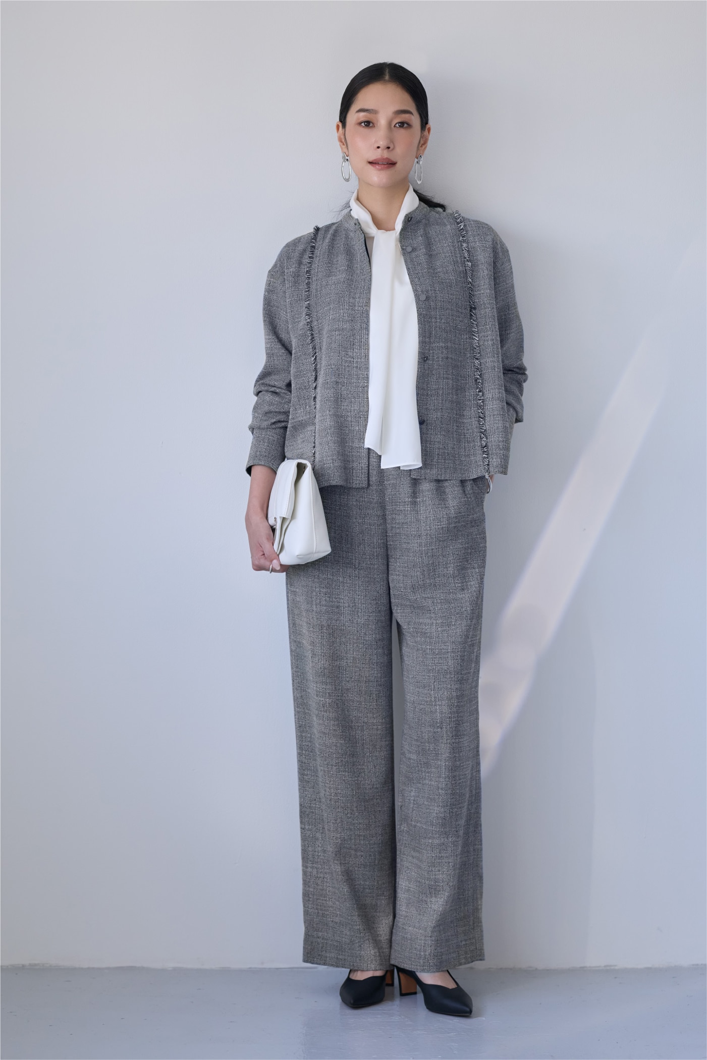 フリンジディテールを効かせた、肩肘張らないリラクシーなツイードシャツのセットアップ。サテン調のボウタイブラウスを重ねれば、一気にフォーマルムードに。