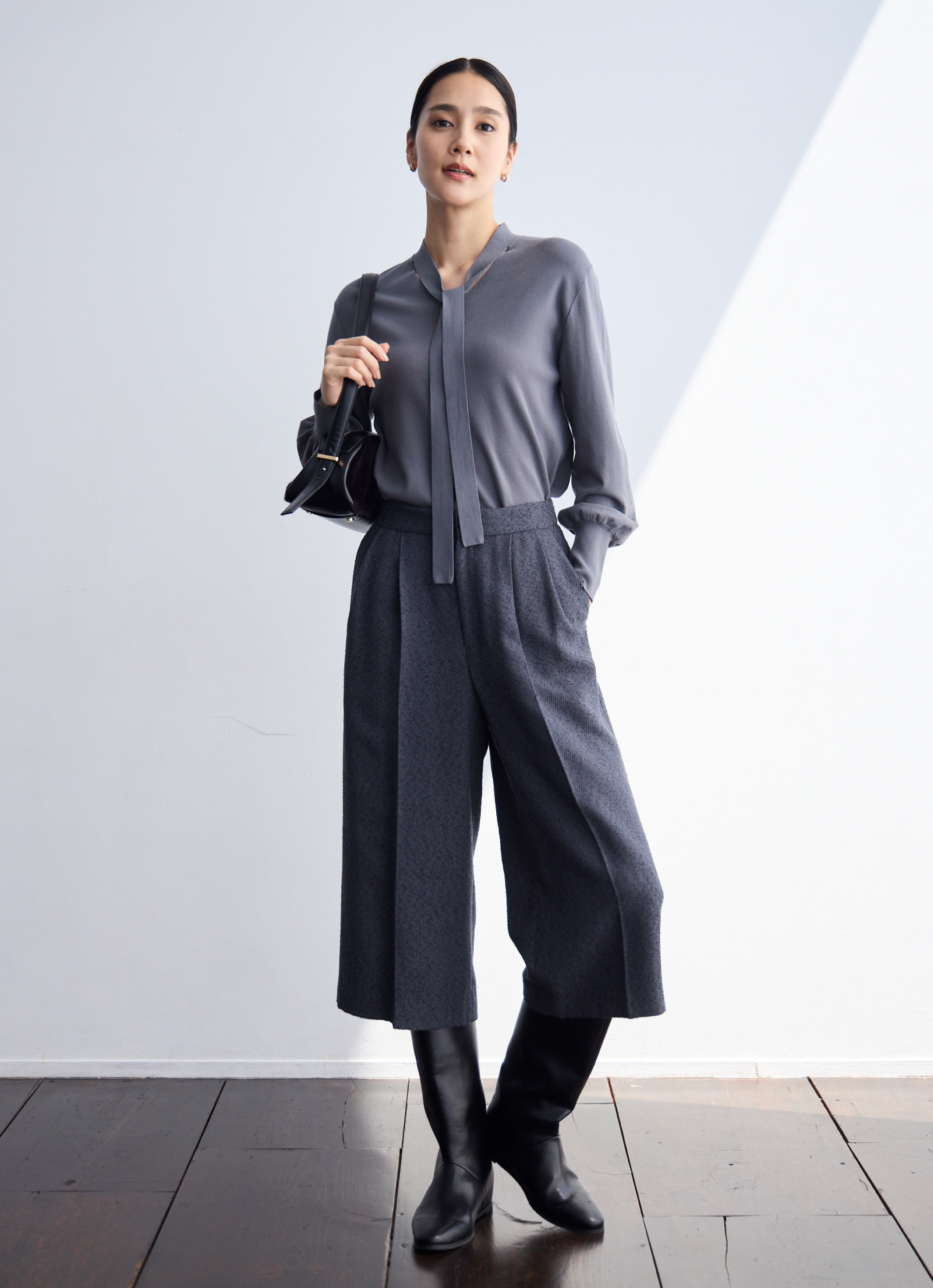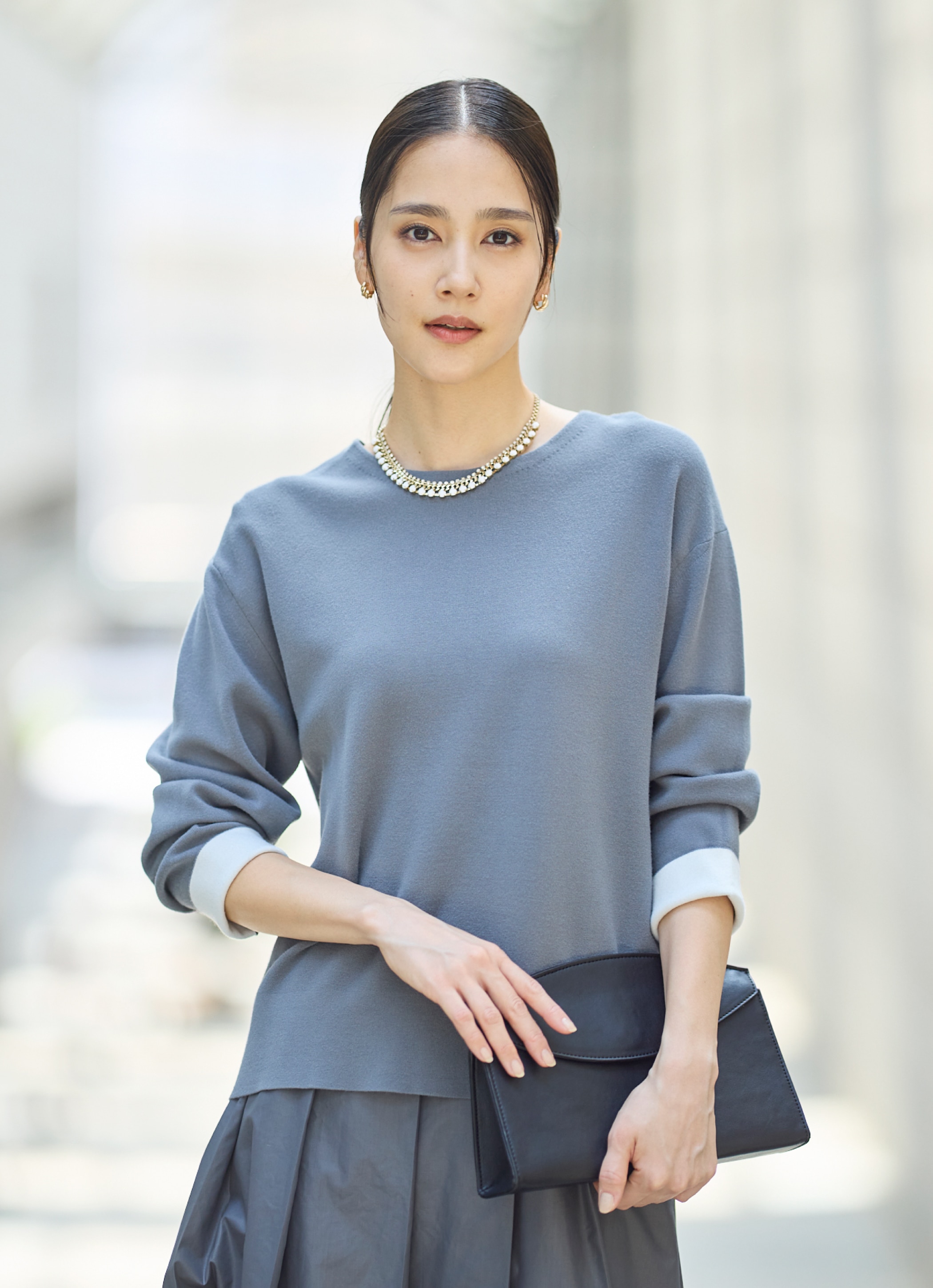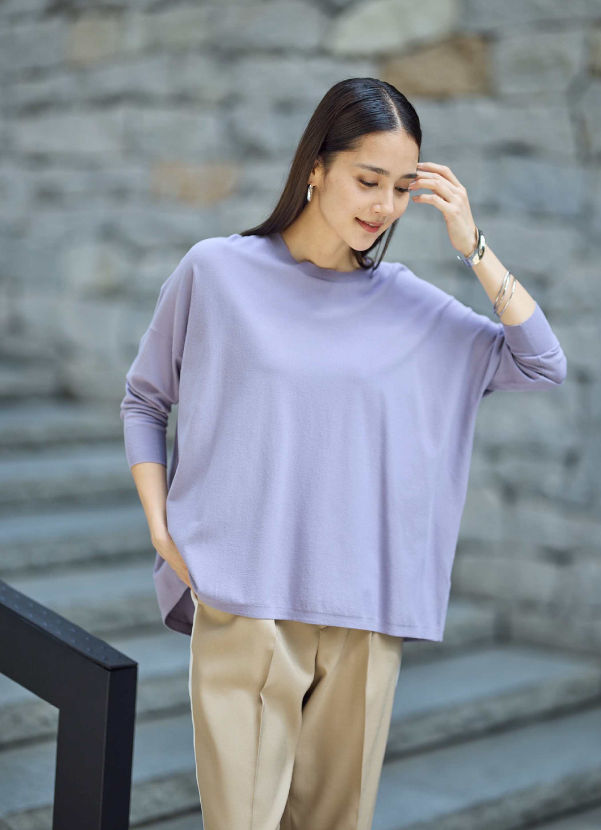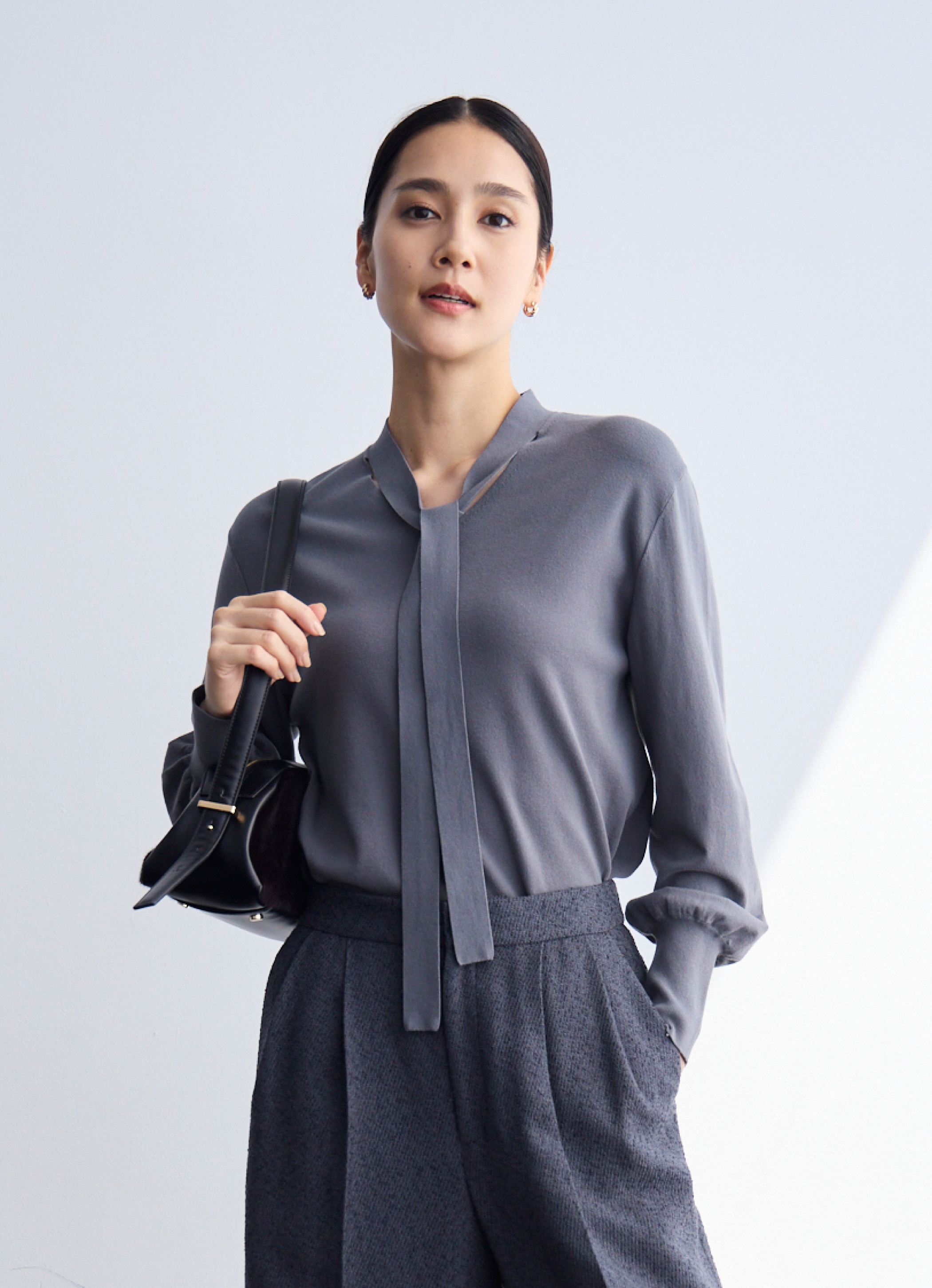 レーヨンストレッチの落ち感と、首元のボウタイディテールがブラウスのような印象に仕上げてくれるニット。ニットならではの快適さを秘めつつ、オフィスやディナーまで、エフォートレスに美しさを叶える一枚です。
