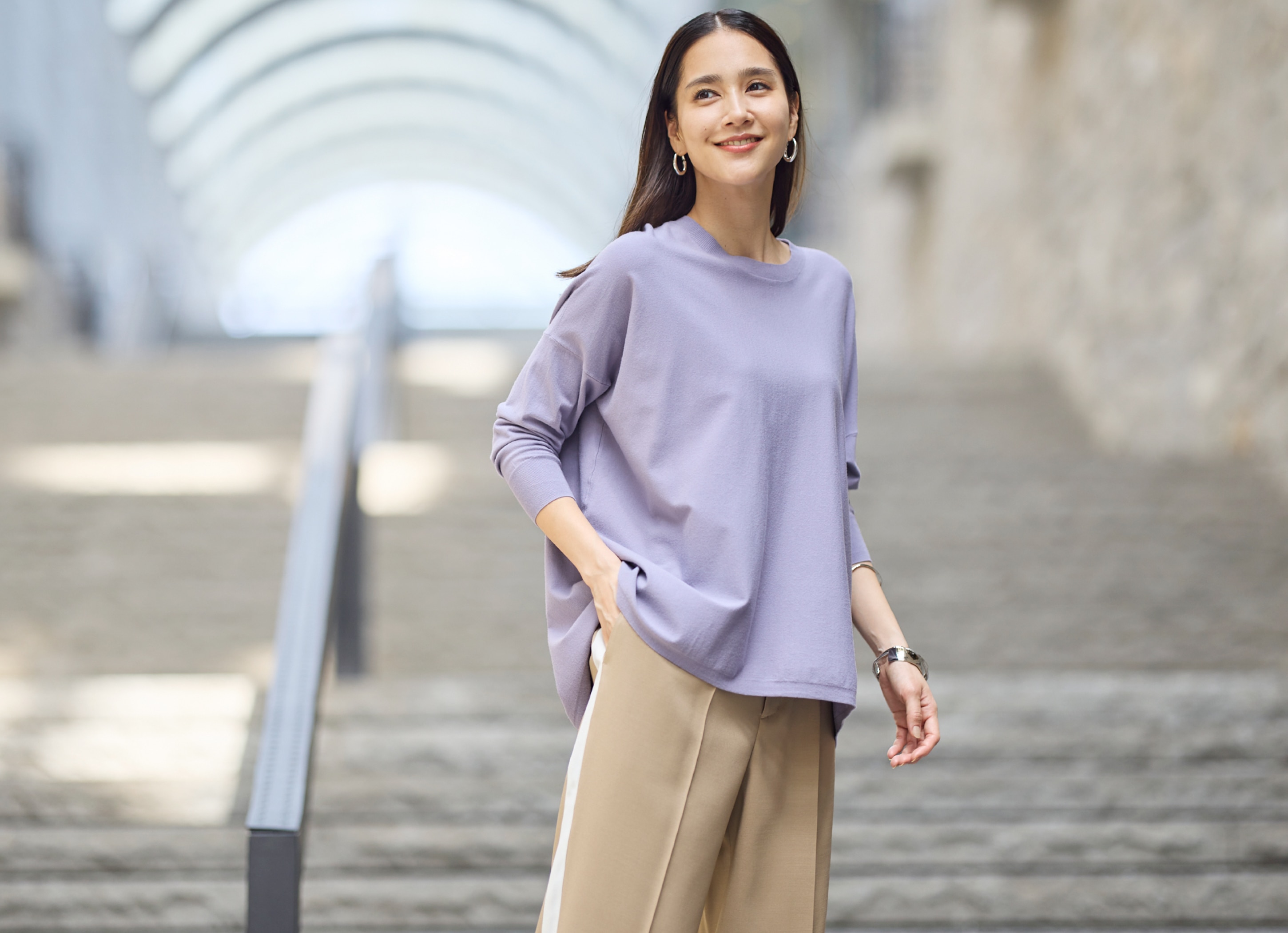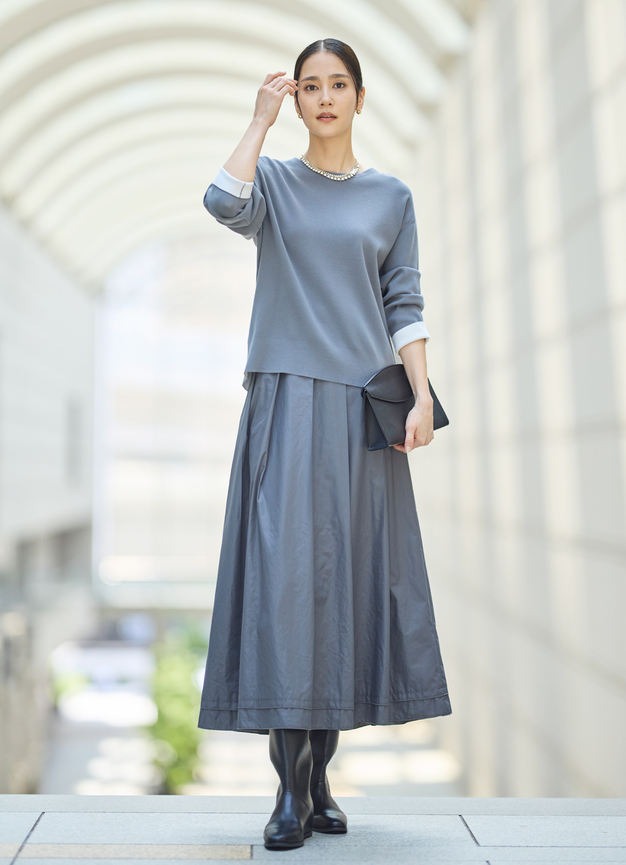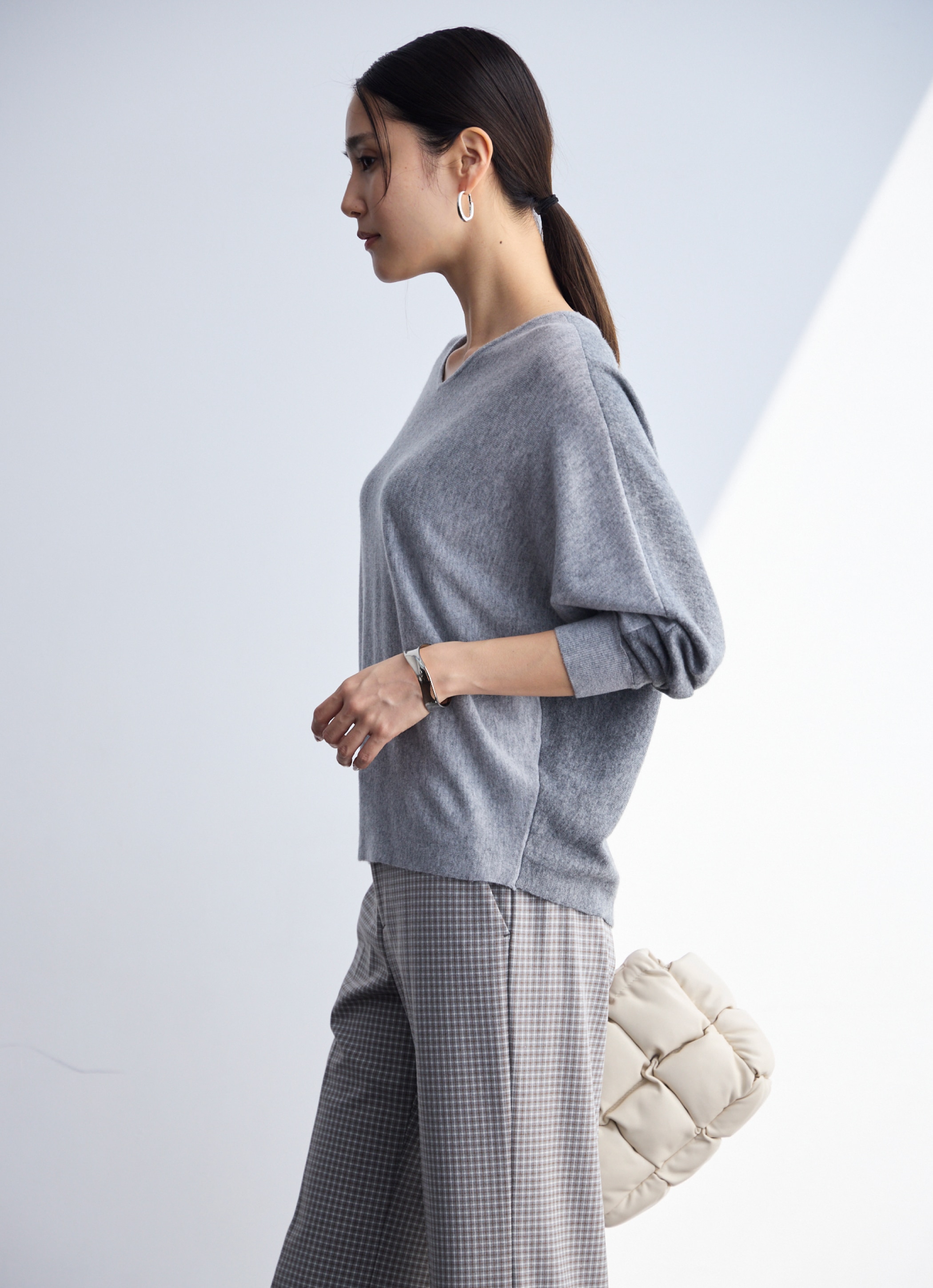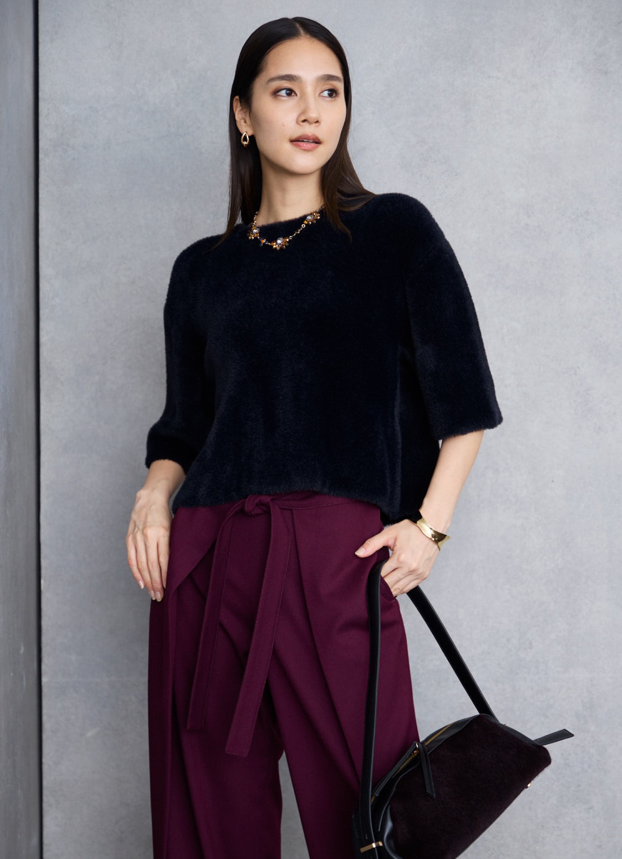 レーヨンストレッチの落ち感と、首元のボウタイディテールがブラウスのような印象に仕上げてくれるニット。ニットならではの快適さを秘めつつ、オフィスやディナーまで、エフォートレスに美しさを叶える一枚です。