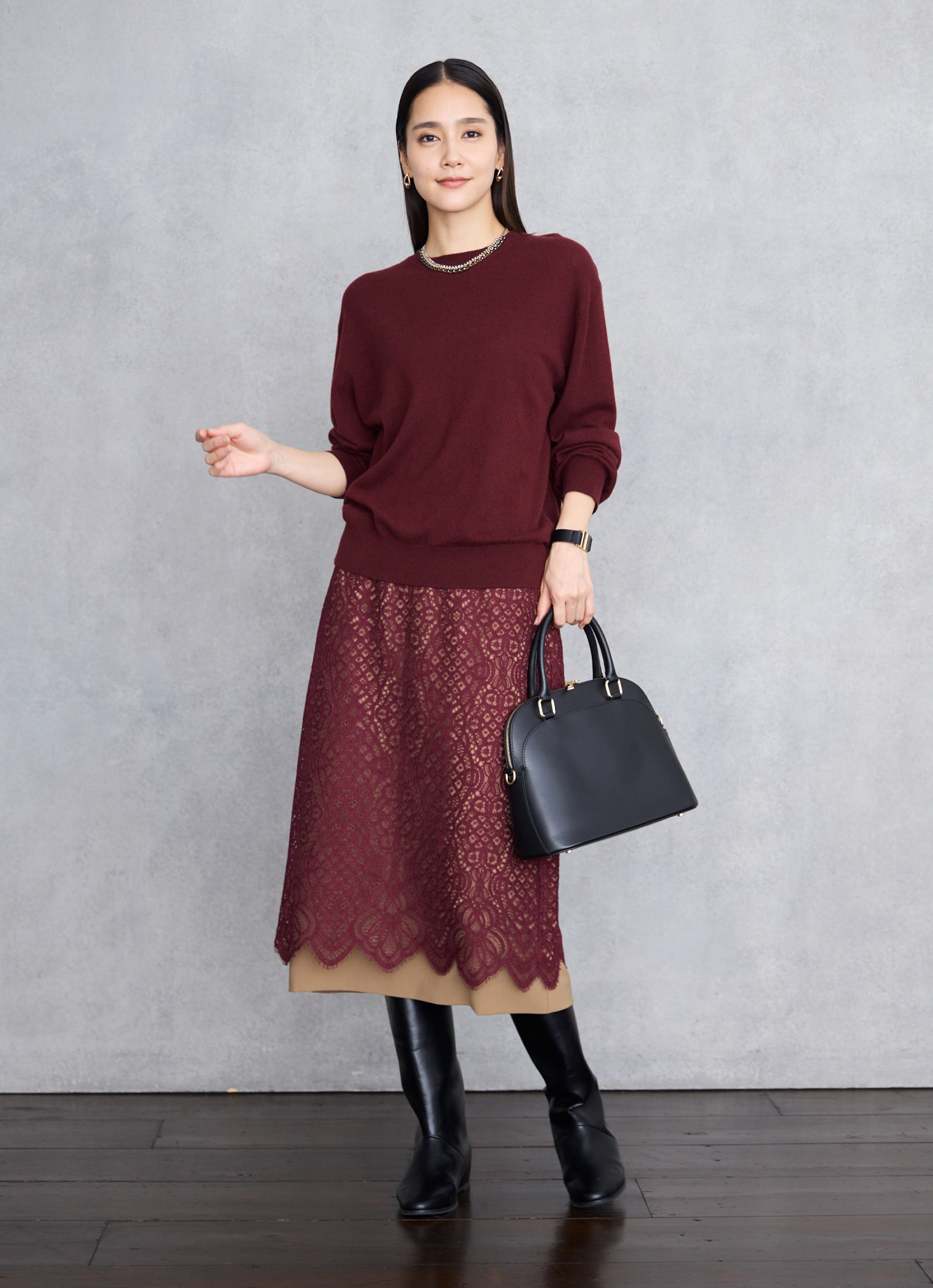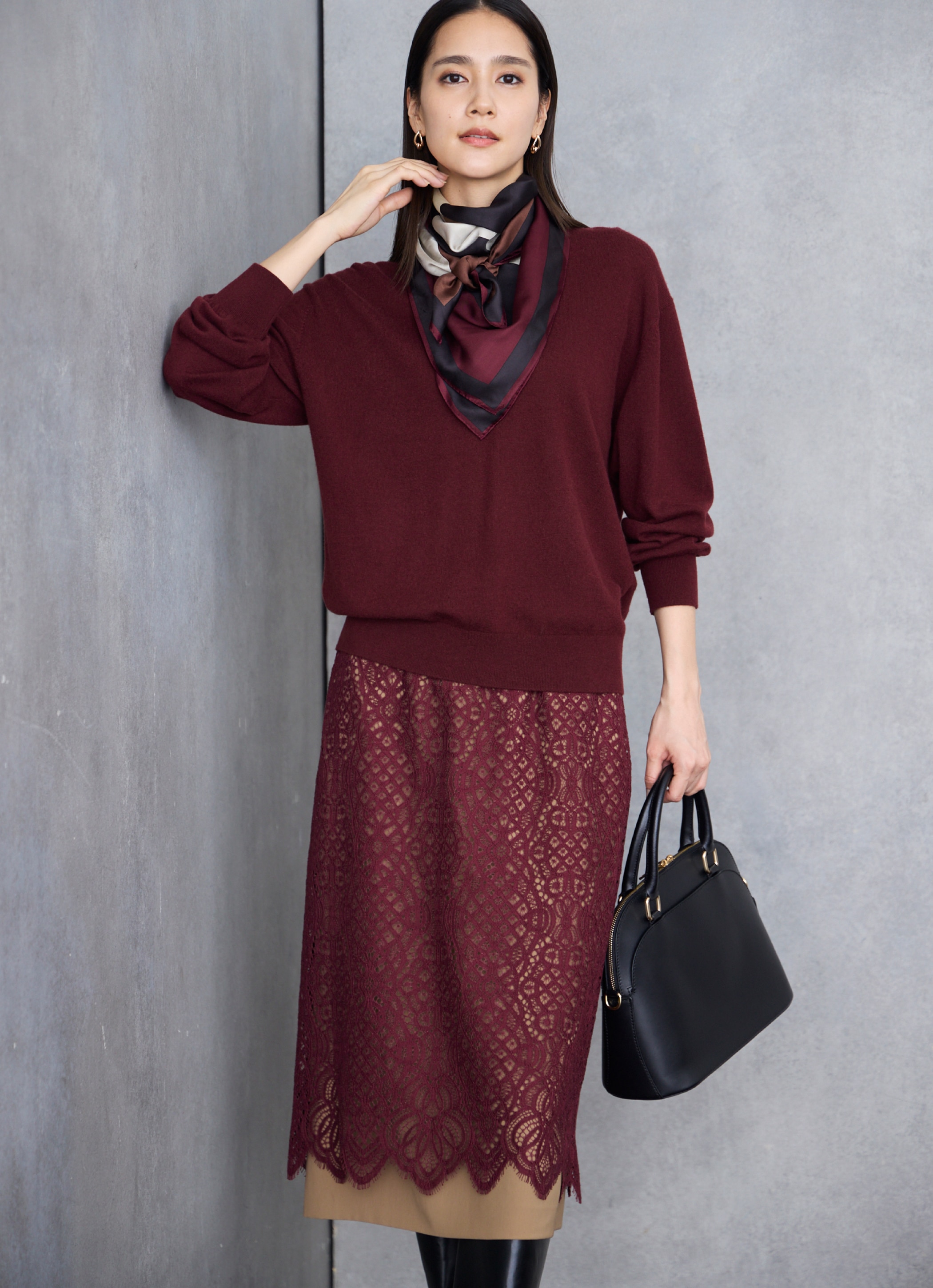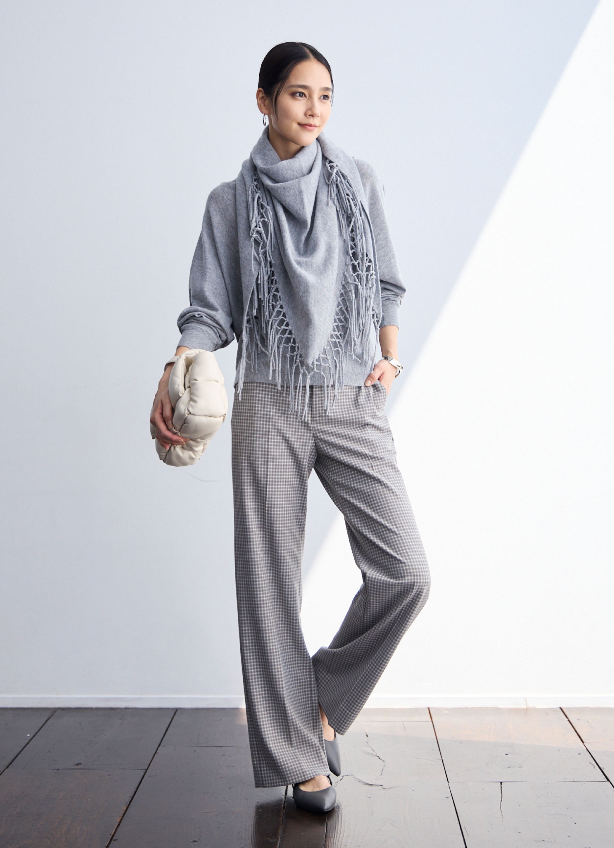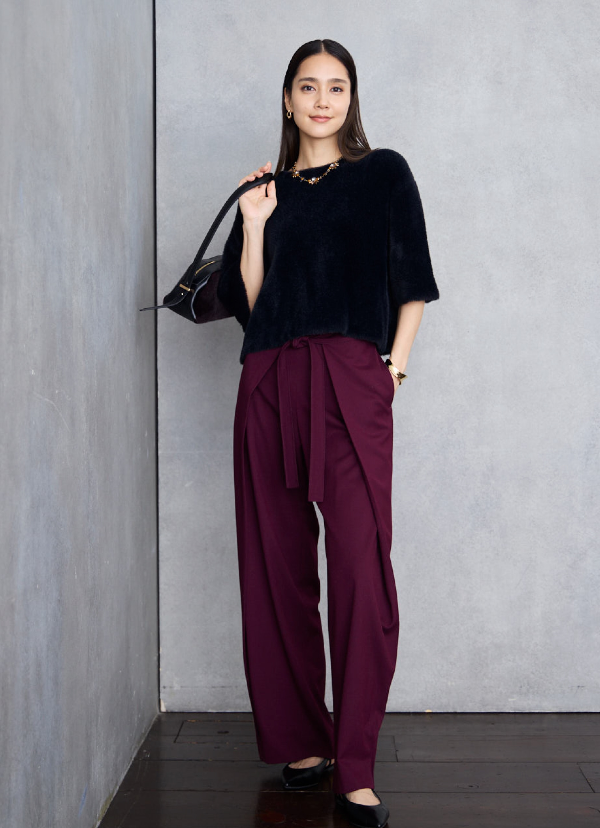 レーヨンストレッチの落ち感と、首元のボウタイディテールがブラウスのような印象に仕上げてくれるニット。ニットならではの快適さを秘めつつ、オフィスやディナーまで、エフォートレスに美しさを叶える一枚です。