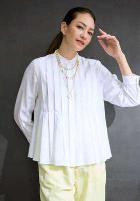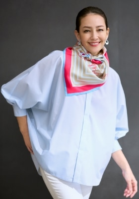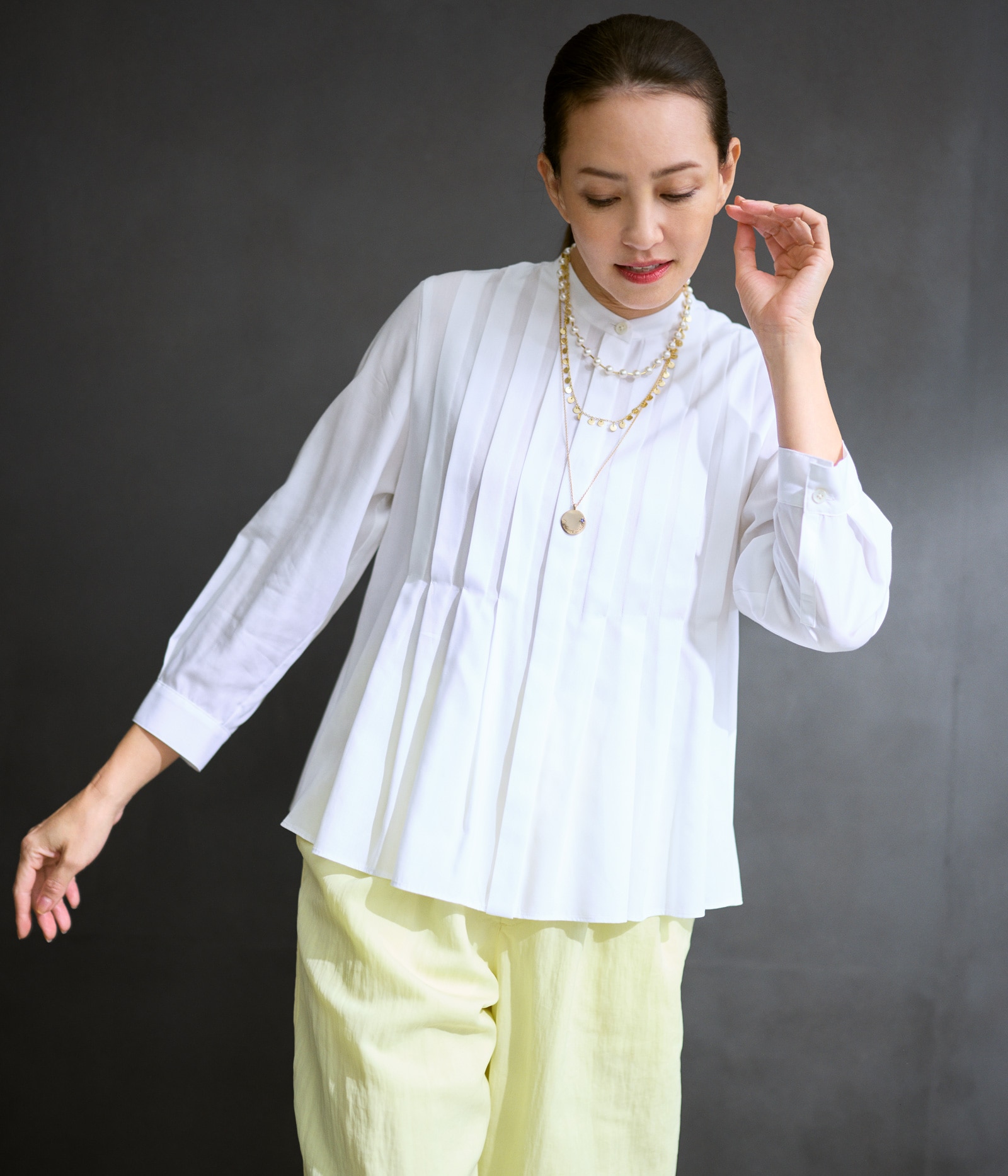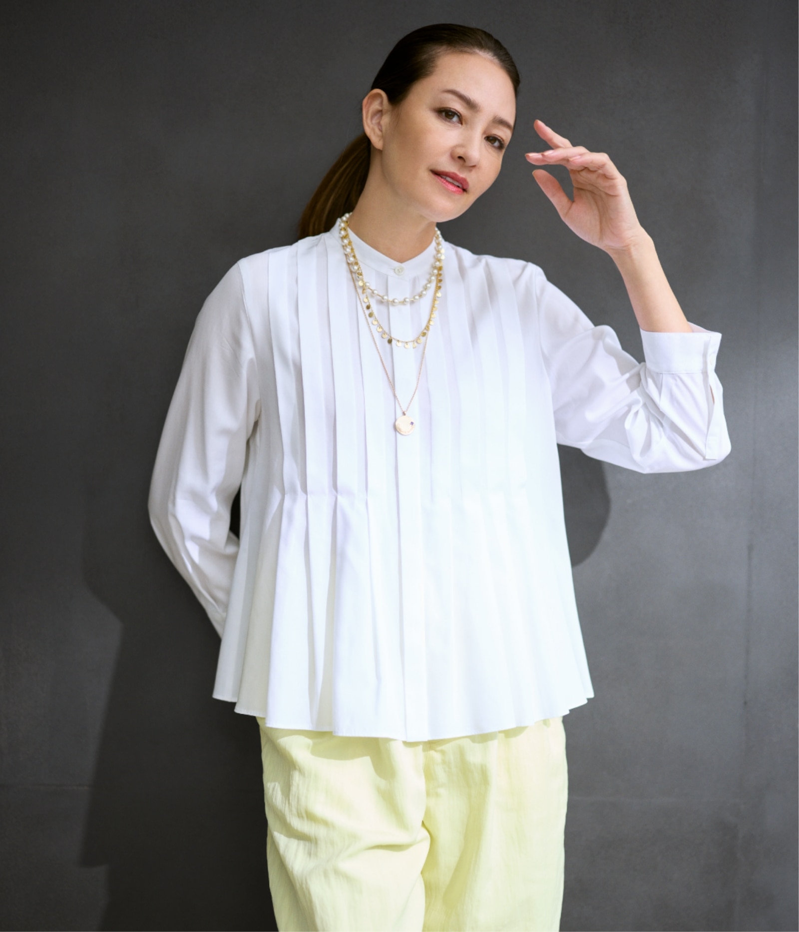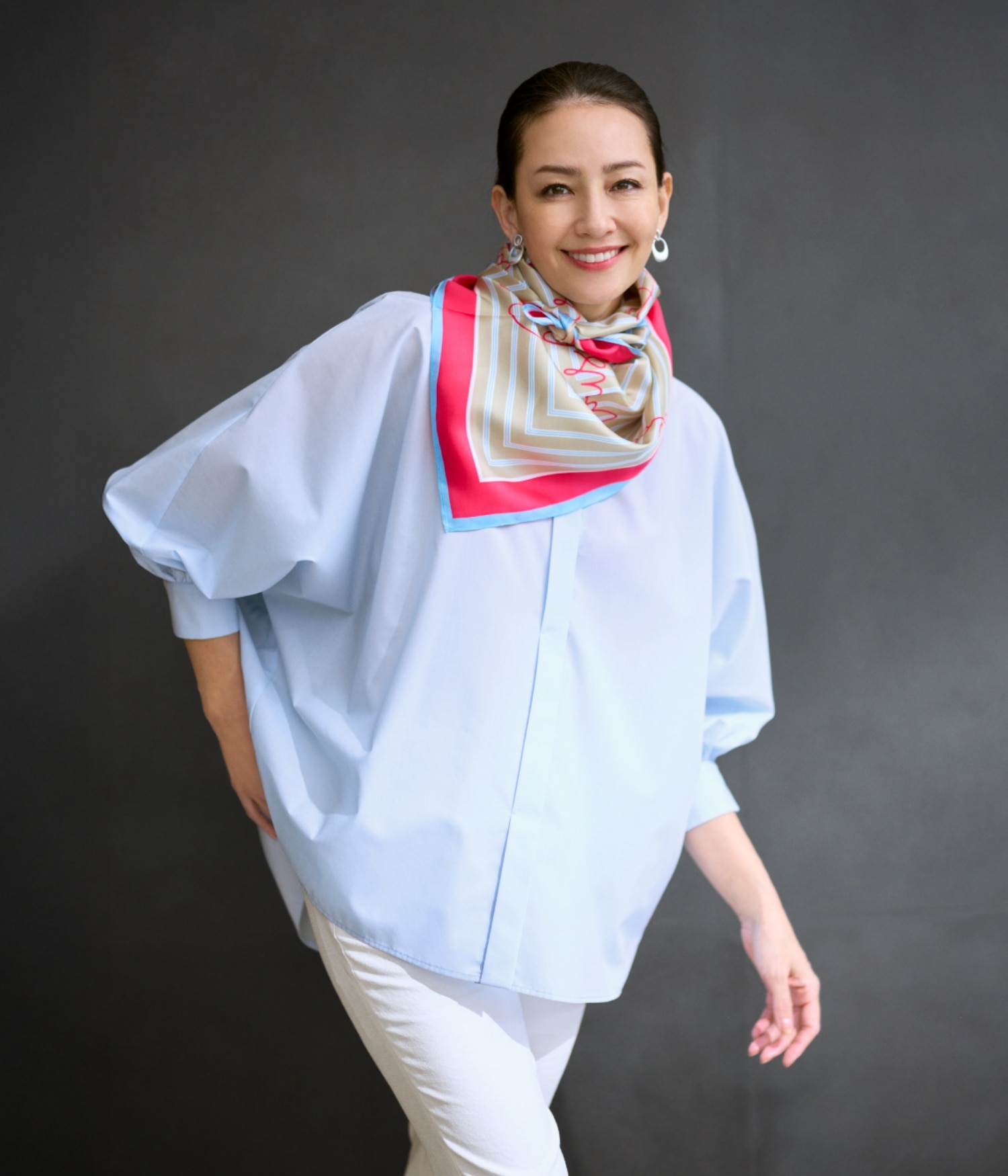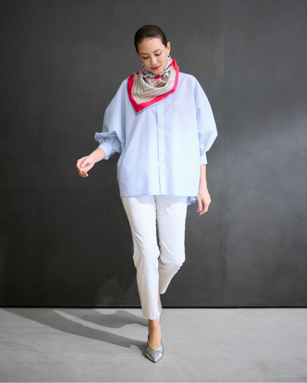 シルクスカーフとも合う上質な素材ながらも、シワになりにくくイージーケアなのもポイント。