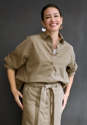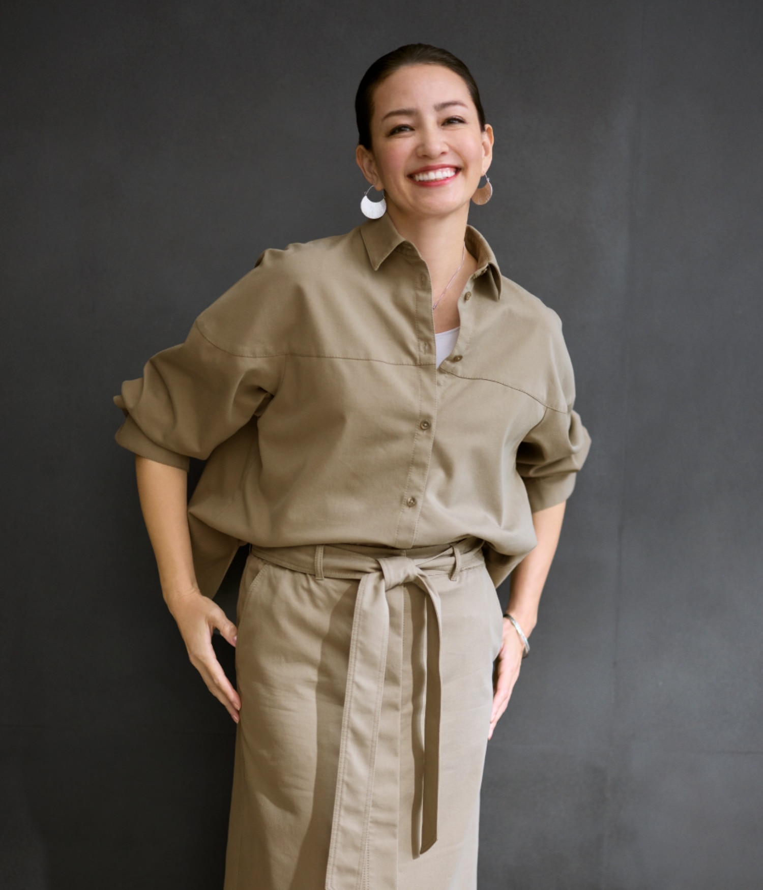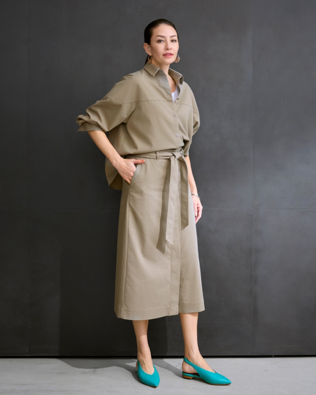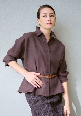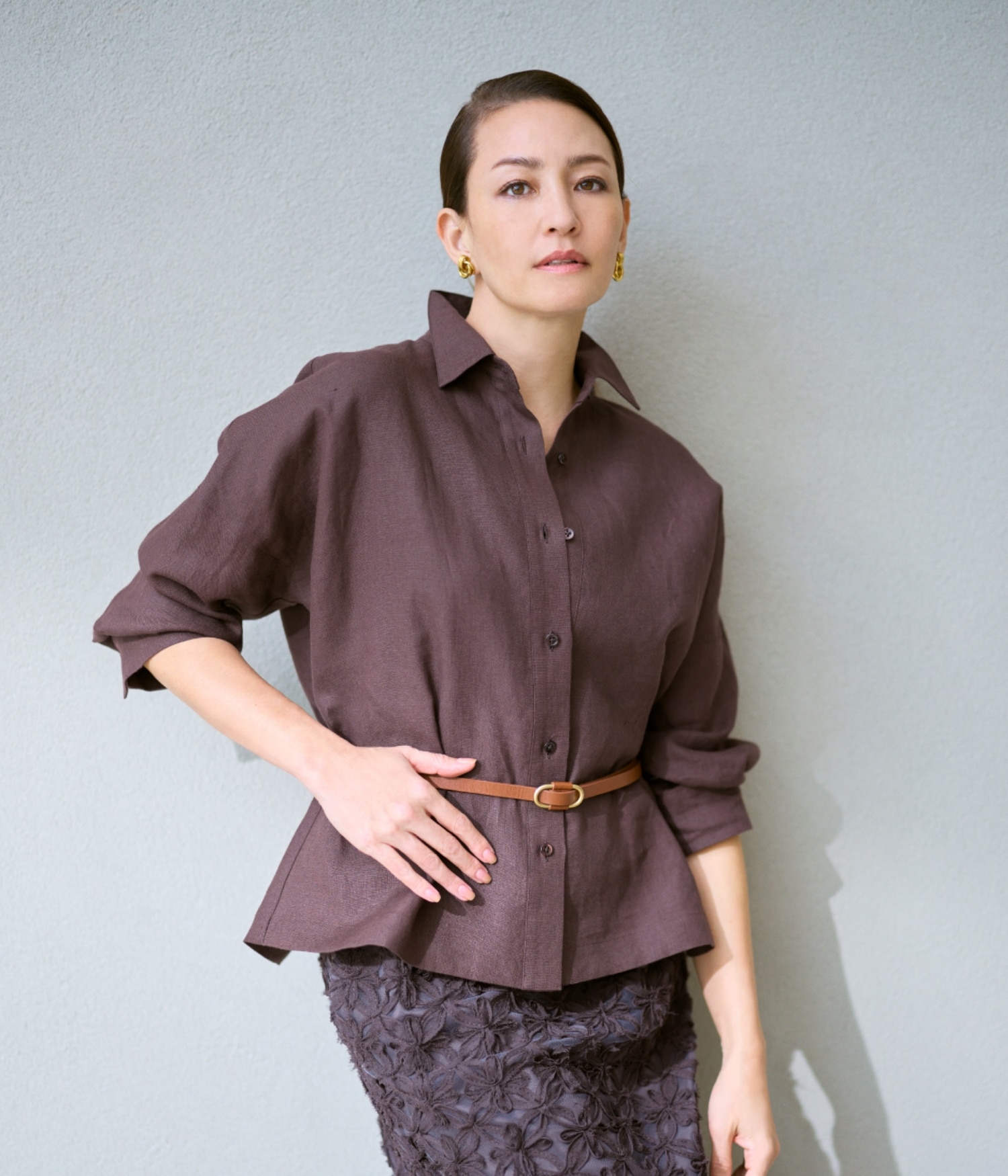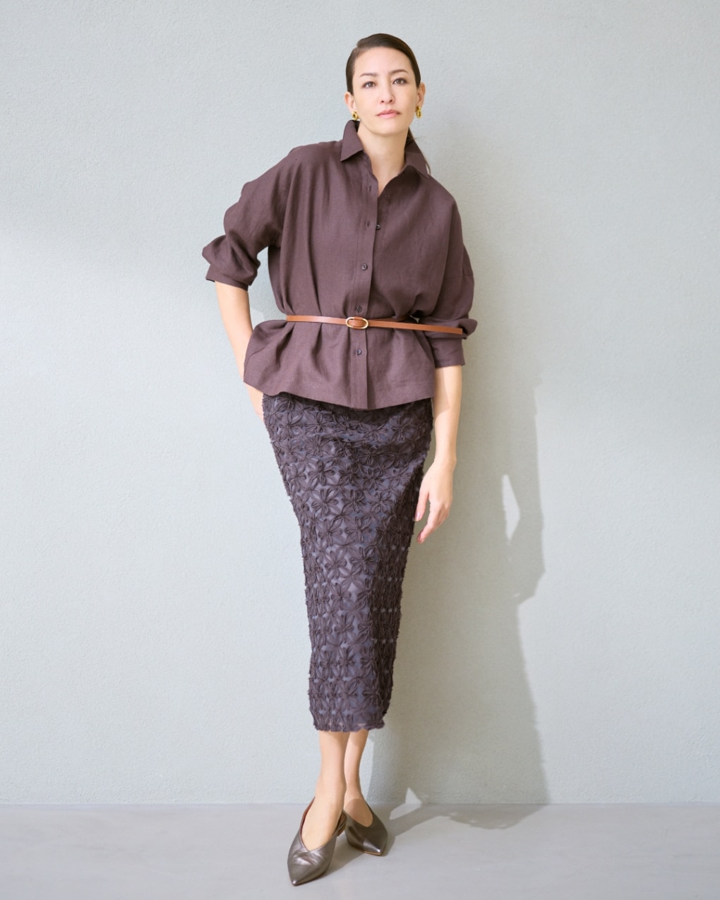 身幅を大きめにとった抜け感のあるリネンシャツも、深みのあるブラウンを選べば都会的な印象に。光沢感と張りのある素材で仕立てているので、ベルトで絞った生地の表情もエレガント。