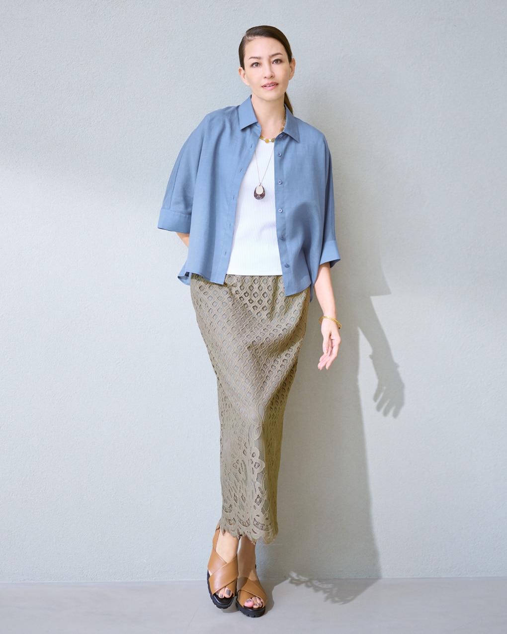トップスがフラットなぶん、立体感のあるレースを施したスカートなどと合わせてモードライクに着こなすのもおすすめです。