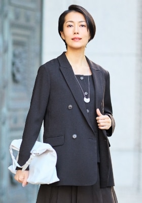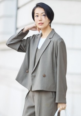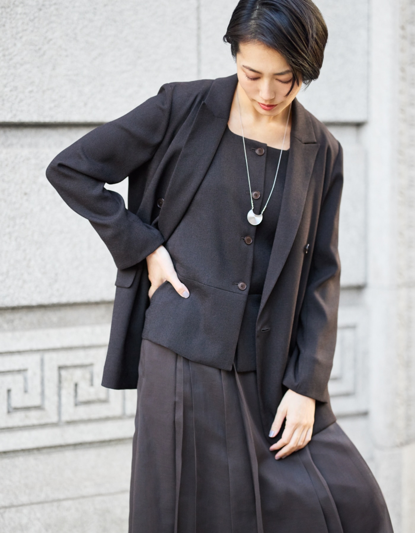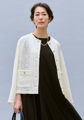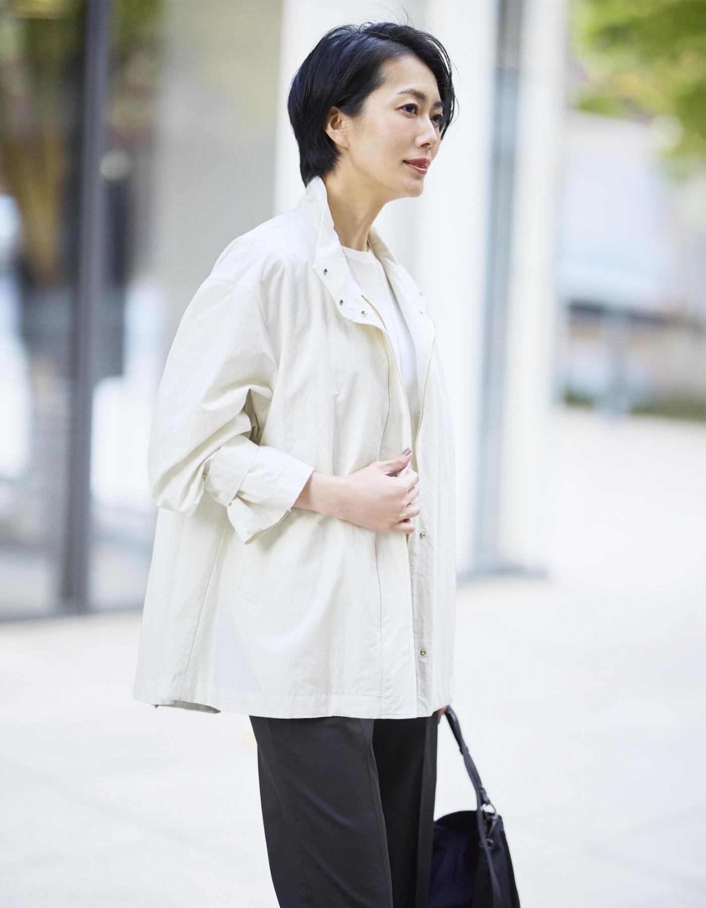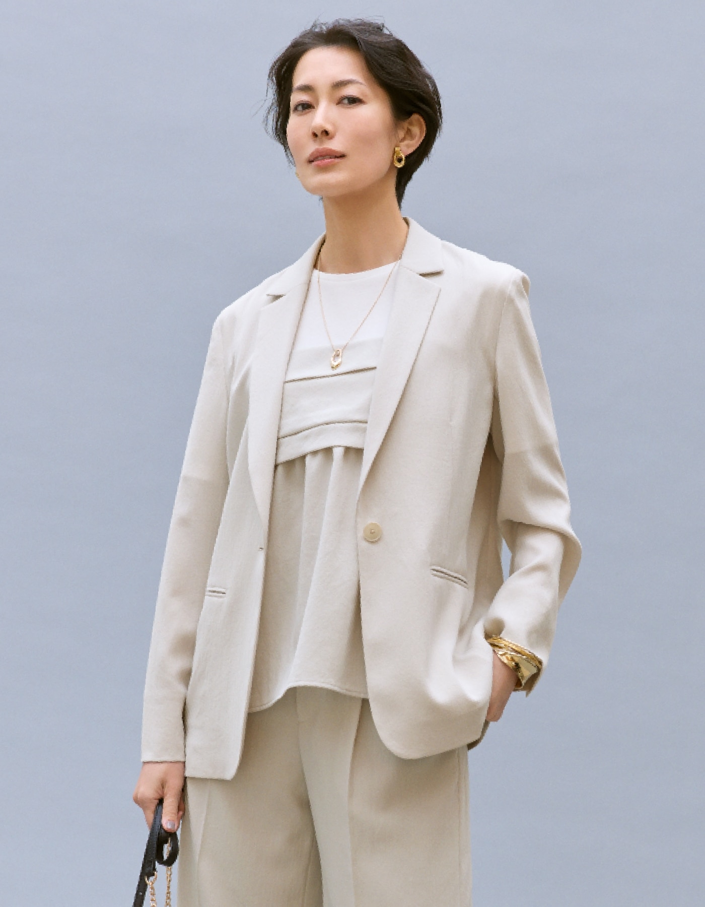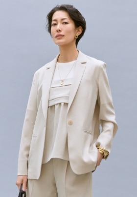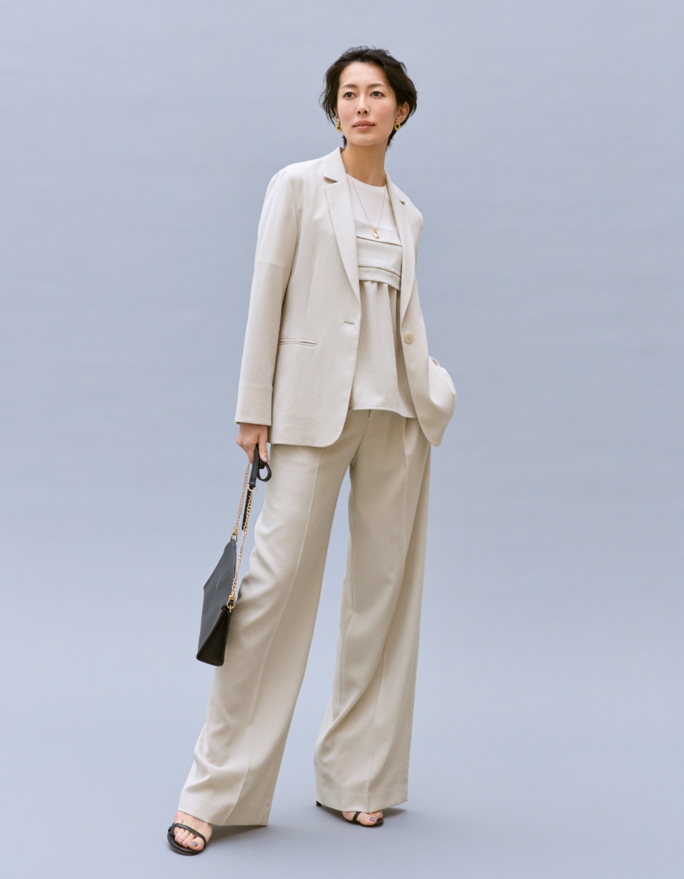 きちんと感のあるダブルブレストのジャケットを、今季は麻調の素材でリラクシカルに。ボクシーなシルエットでカーディガンのように軽く羽織れるアイテムに仕立てました。ドライタッチで夏まで着用でき、イージーケアなのもポイント。