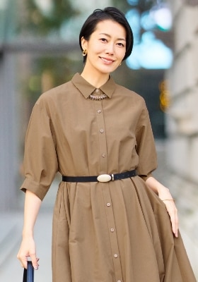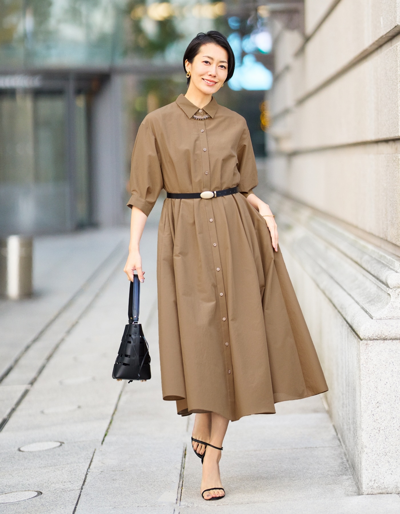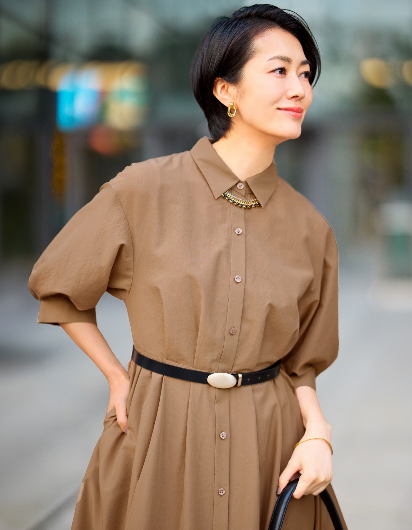 オフィススタイルにも映える品の良いブロンズカラーのシャツドレスは、たっぷりとしたドレープが作る奥行きのある表情も魅力的。シャリ感のある肌離れの良い素材で盛夏の快適さにもこだわりました。