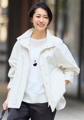 たっぷり分量をとったお袖コンシャスなミドル丈コートで春先のオフィススタイルを新鮮に。お顔周りをすっきりと見せる高めのスタンドカラーや裾にかけて広がるテントライン、軽量な素材感も特徴で、さっと羽織ってサマになる一枚。