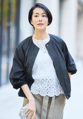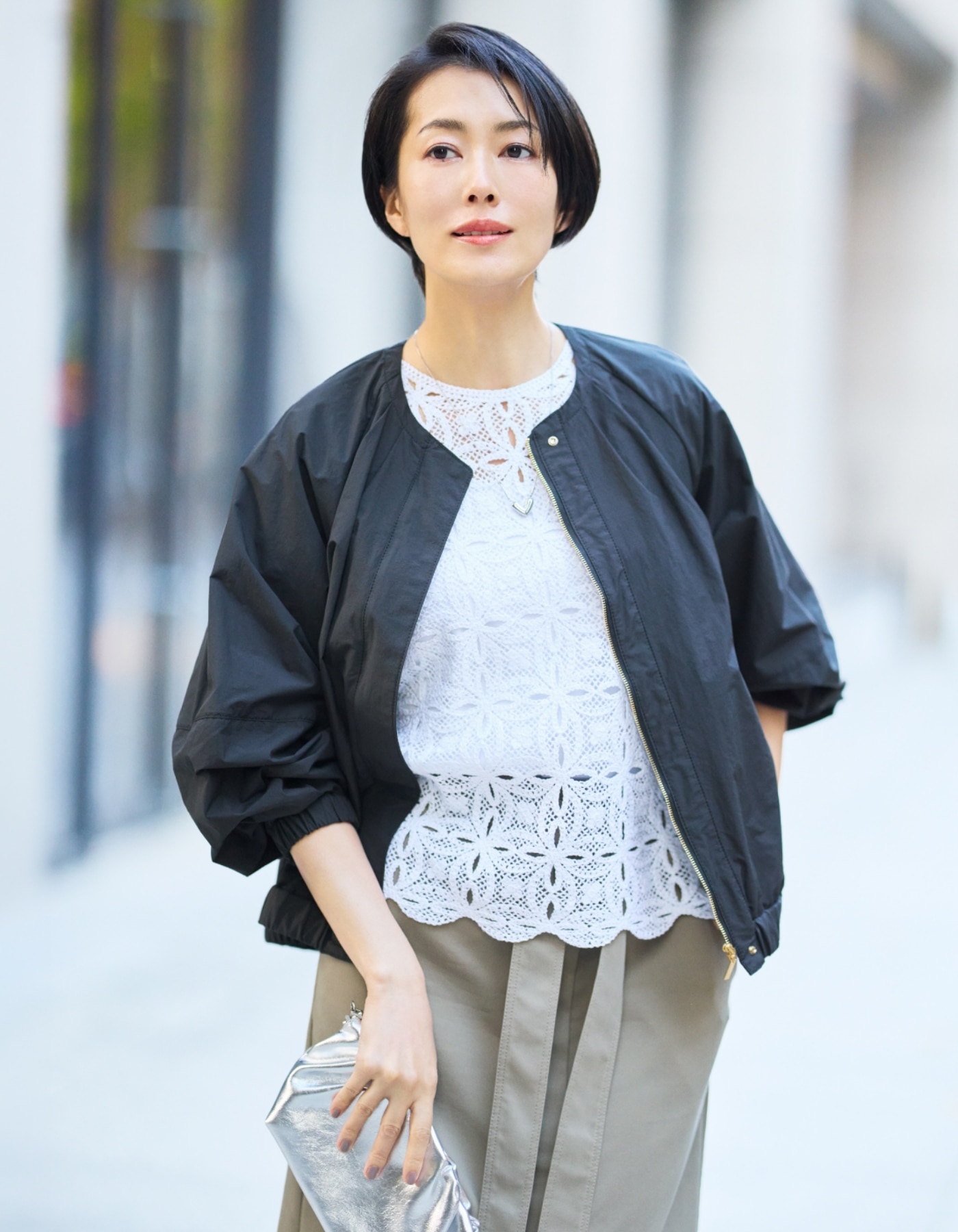 こうしたアウターに大人らしいレーシーなニットブラウスを合わせるのもおすすめ。立体感のある表情が特徴で、春らしさをトッピング。