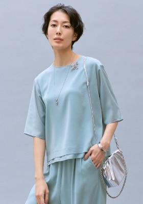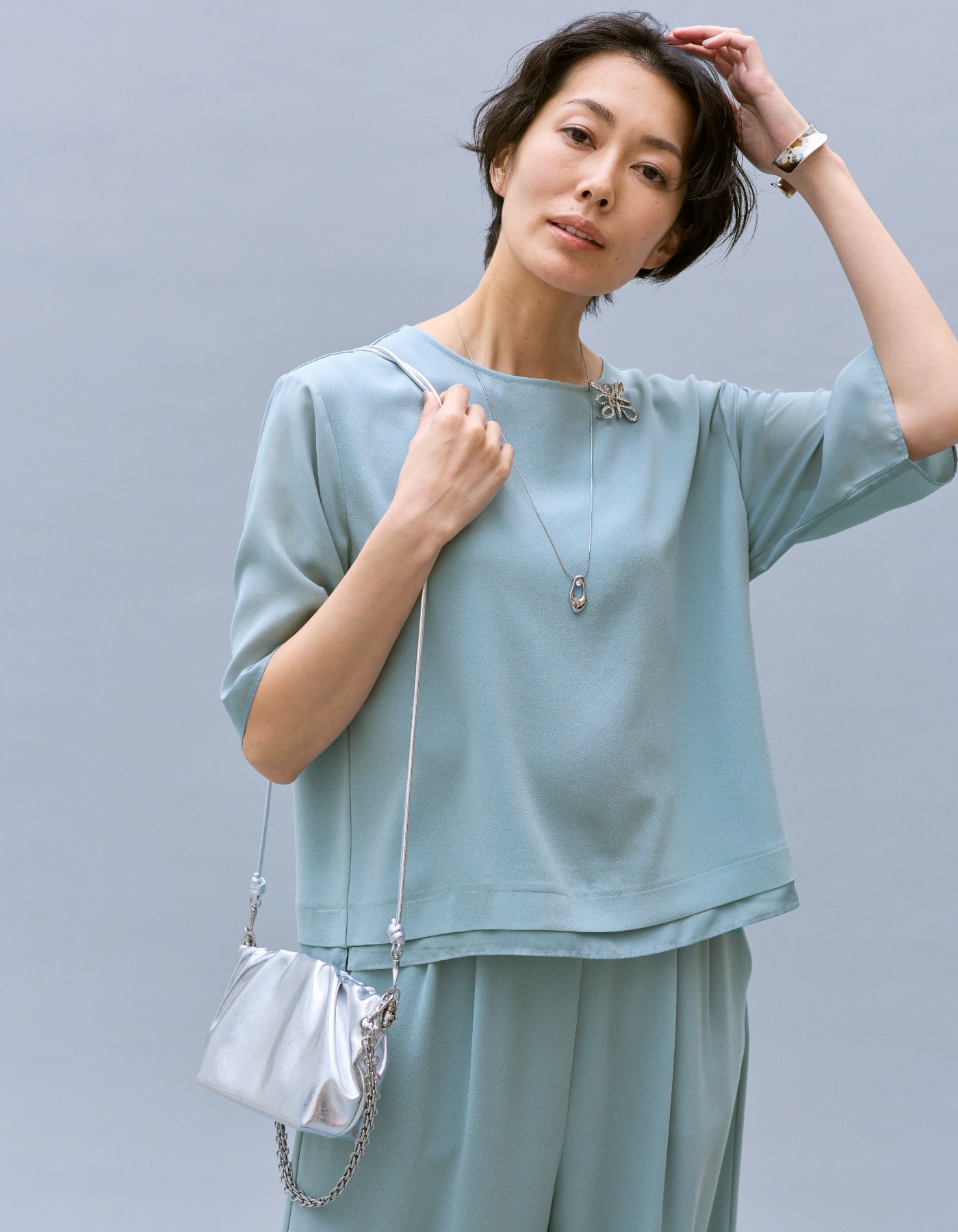 Tブラウスとイージーパンツはストレッチが効いたコンフォートな素材感ながらも自然な落ち感がエレガント。ドレープが作る陰影がこなれた涼感を演出してくれます。